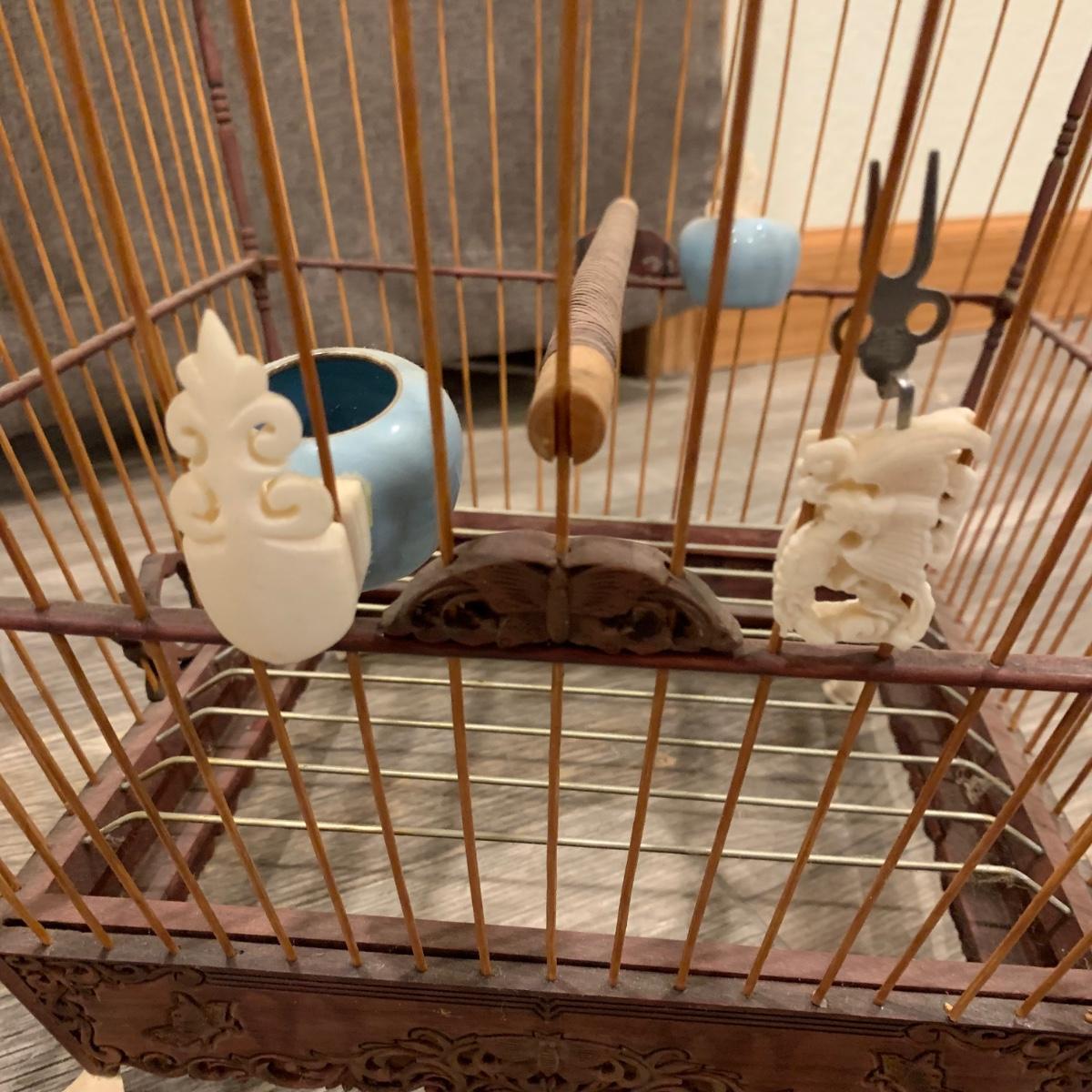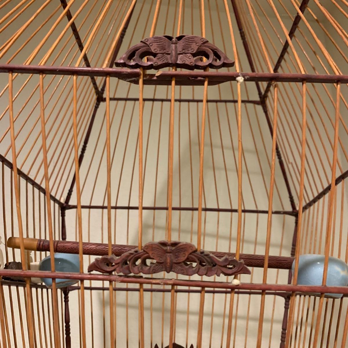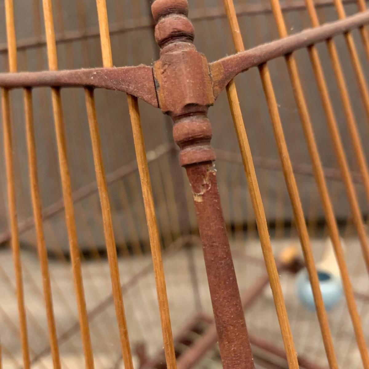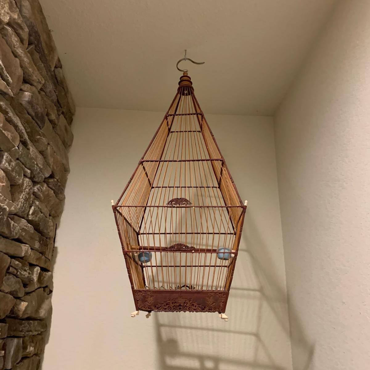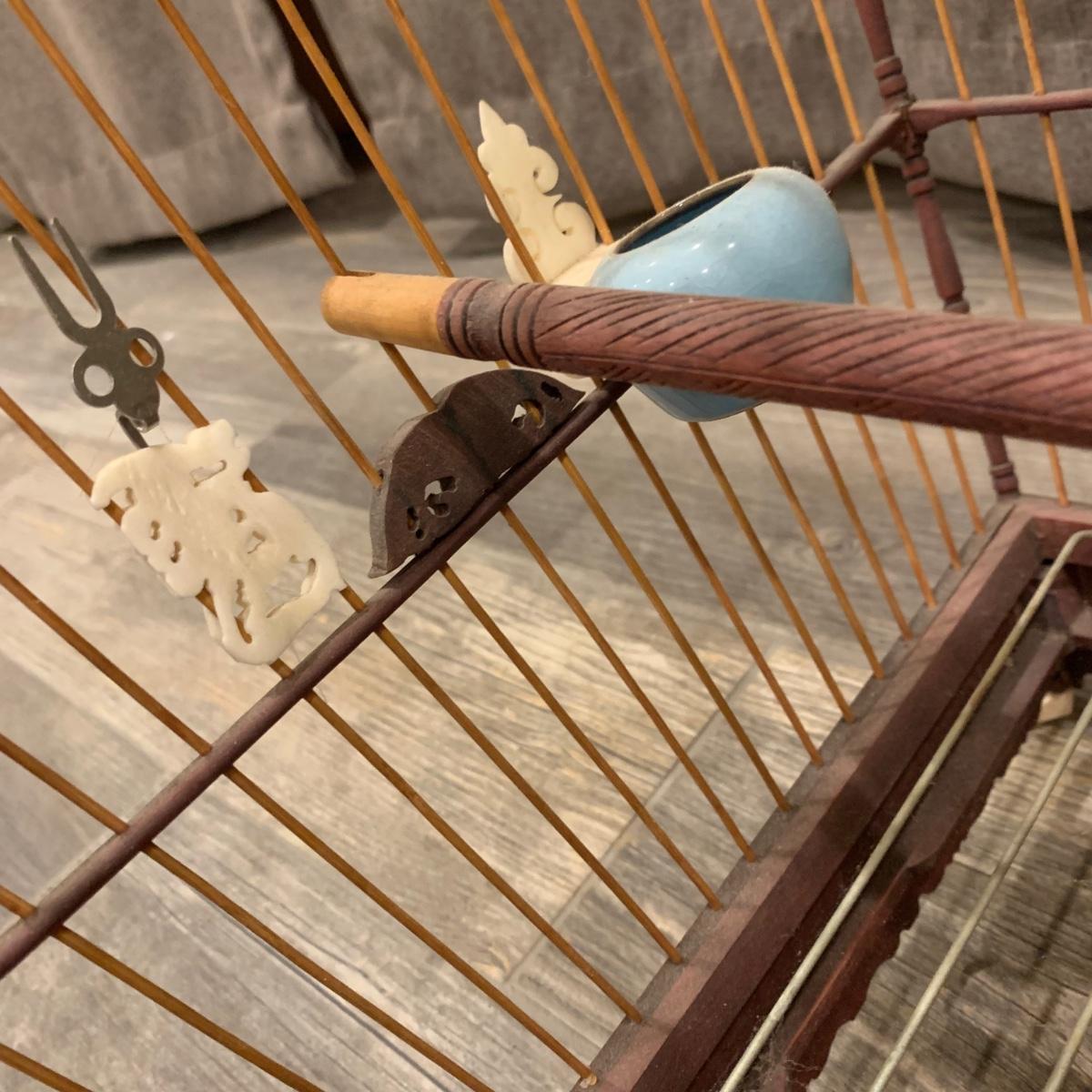 Very lovely ornate wooden birdcage. Cage has beautiful carved details. It has a perch inside and little ceramic water dishes. There is one small door to open for the bird. A metal hook is attached to the top. At its widest point the birdcage measures 15” sq. x 36” tall. The birdcage is very delicate. There are some small breaks apparent, many of which have been repaired by glue, but some parts are currently loose.