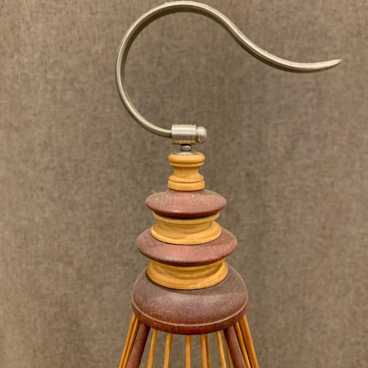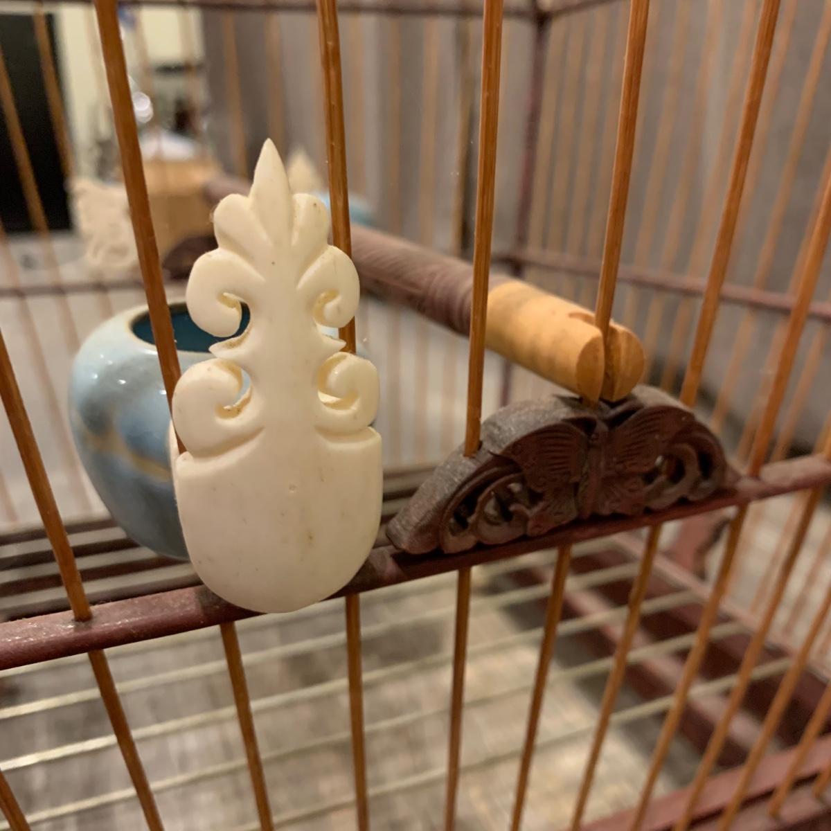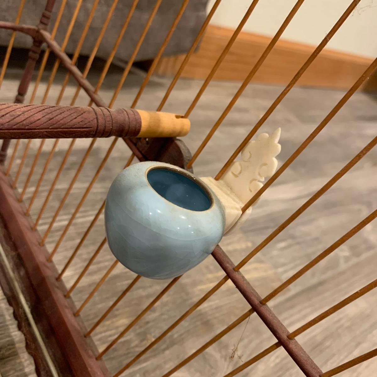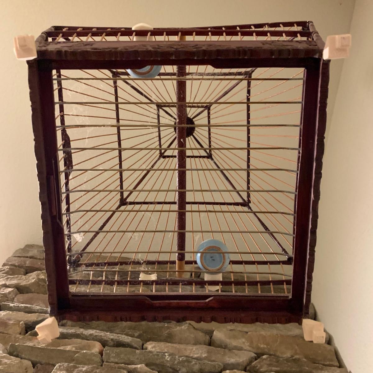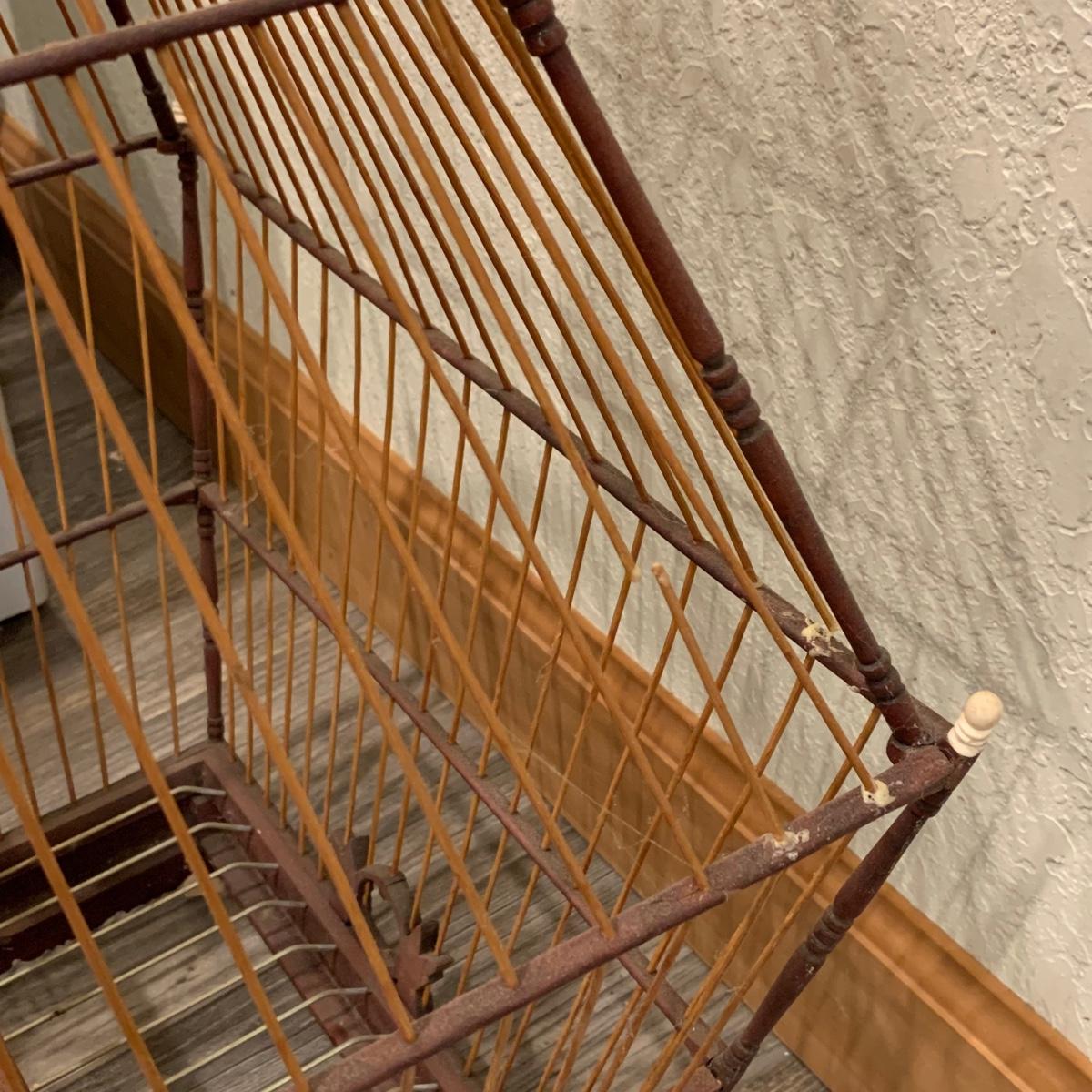 Very lovely ornate wooden birdcage. Cage has beautiful carved details. It has a perch inside and little ceramic water dishes. There is one small door to open for the bird. A metal hook is attached to the top. At its widest point the birdcage measures 15” sq. x 36” tall. The birdcage is very delicate. There are some small breaks apparent, many of which have been repaired by glue, but some parts are currently loose.