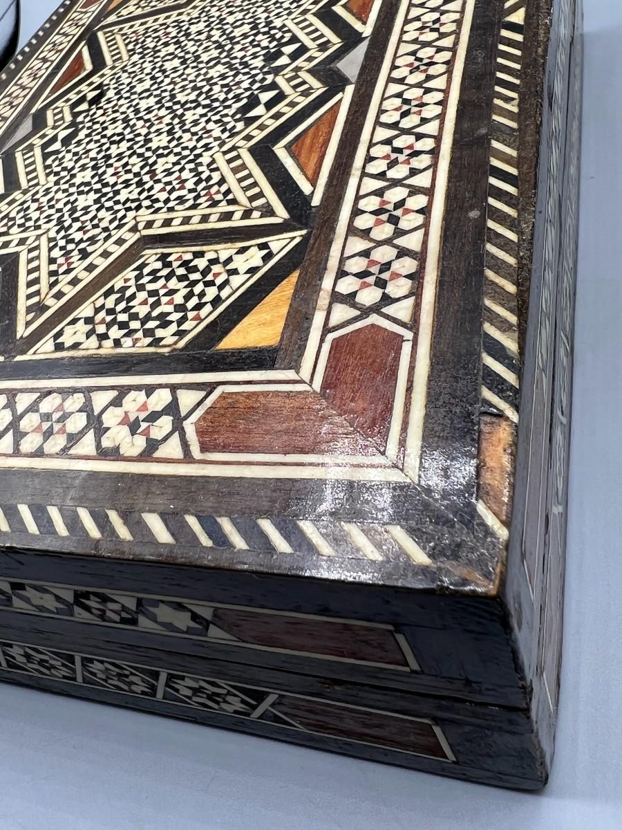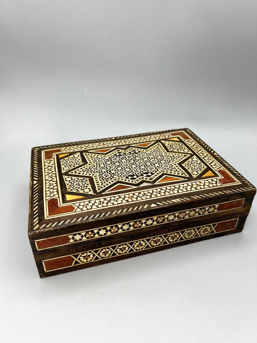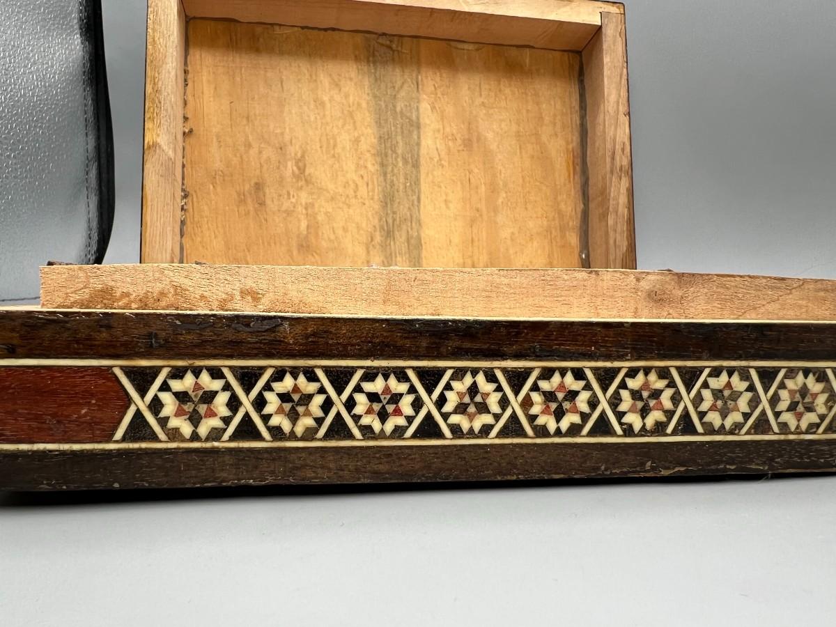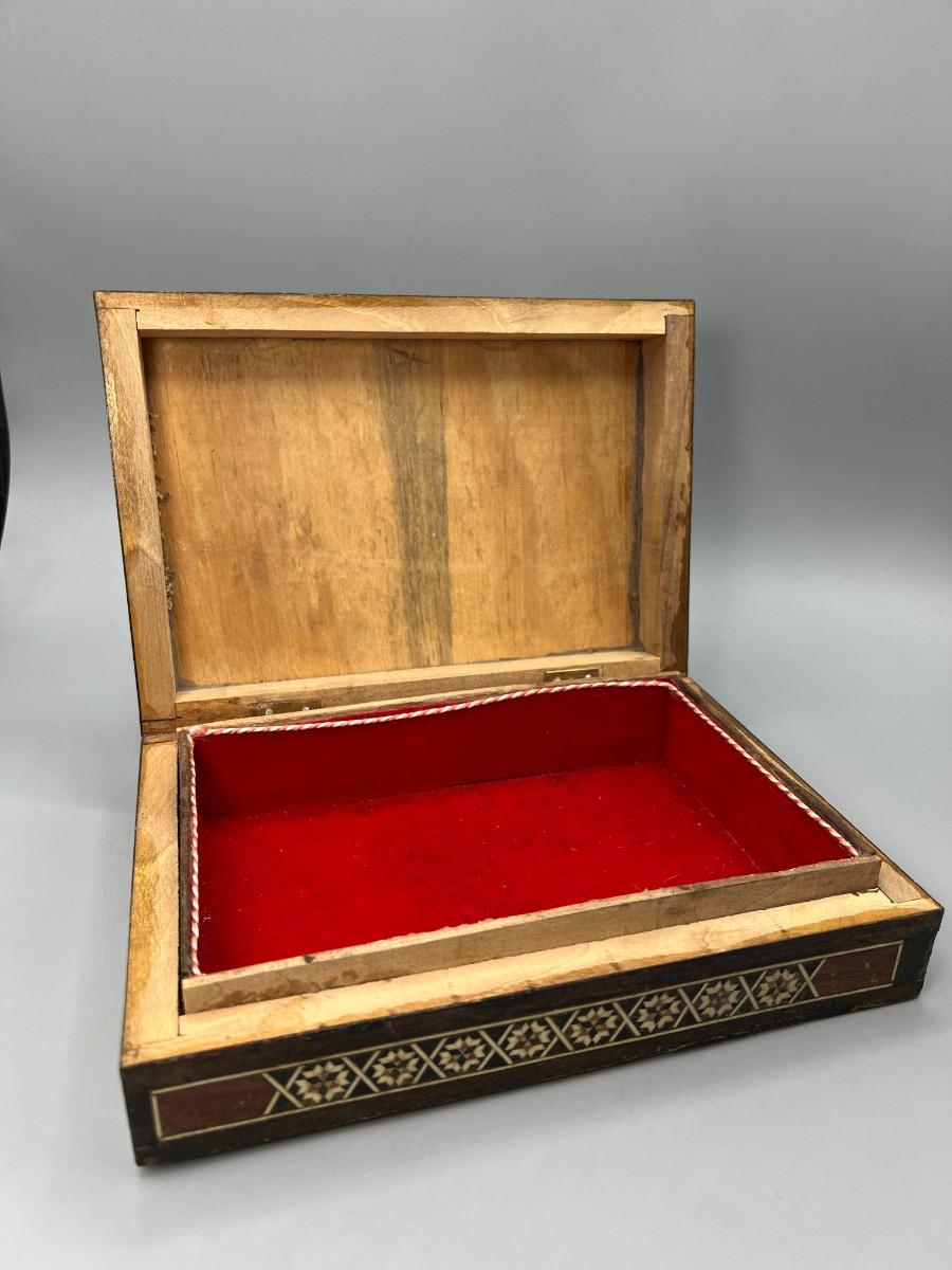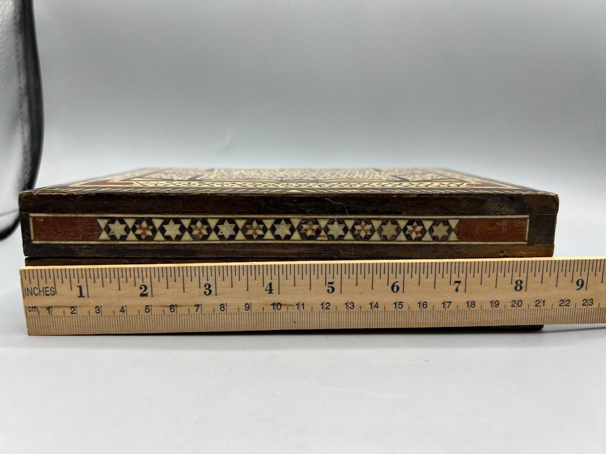 Ornately Decorated Inlaid Wood Jewelry Trinket Cigar Box. In vintage condition, light wear. About 8" size.