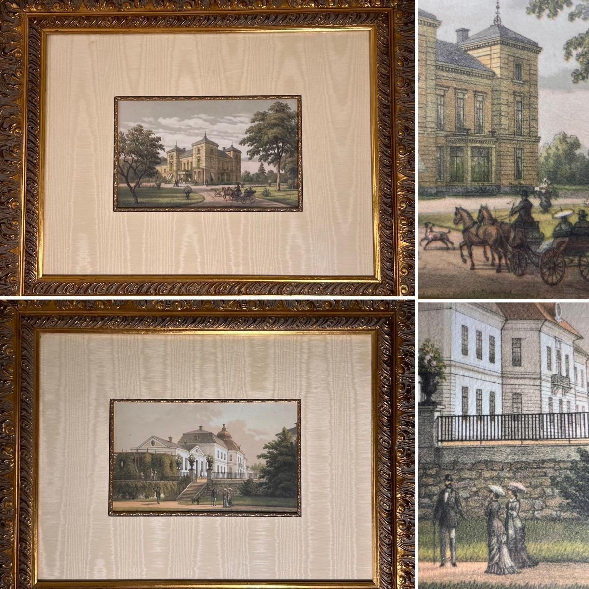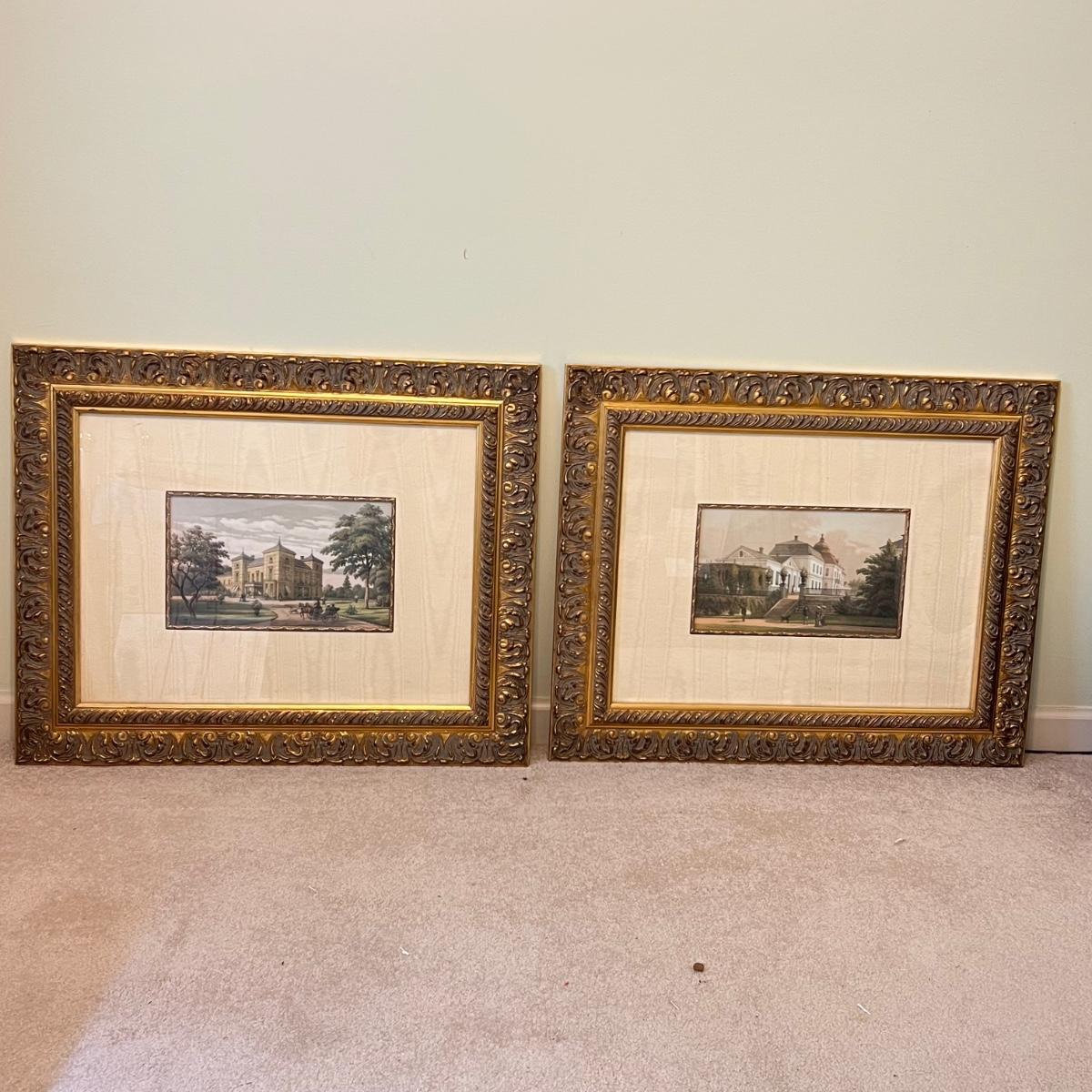 Two large prints of stately homes are luxuriously matted with a taffeta mat and mounted in matching ornate gilded wood frames. Prints are under glass. Frames are high quality and quite heavy.