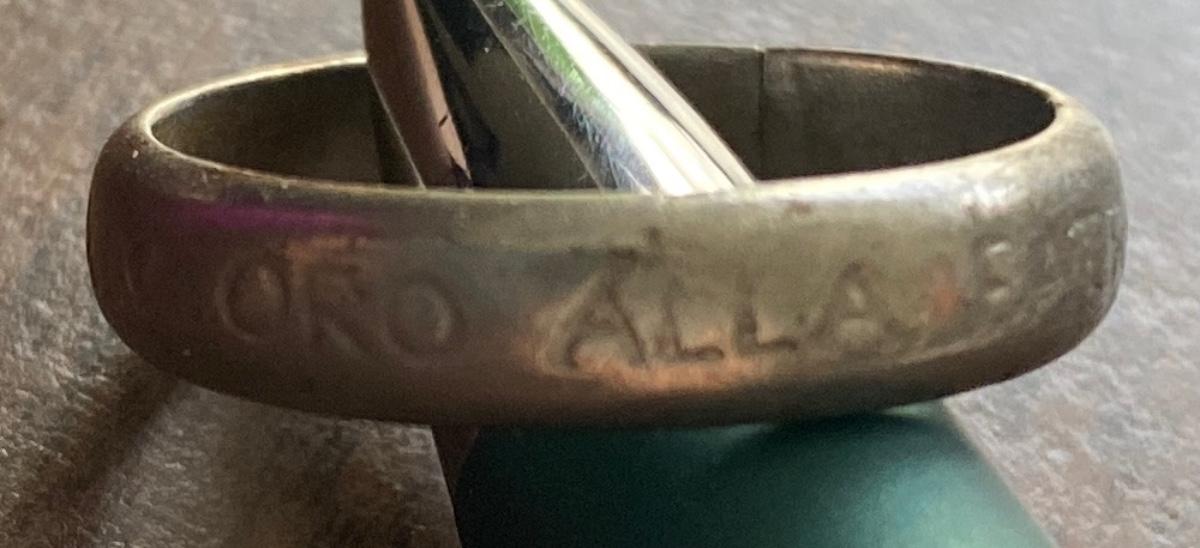 Oro alla Patria ("Gold to the Fatherland") was a 1935 Italian fascist campaign that asked Italians to donate their gold assets to fundraise for their homeland. Those who donated their gold wedding band received a steel replacement from Mussolini commemorating their contribution. Faced with League of Nations sanctions for its Second Italo-Ethiopian War, the Fascist government collected 250,000 wedding rings from Rome and 180,000 from Milan, amid other personal gold jewelry and objects totaling 33,600 kilograms of gold and 93,400 of silver. In acts of sacrifice for the state, prominent figures donated items of great symbolic value: the Queen's wedding ring, the Prince's collar of the Annunciation, the dramatist Luigi Pirandello's Nobel Prize, Guglielmo Marconi's senator medal, and Mussolini's Rocca delle Caminate castle statue busts.