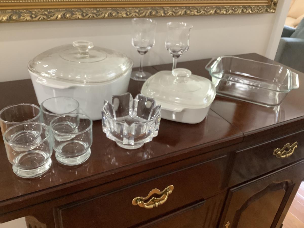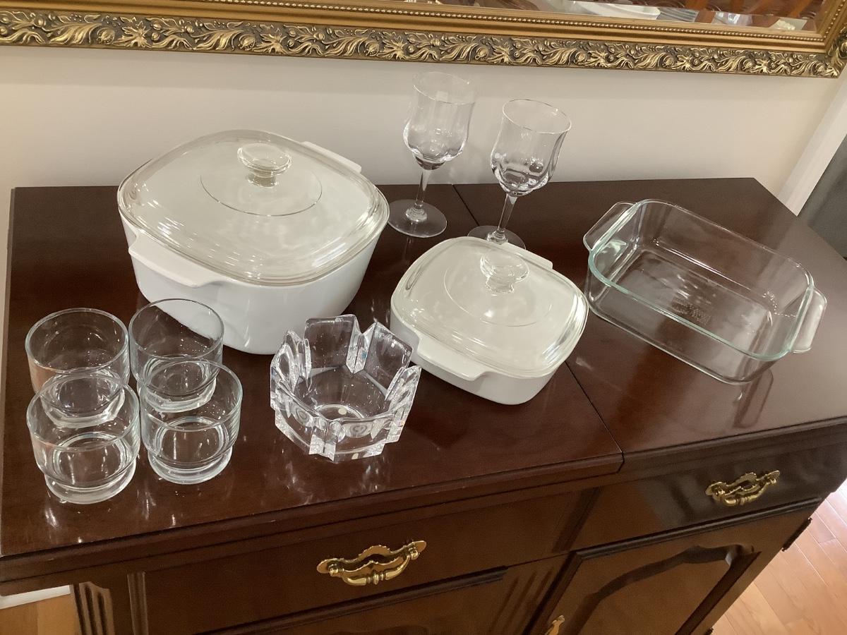 Orrefors bowl signed, 2 square Corningware with lids lot