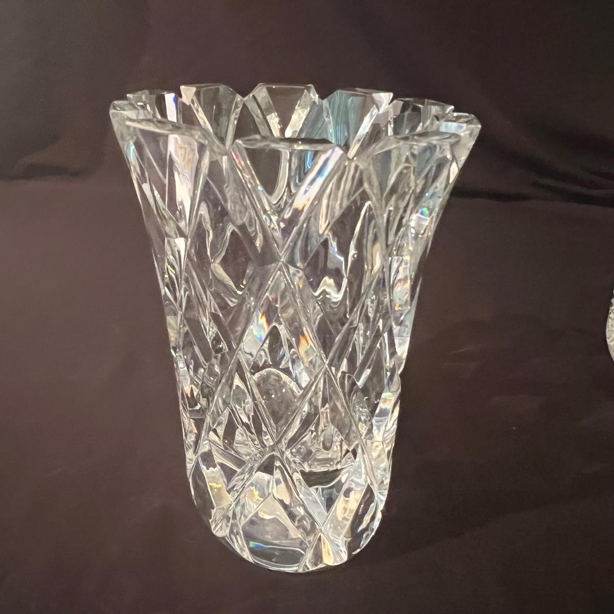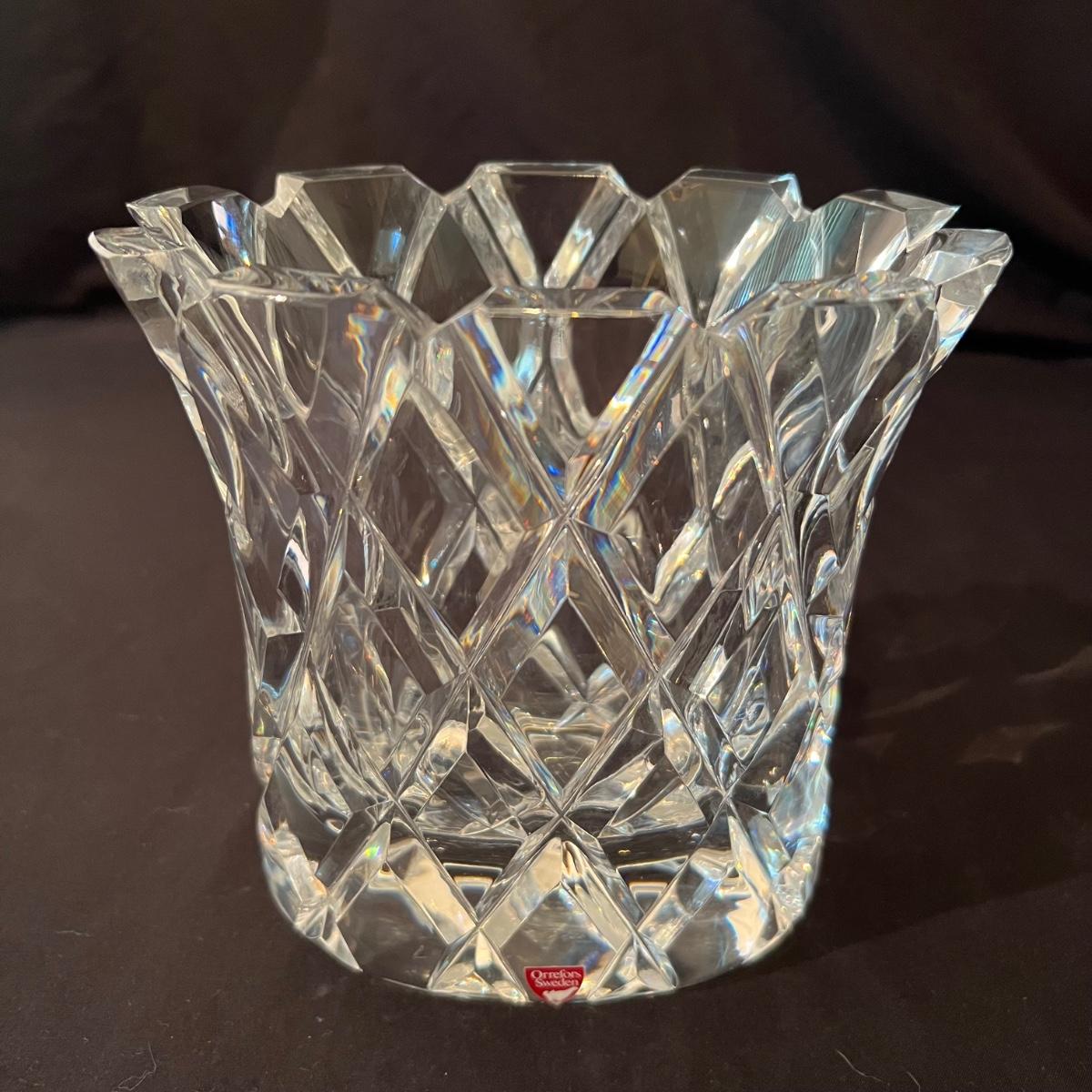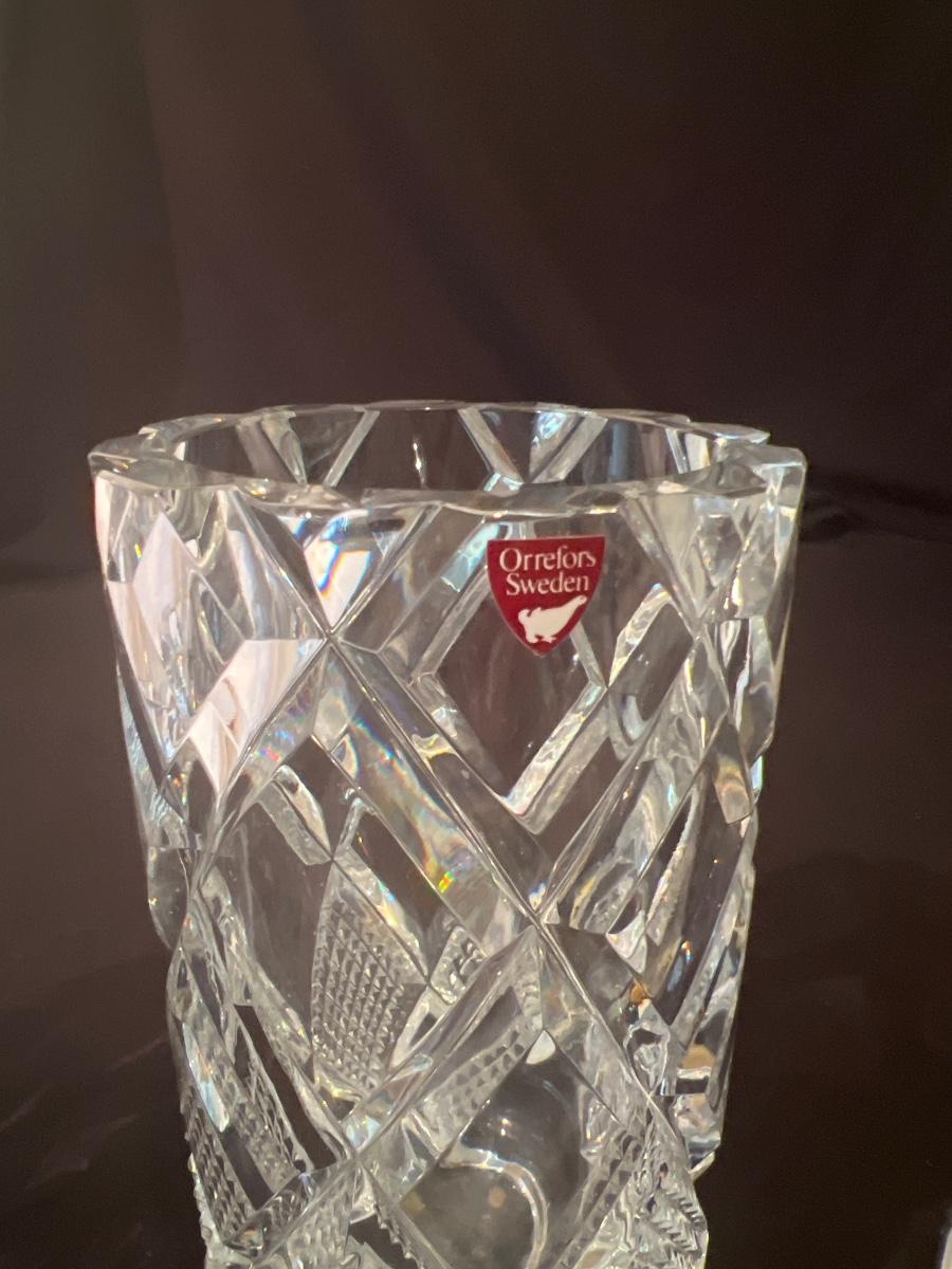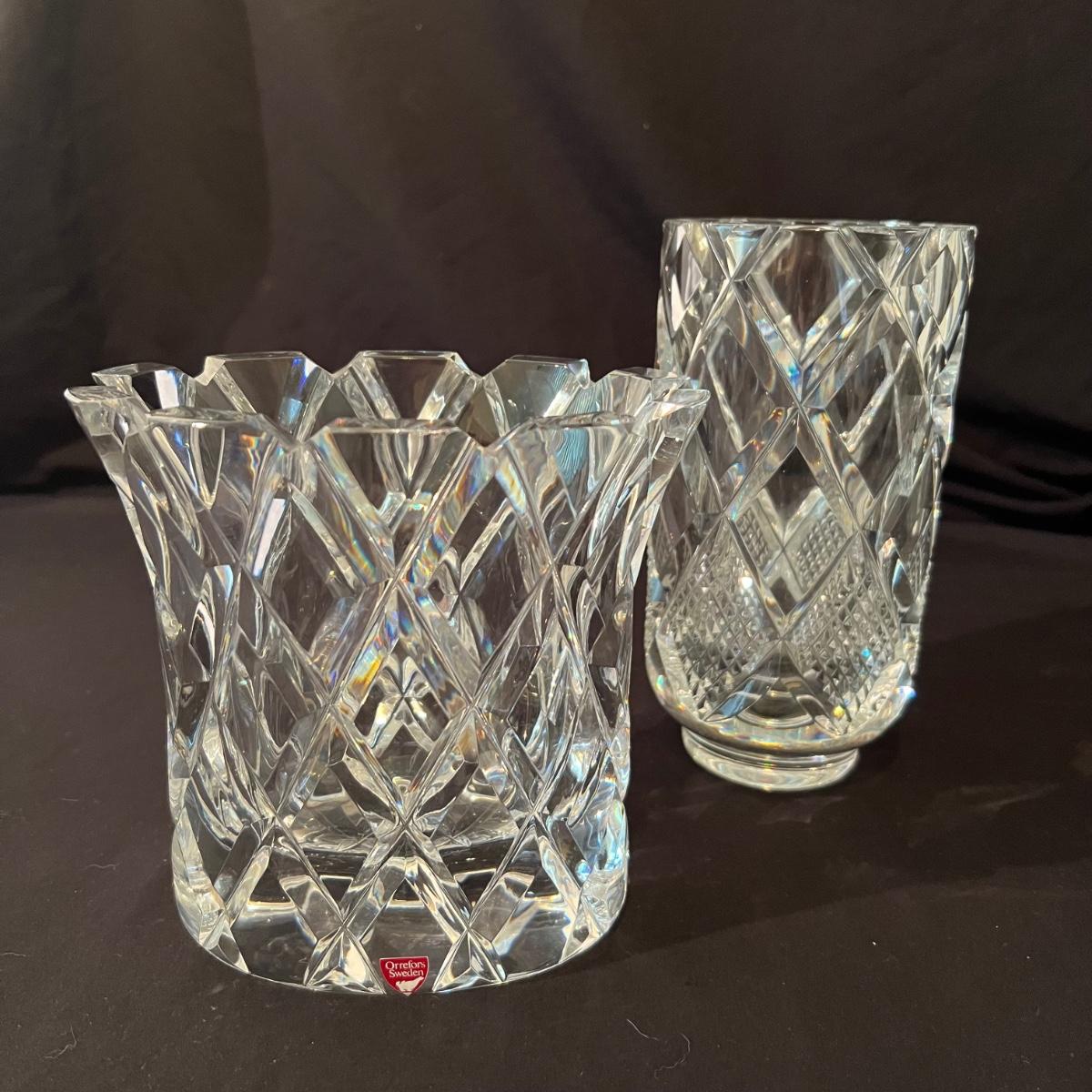 Two heavy crystal vases by Orrefors. Both have stickers and one also has Orrefors etched name. Taller vase measures 4”D x 8”H.