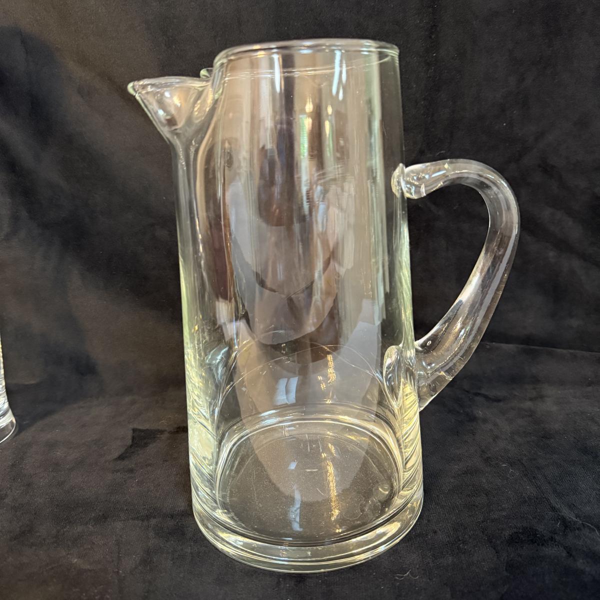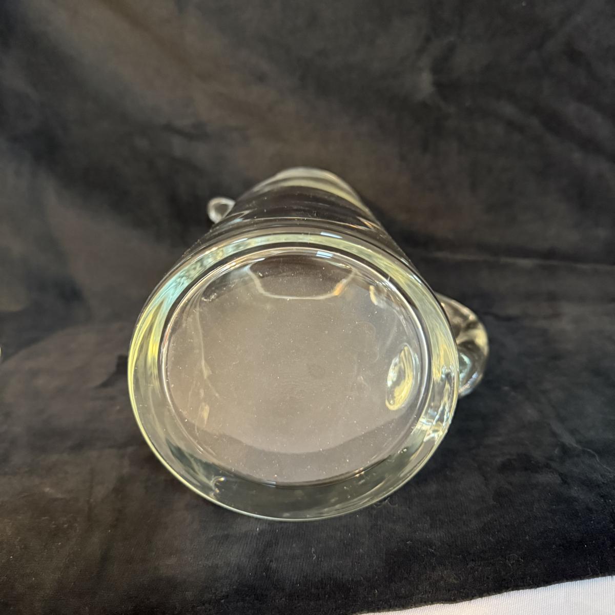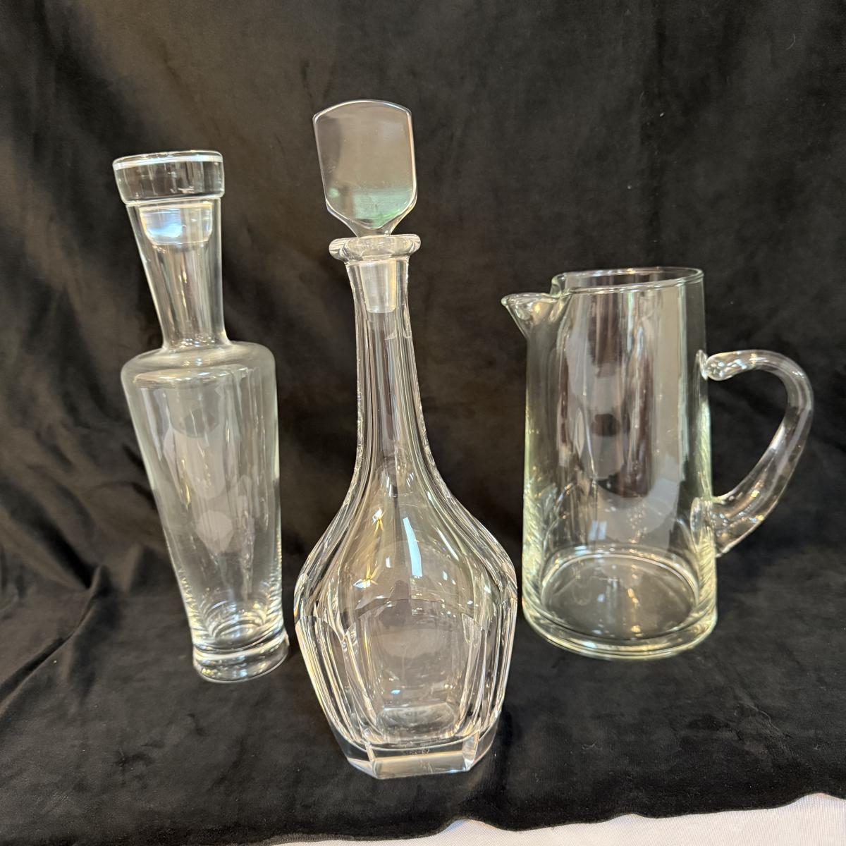 This lot contains a stunning Orrefors crystal decanter. This item measures 3” x 2” at the base and stands 13”H. Also included is another glass slender decanter and a glass pitcher. The pitcher measures 4.75”D at the base and stands 9”H. Shipping available.