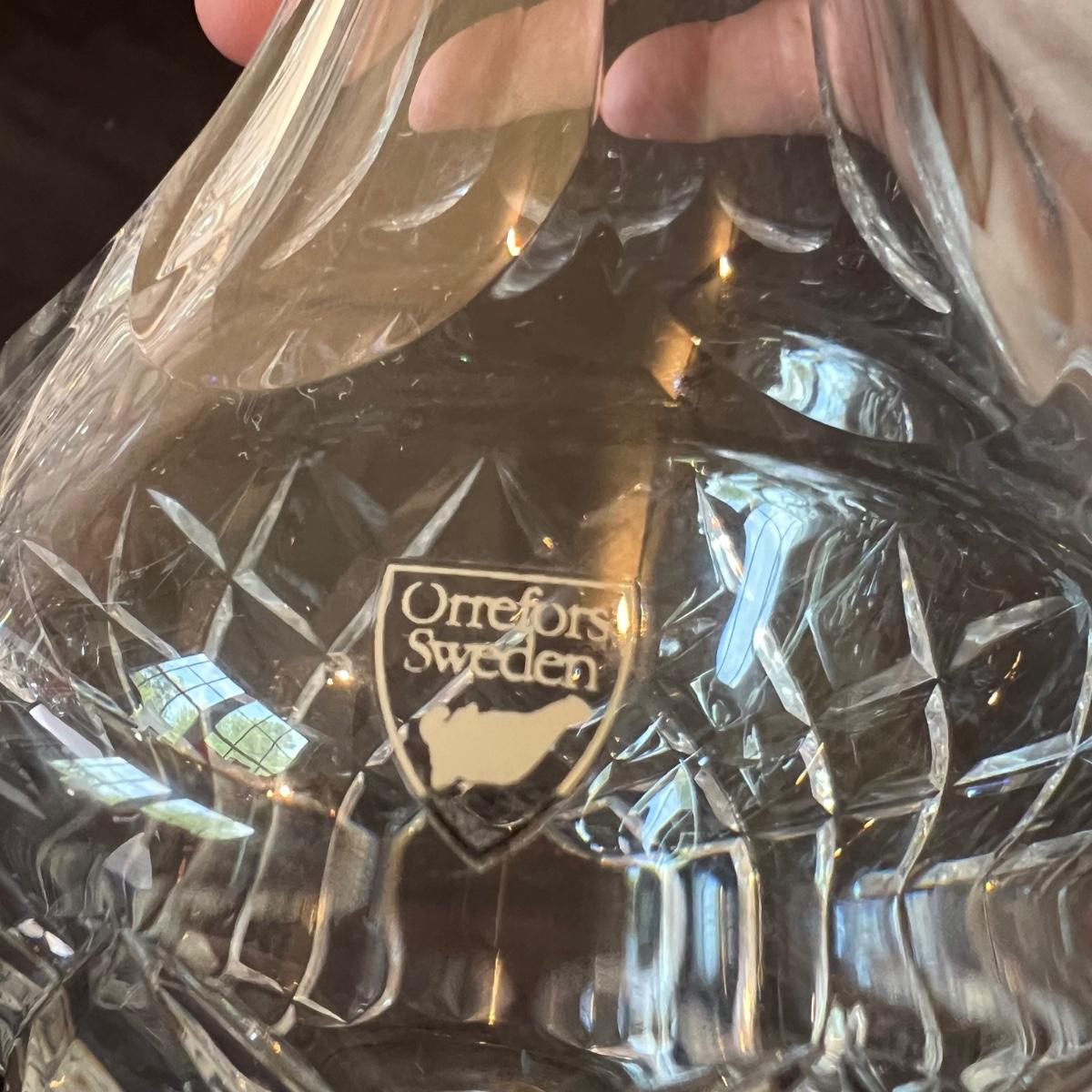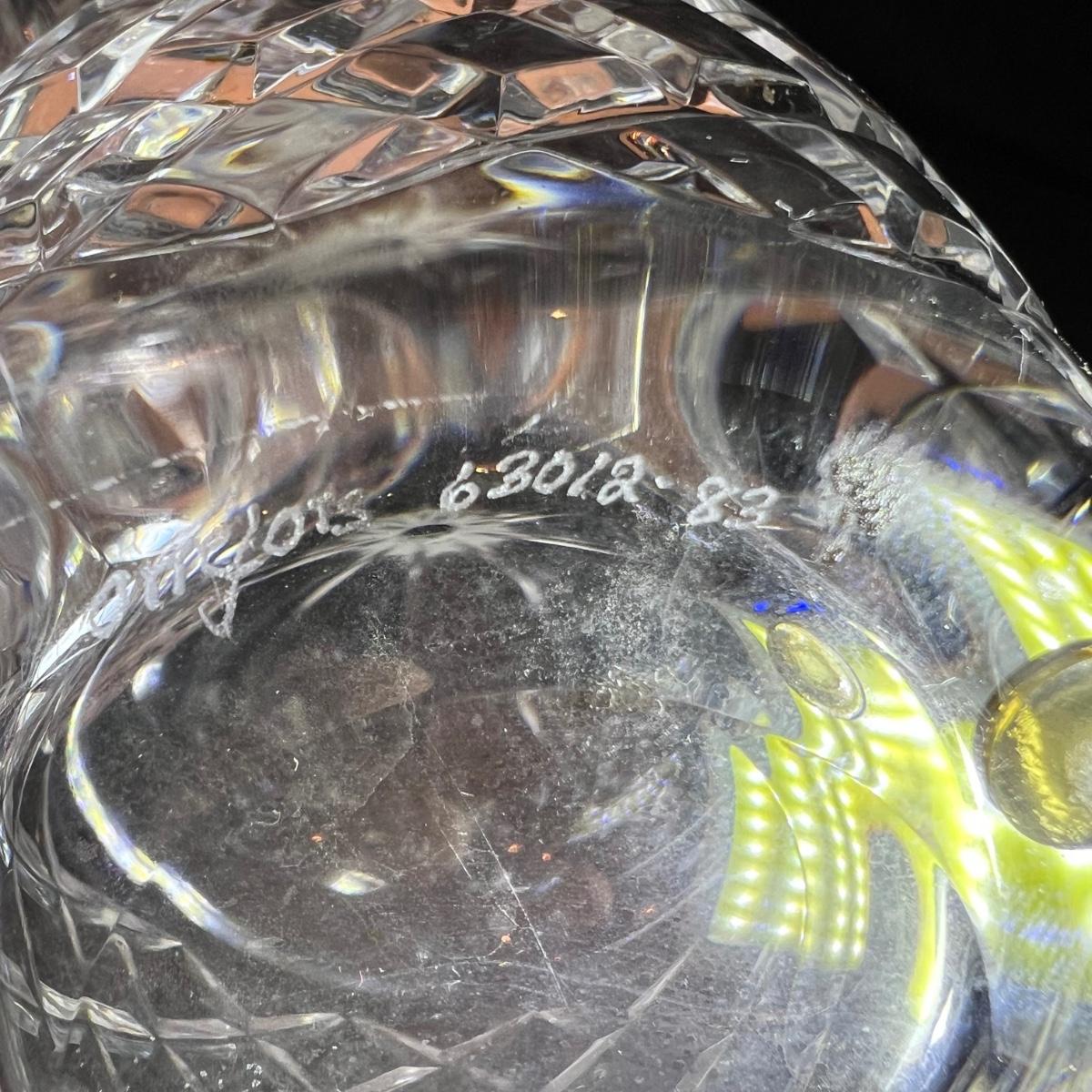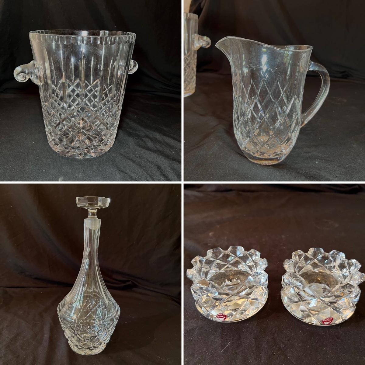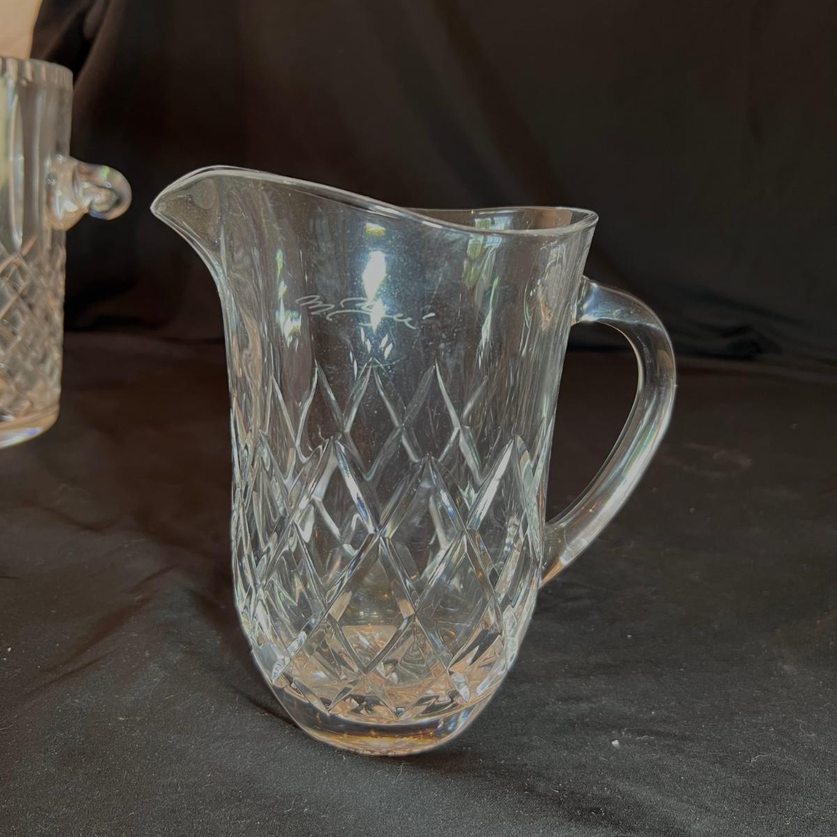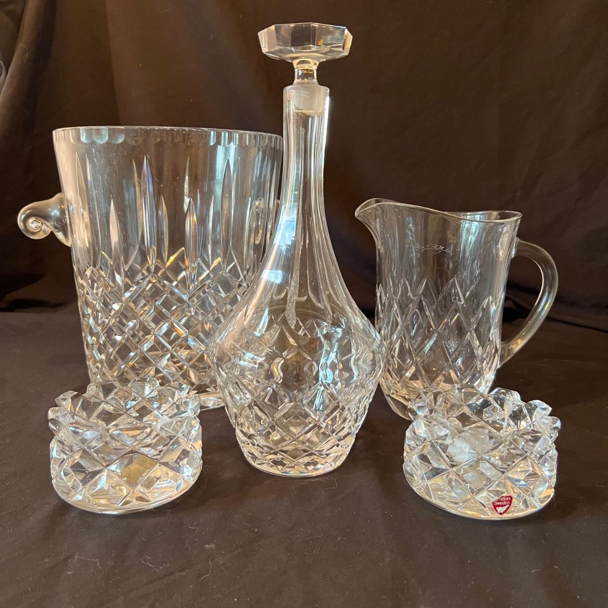 Five items in this crystal glass assortment. The decanter and matching pair of taper candle holders all have Orrefors stickers and signatures. No markings on the crystal large ice bucket, but the pitcher does have an etched signature, see image. All pieces have a similar diamond/chevron design.