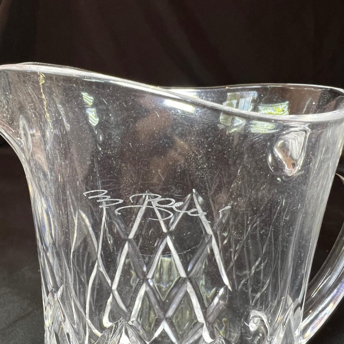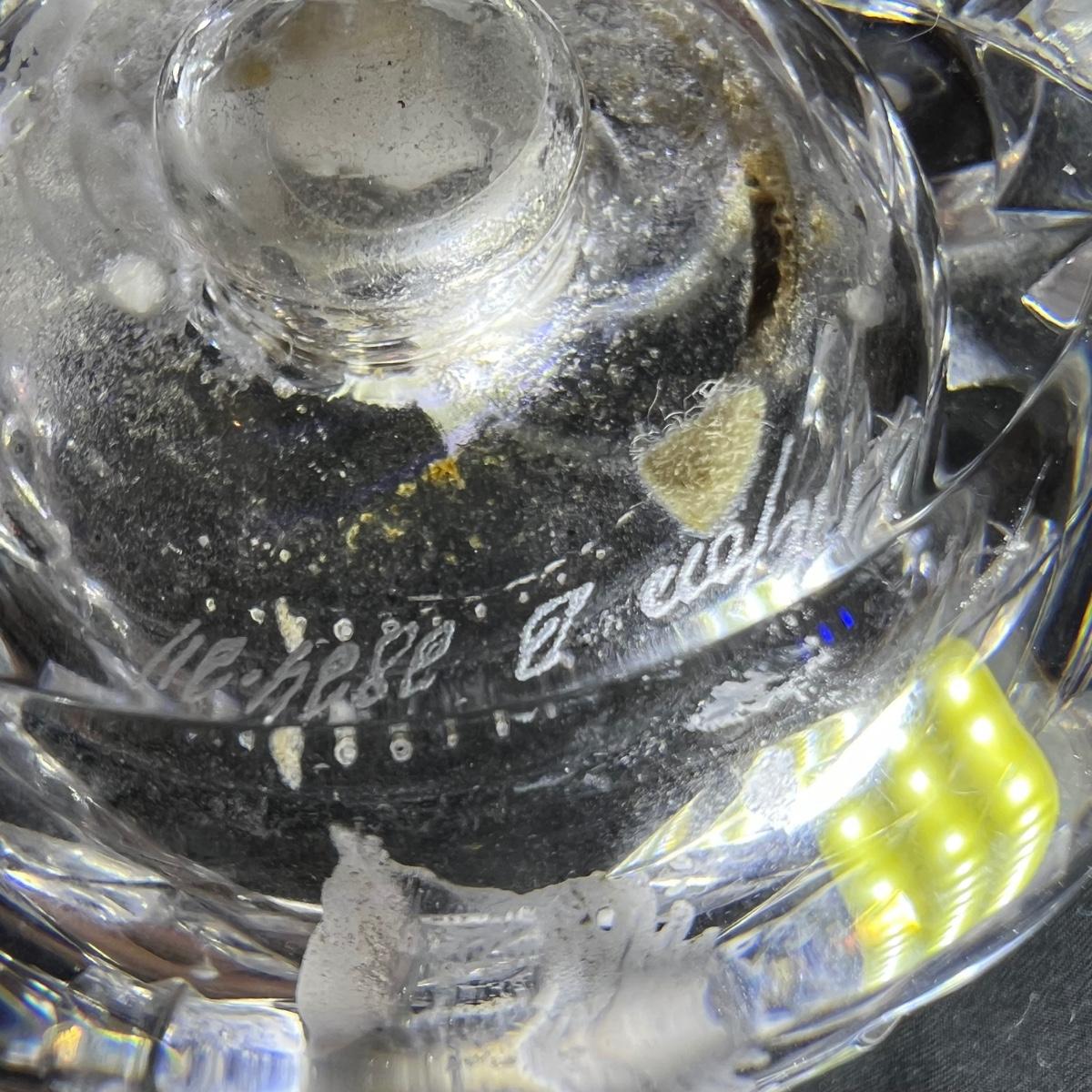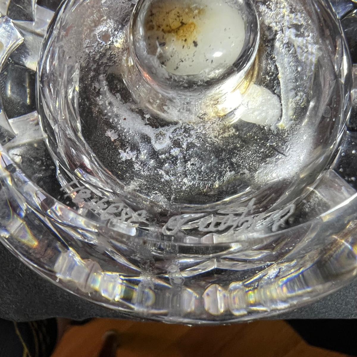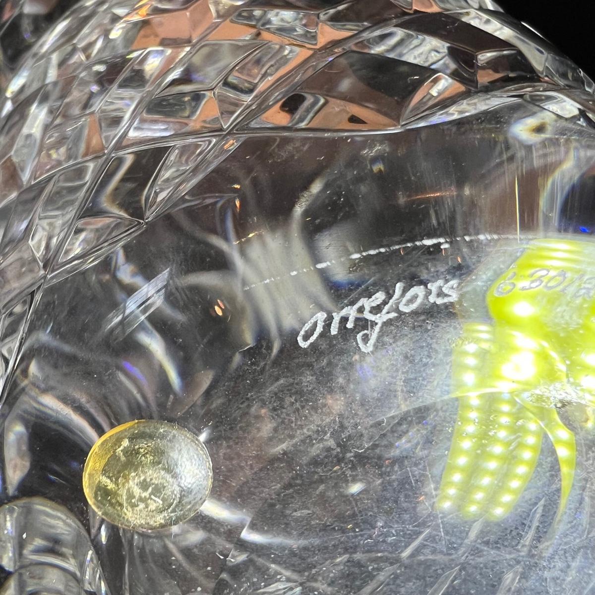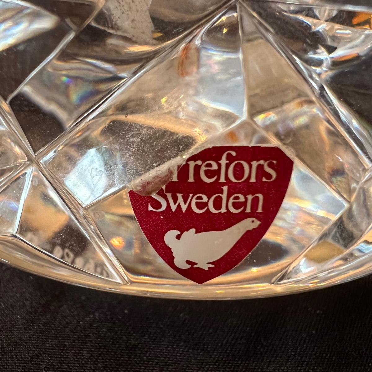 Five items in this crystal glass assortment. The decanter and matching pair of taper candle holders all have Orrefors stickers and signatures. No markings on the crystal large ice bucket, but the pitcher does have an etched signature, see image. All pieces have a similar diamond/chevron design.