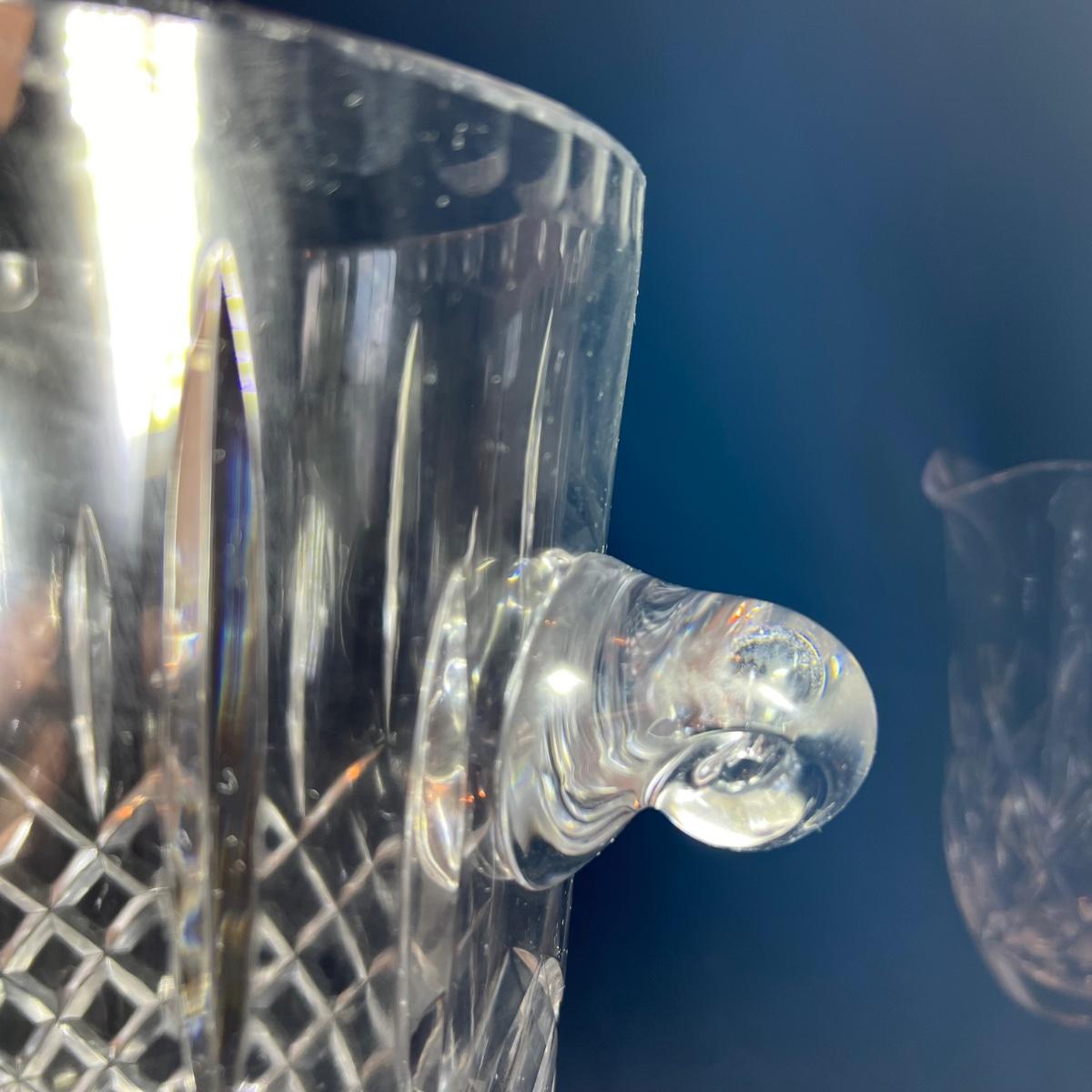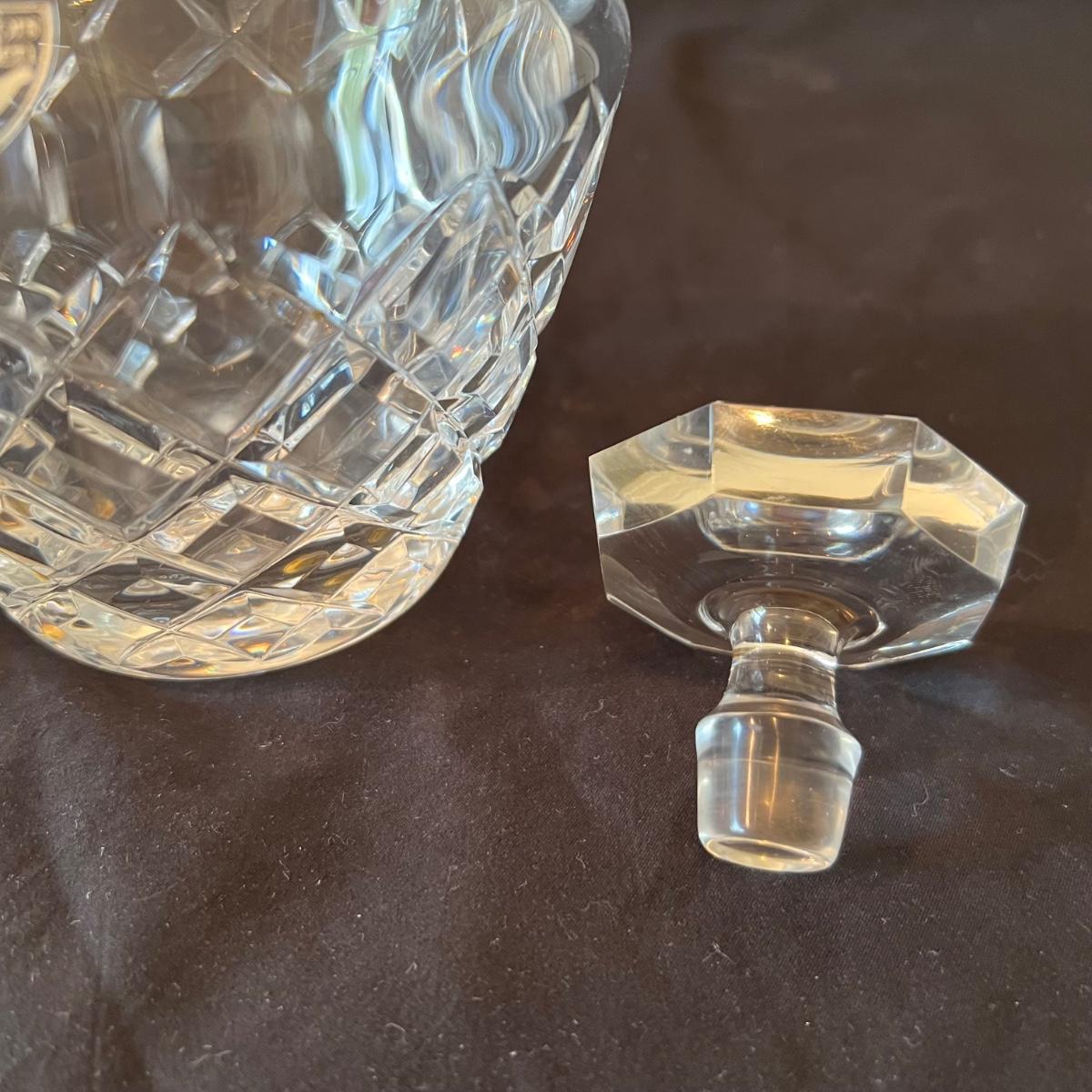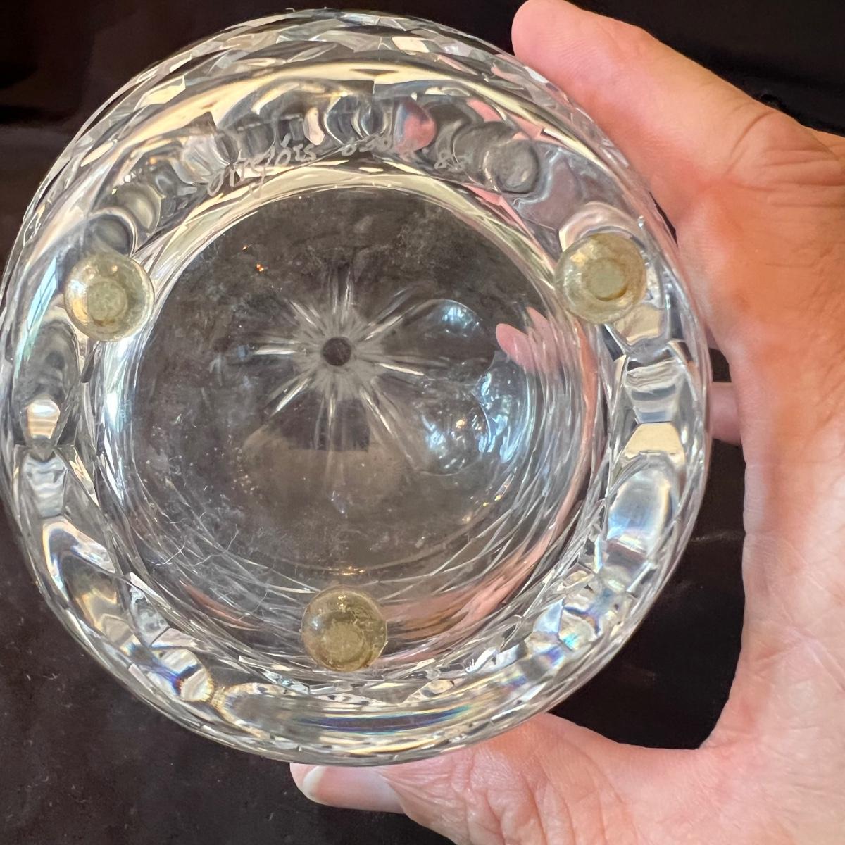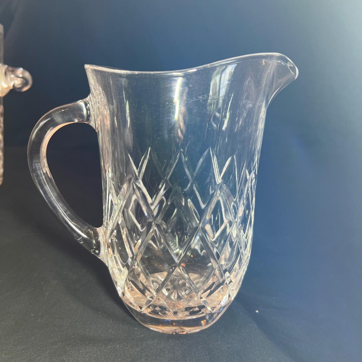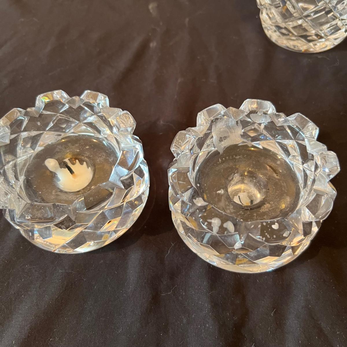 Five items in this crystal glass assortment. The decanter and matching pair of taper candle holders all have Orrefors stickers and signatures. No markings on the crystal large ice bucket, but the pitcher does have an etched signature, see image. All pieces have a similar diamond/chevron design.