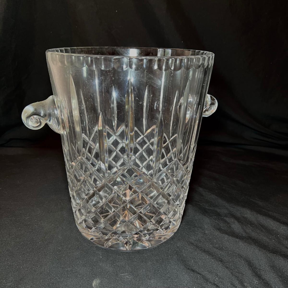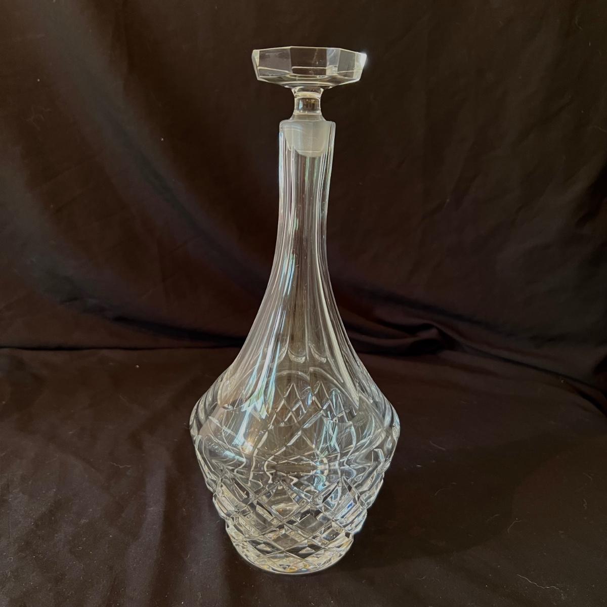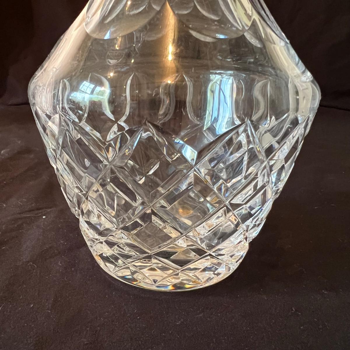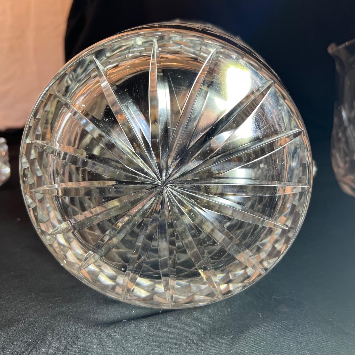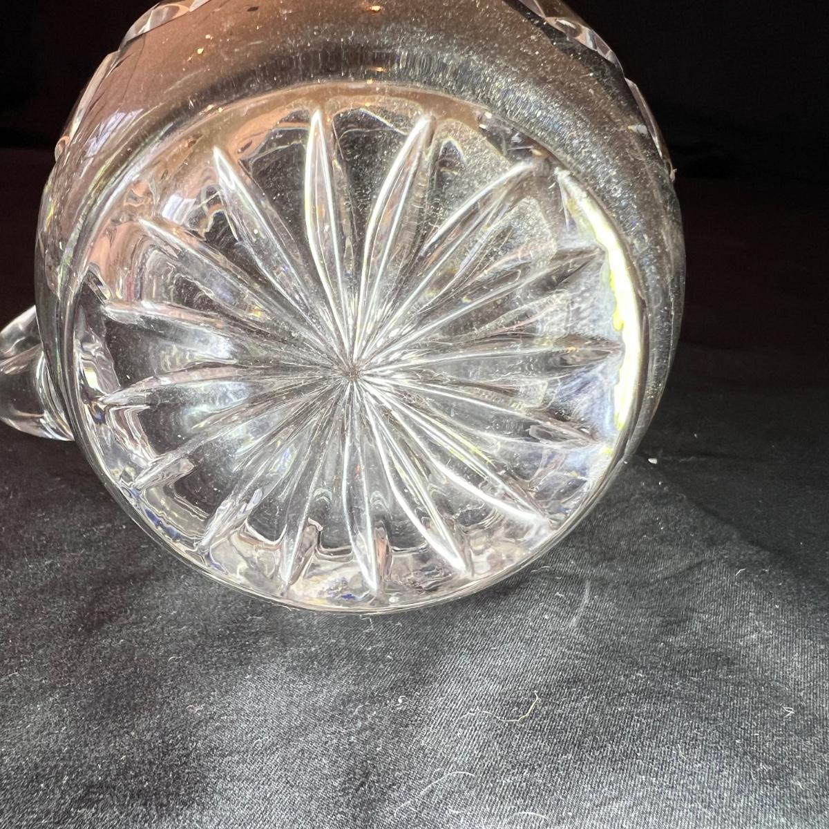 Five items in this crystal glass assortment. The decanter and matching pair of taper candle holders all have Orrefors stickers and signatures. No markings on the crystal large ice bucket, but the pitcher does have an etched signature, see image. All pieces have a similar diamond/chevron design.
