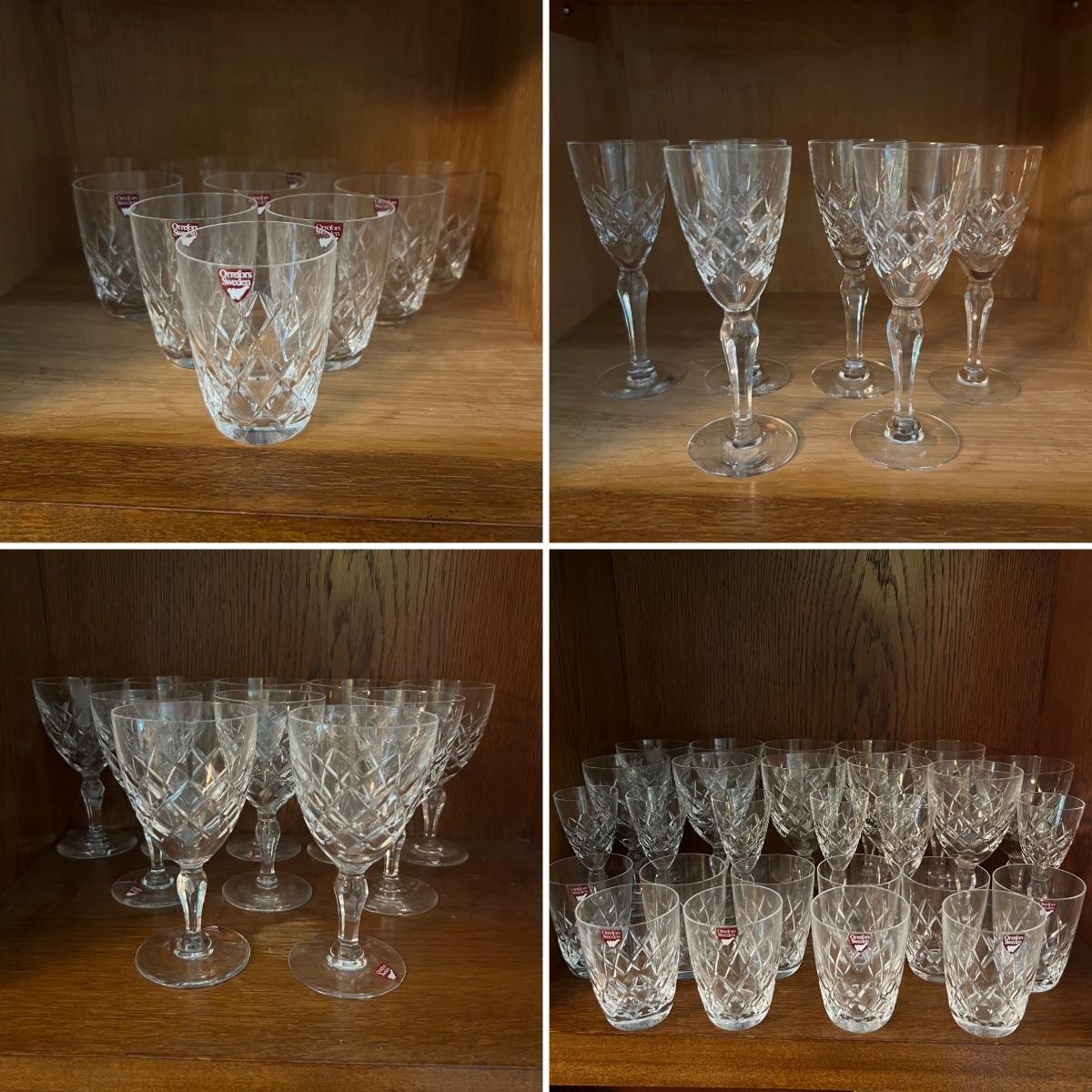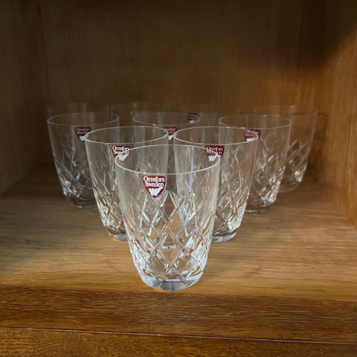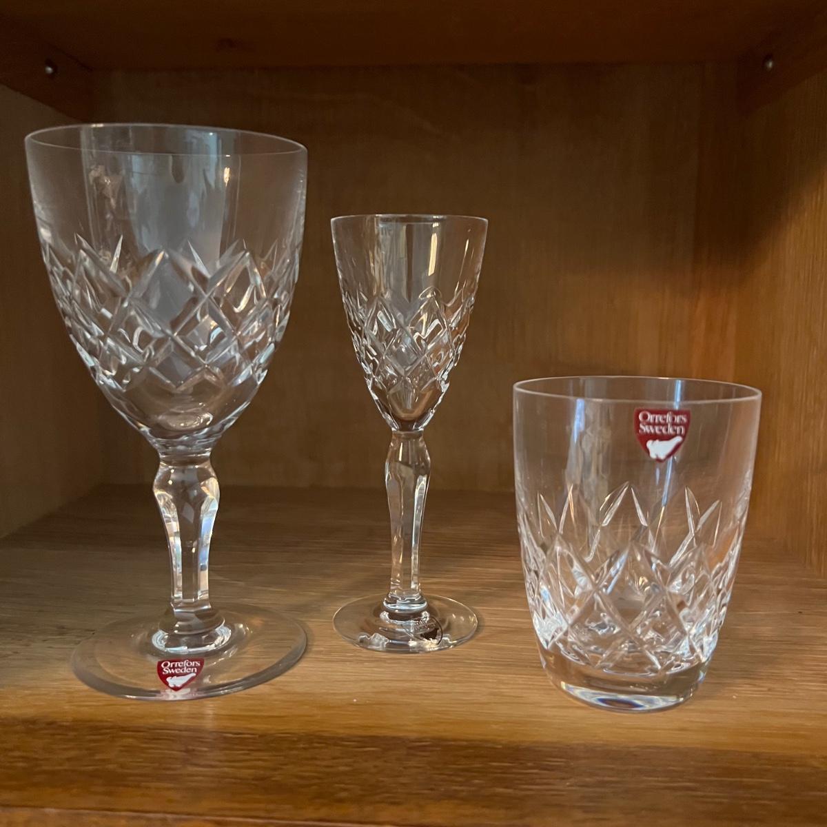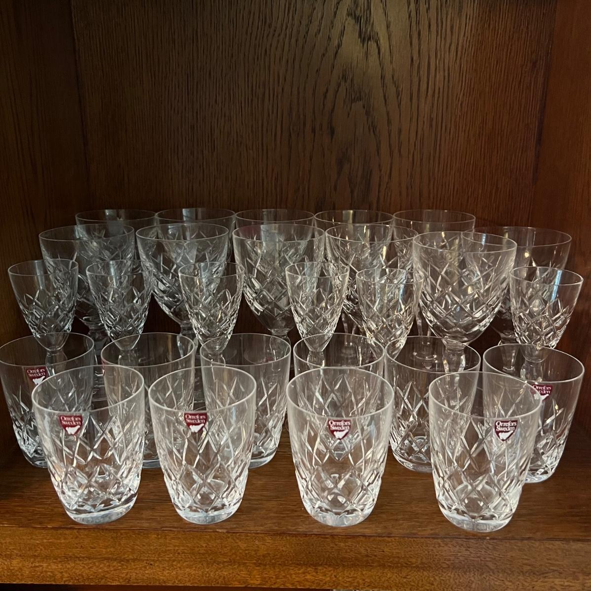 27 Orrefors Crystal drinking glasses in total are included, with 10 each of the stemmed wine glasses and small tumbler glasses. There are 6 of the small stemmed aperitif glasses. Just one larger wine glass with no label but it appears to match this set.