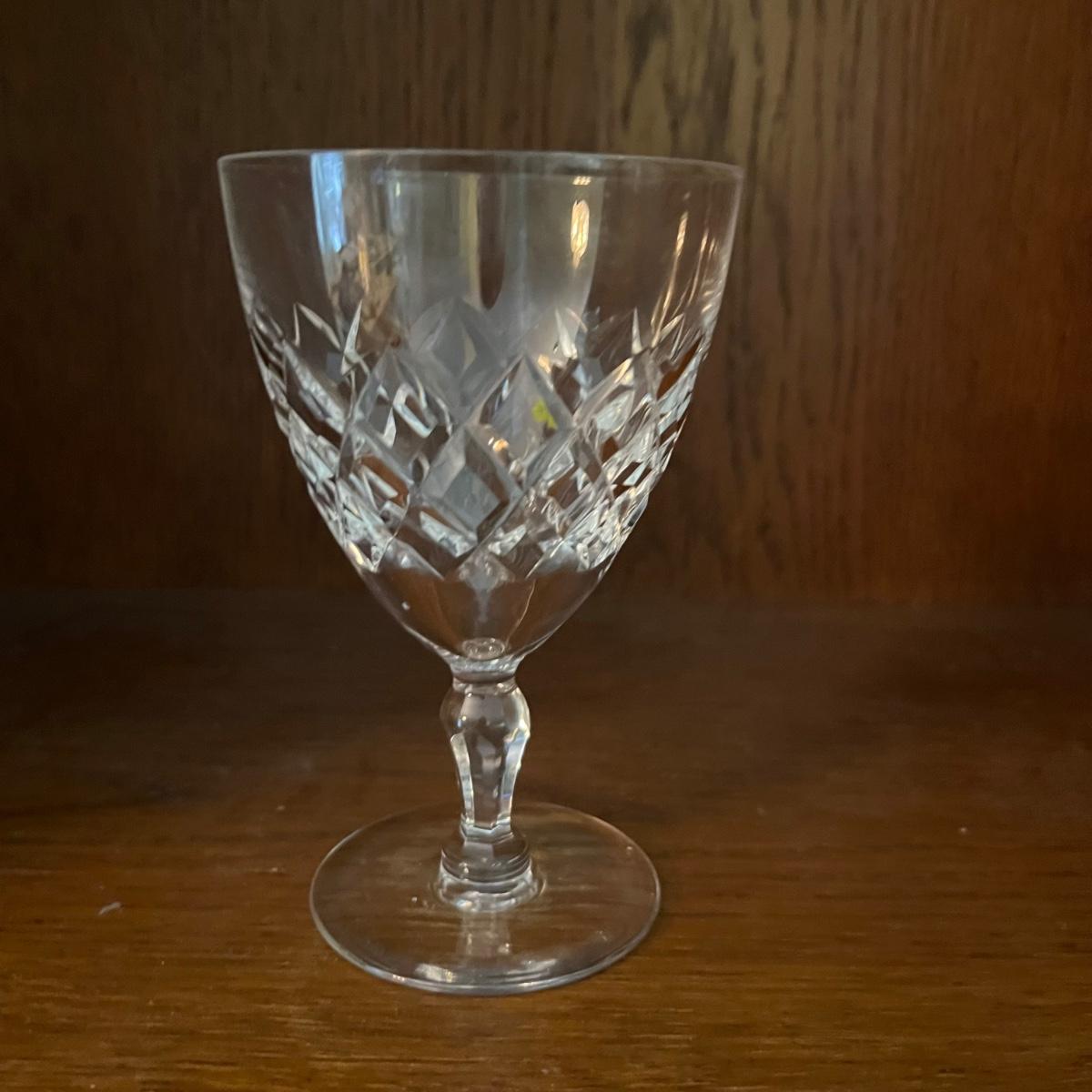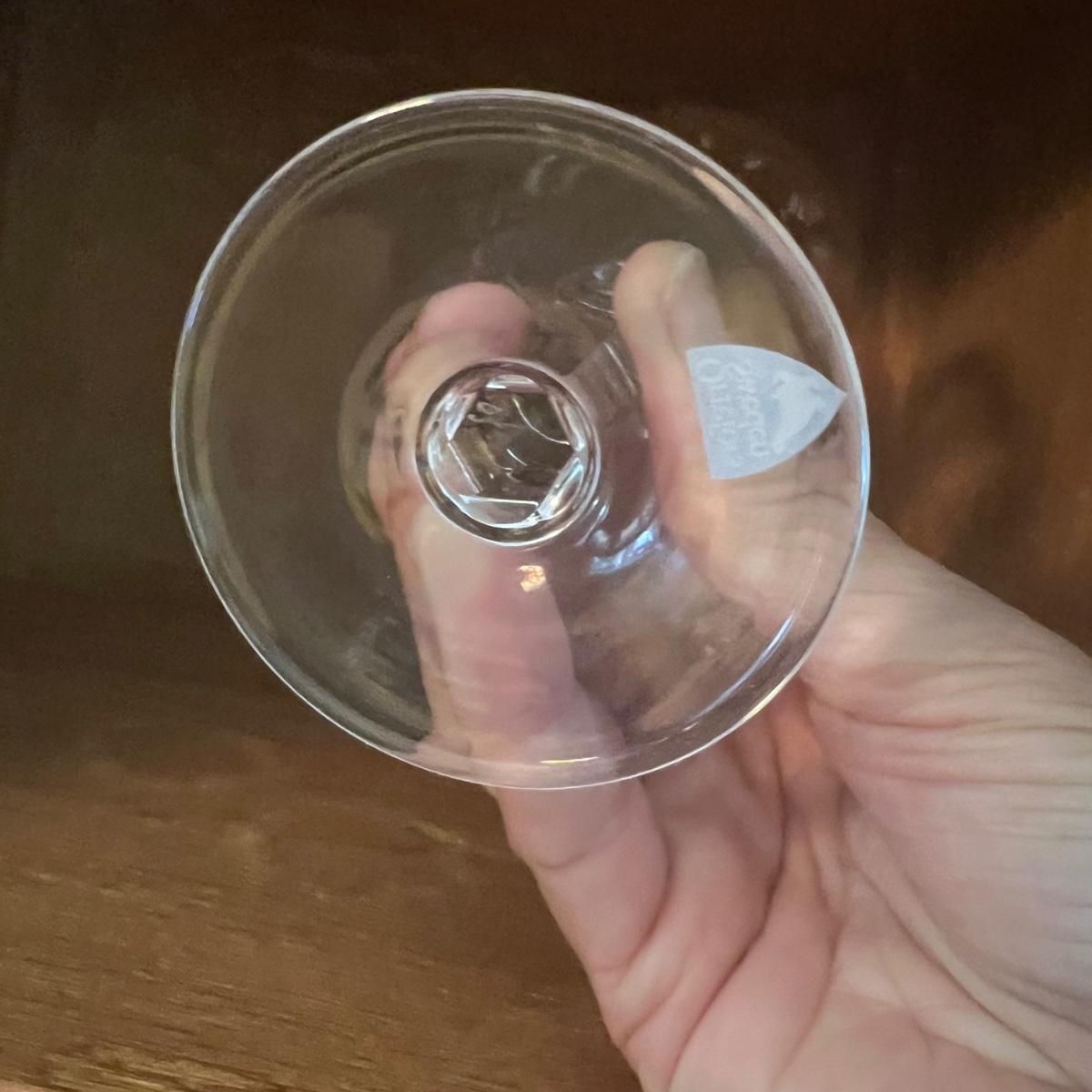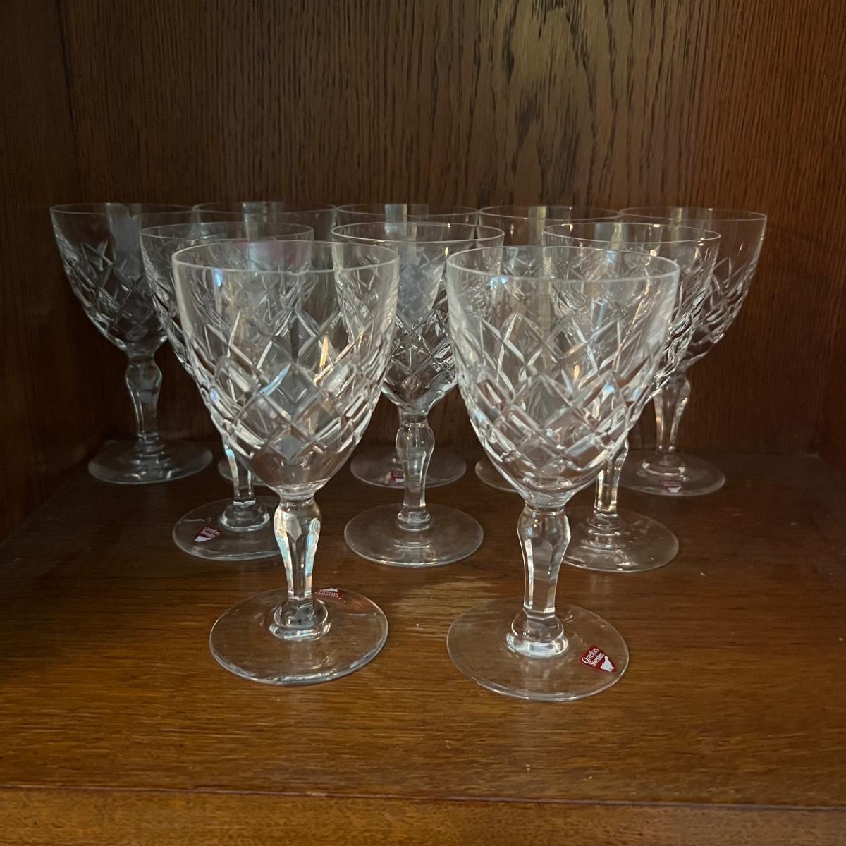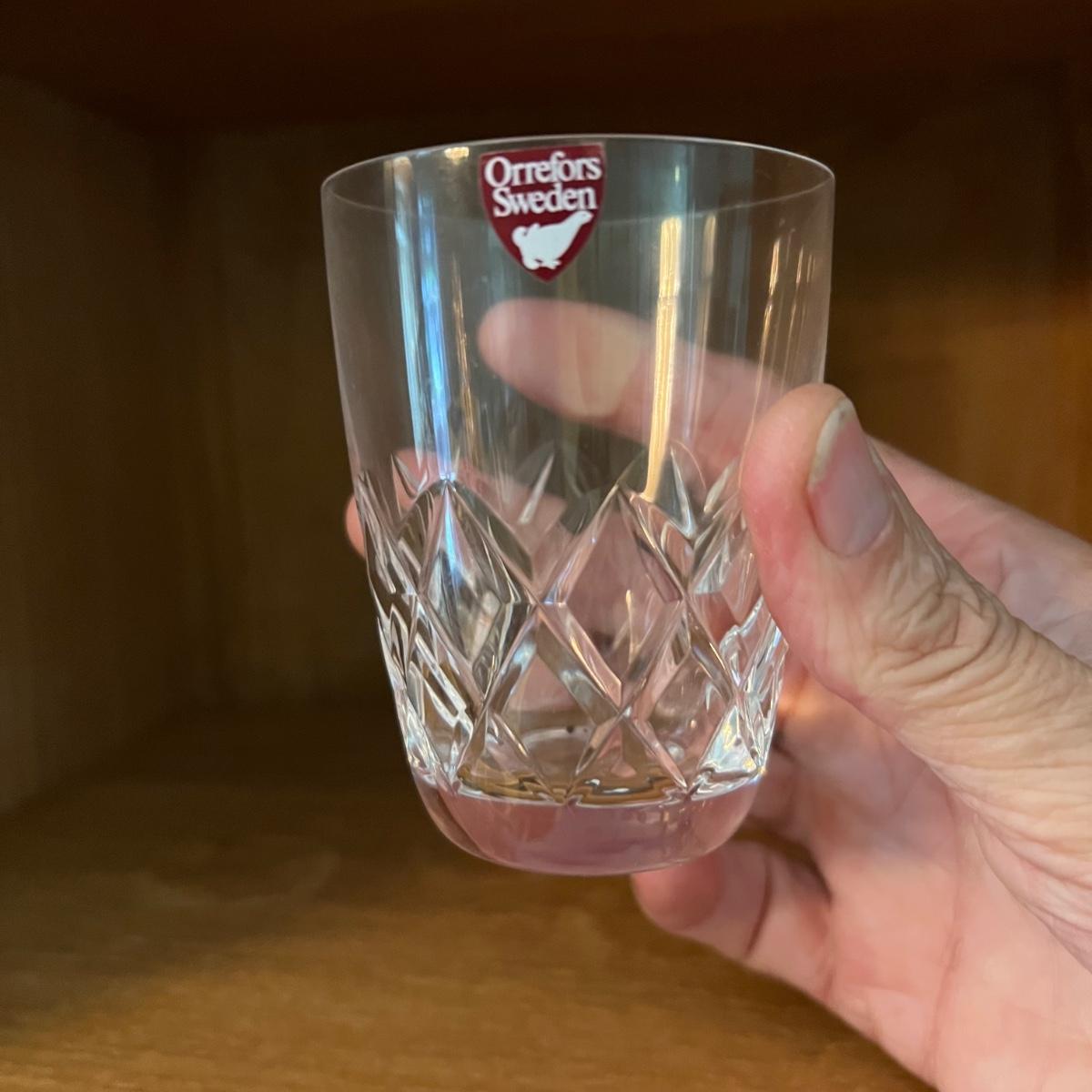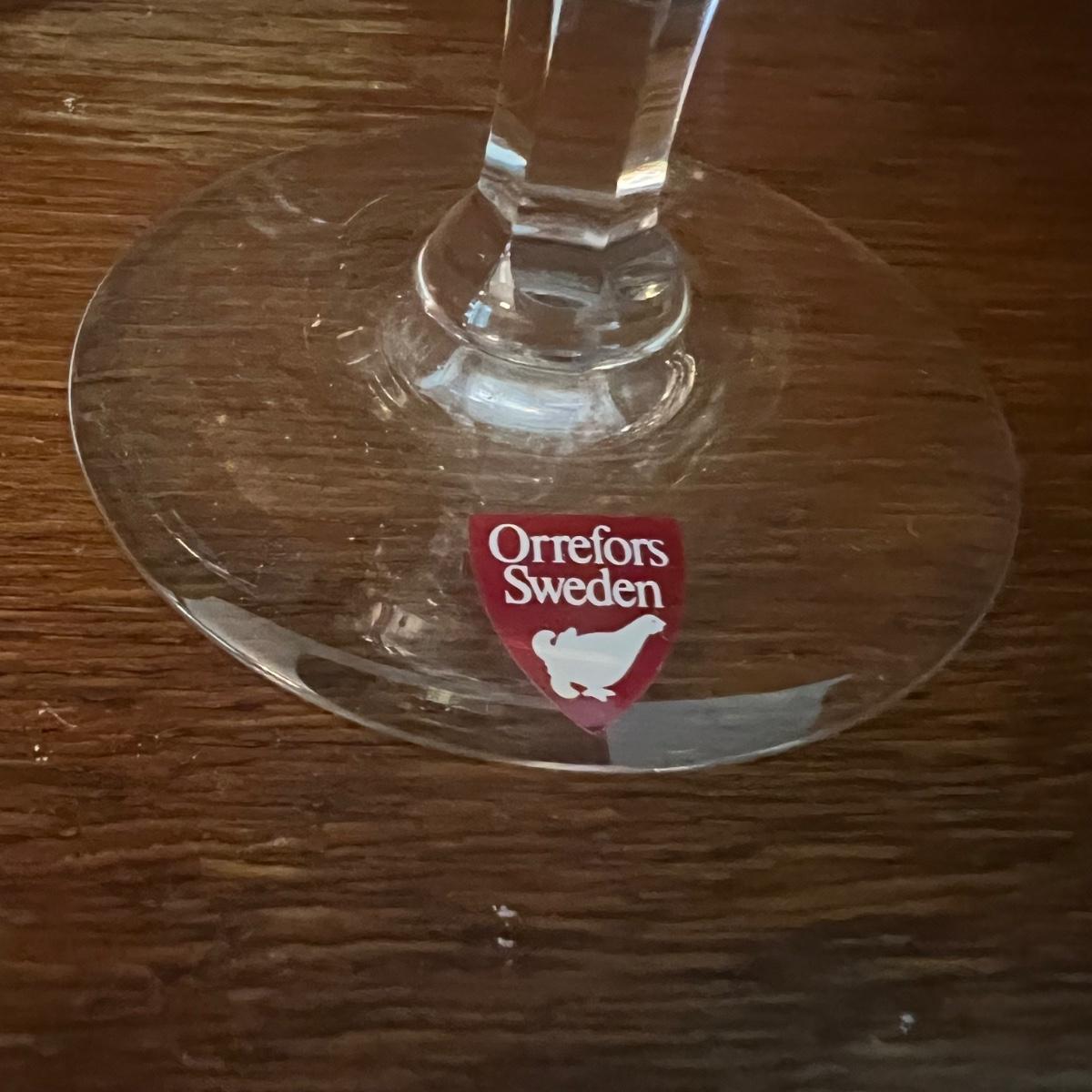 27 Orrefors Crystal drinking glasses in total are included, with 10 each of the stemmed wine glasses and small tumbler glasses. There are 6 of the small stemmed aperitif glasses. Just one larger wine glass with no label but it appears to match this set.