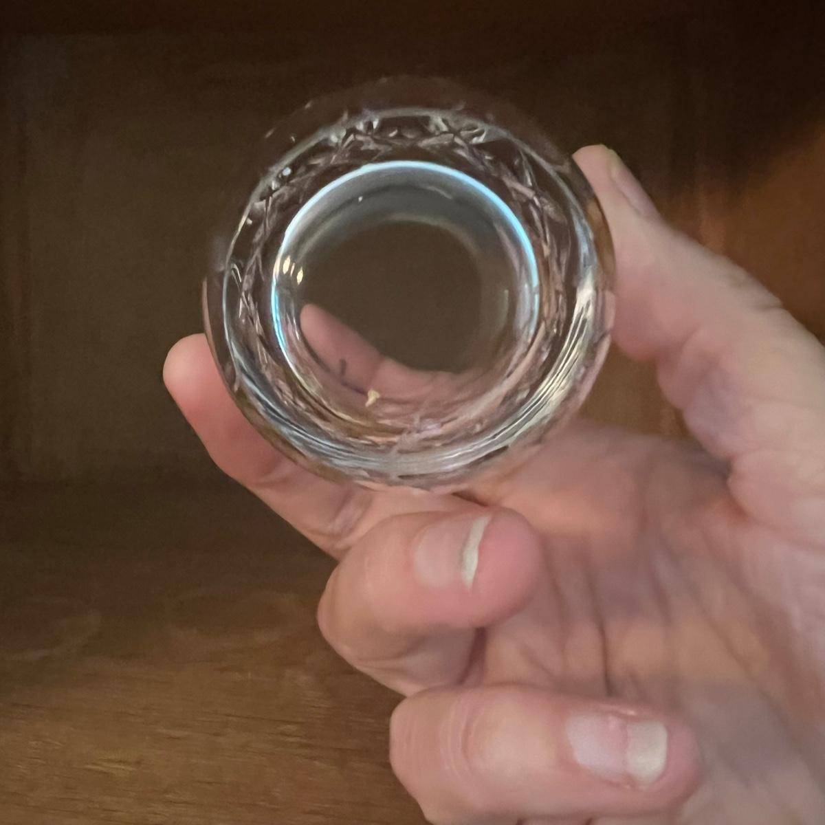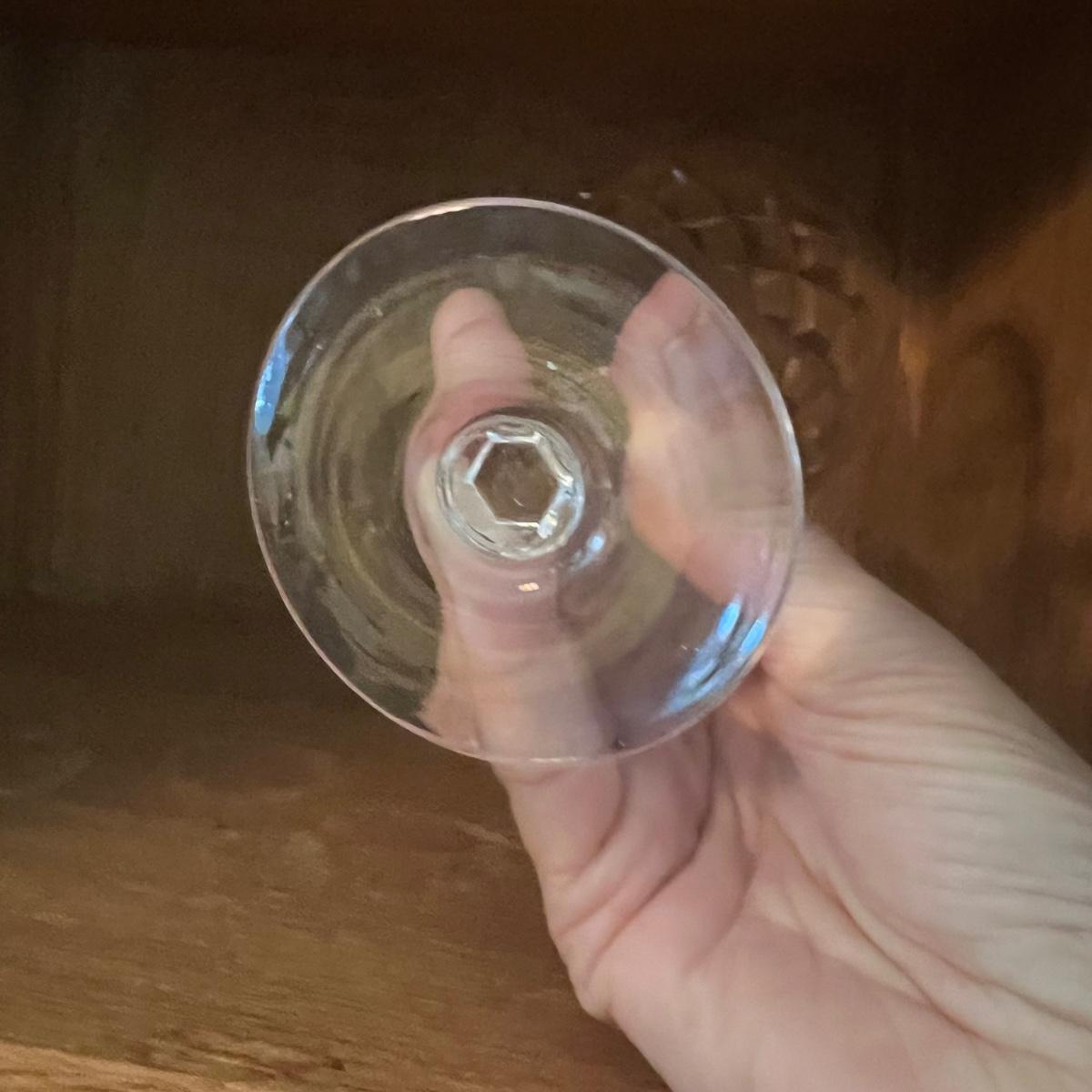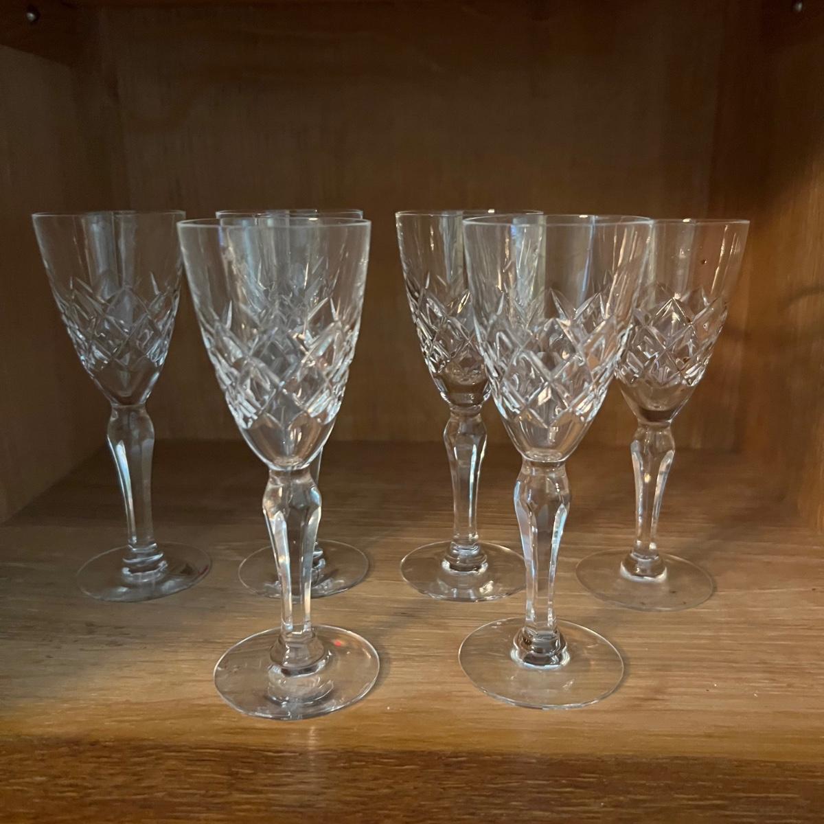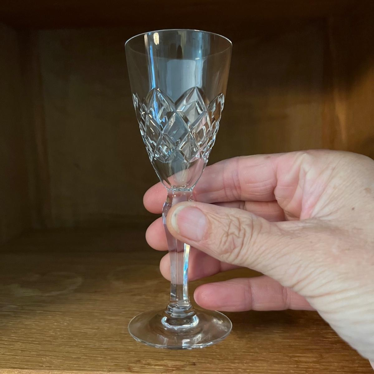 27 Orrefors Crystal drinking glasses in total are included, with 10 each of the stemmed wine glasses and small tumbler glasses. There are 6 of the small stemmed aperitif glasses. Just one larger wine glass with no label but it appears to match this set.