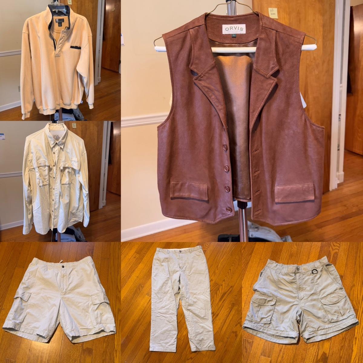 Lot includes over twenty outdoor branded clothing, including short sleeve collared shirts, vests, long sleeve button ups, khaki pants, pullovers, and shorts. You’ll find the following brands: L.L. Bean, Orvis, Columbia, Arizona, Tommy Hilfiger, Cubavera, Jos. A. Bank, and more. All items are sized in a men’s medium or large.