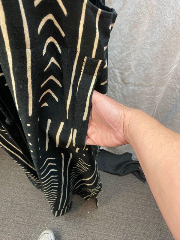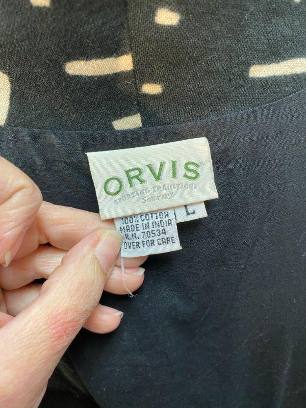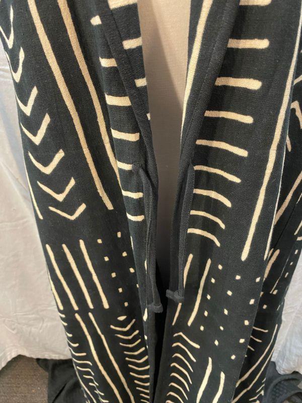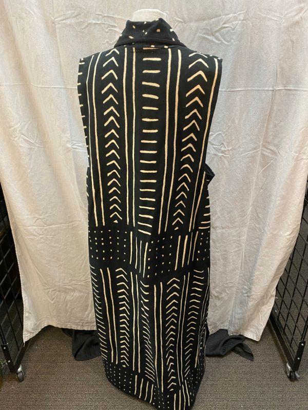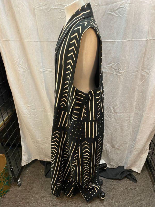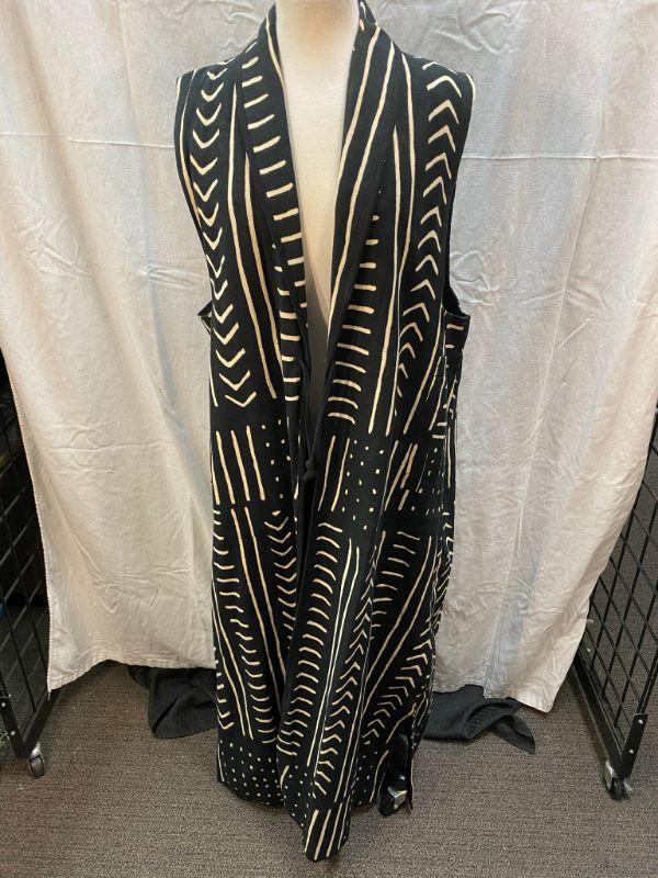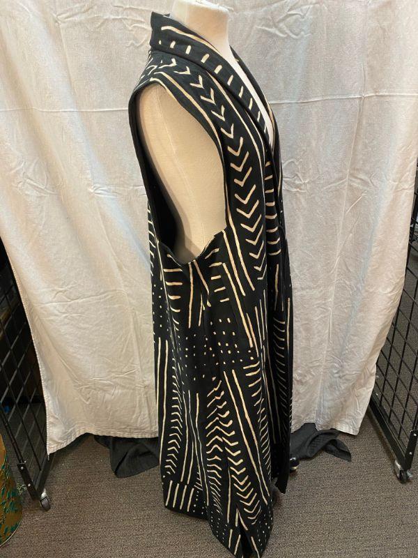 Orvis full length duster vest. Black & white striped eclectic print. Has pockets. Heavyweight cotton material. Single tie close. Size large.
