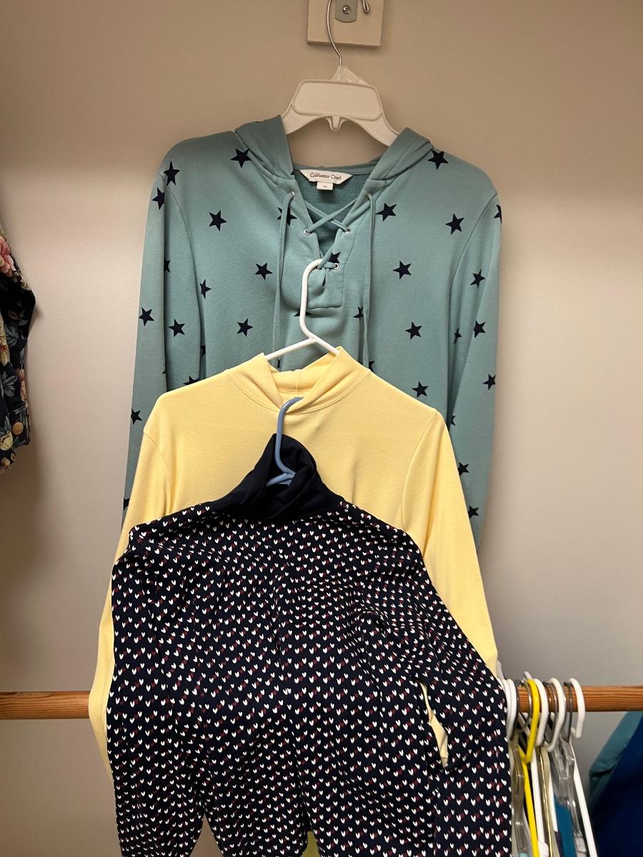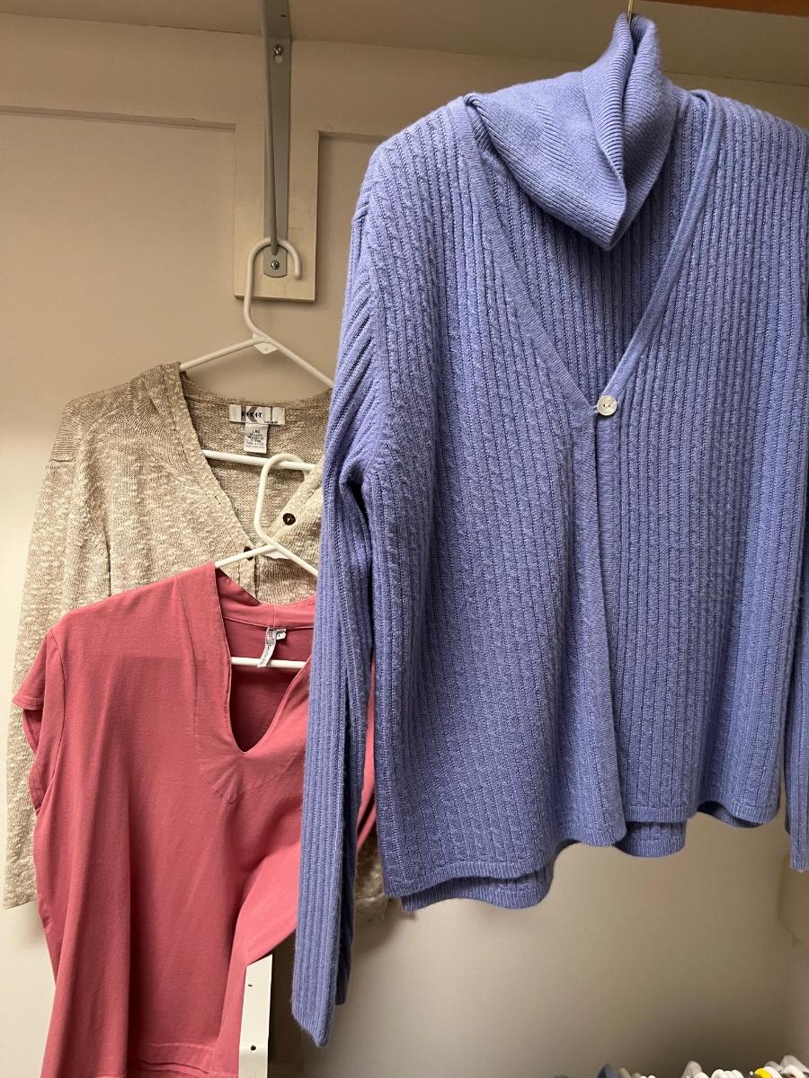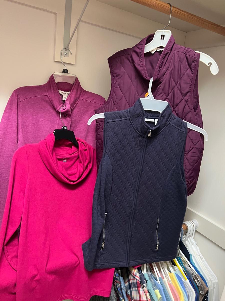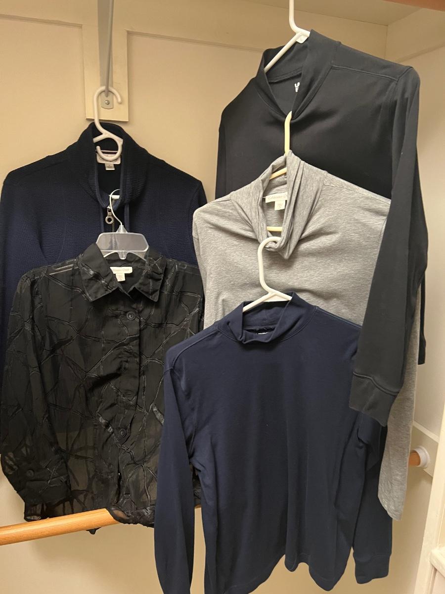 The vast majority of these items are size Medium, with some being petite and a few tops in size L and size S. Includes, sweaters, fleeces, t-shirts, long sleeves tee’s and pants. See images for sizes and brands.