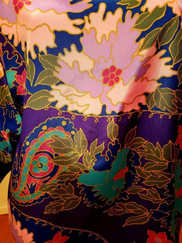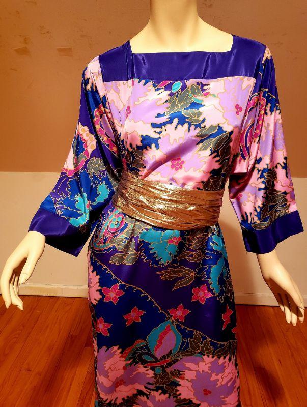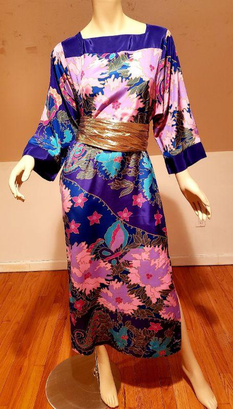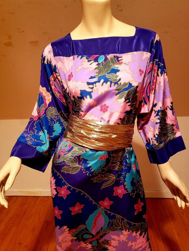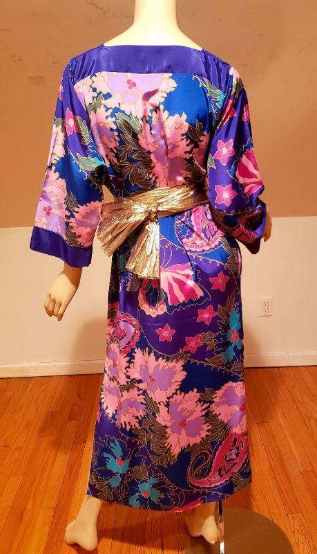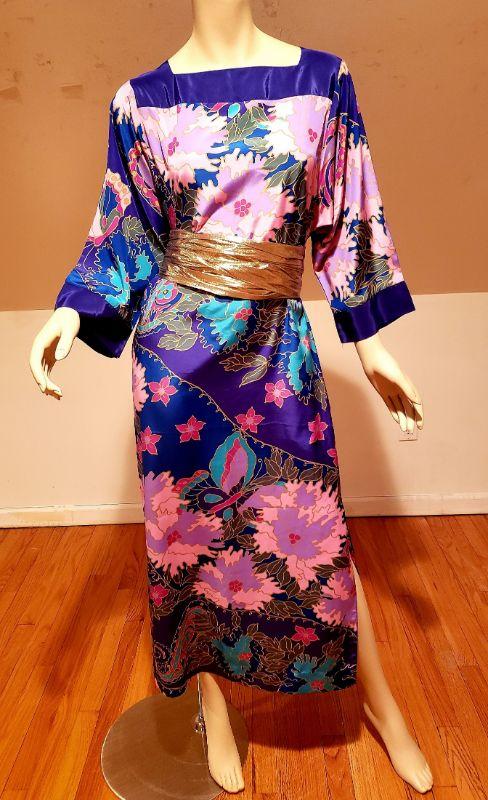 Japanese style Kimono Maxi dress hand printed with gold rims and a gold sash.