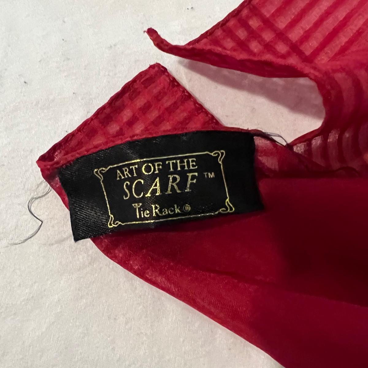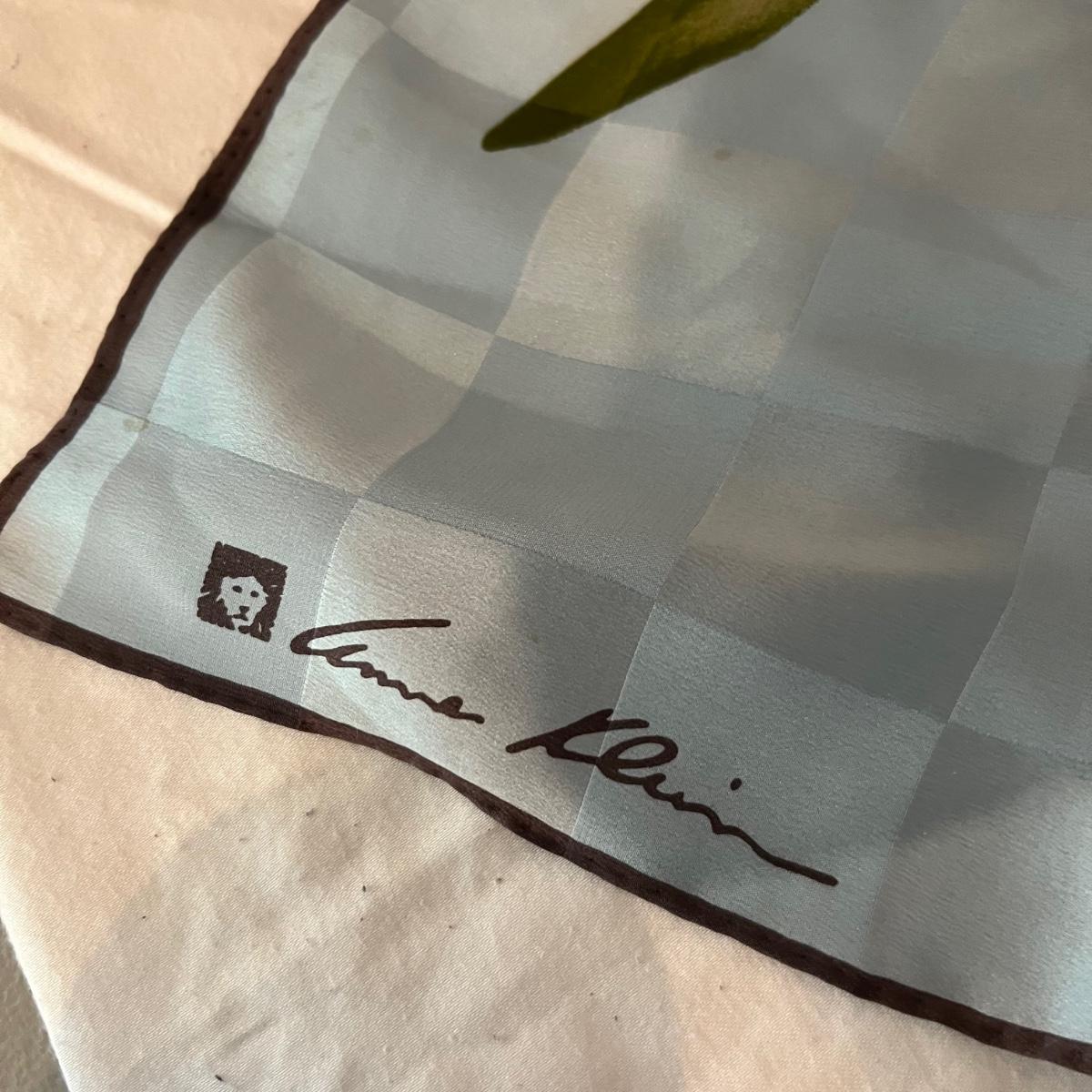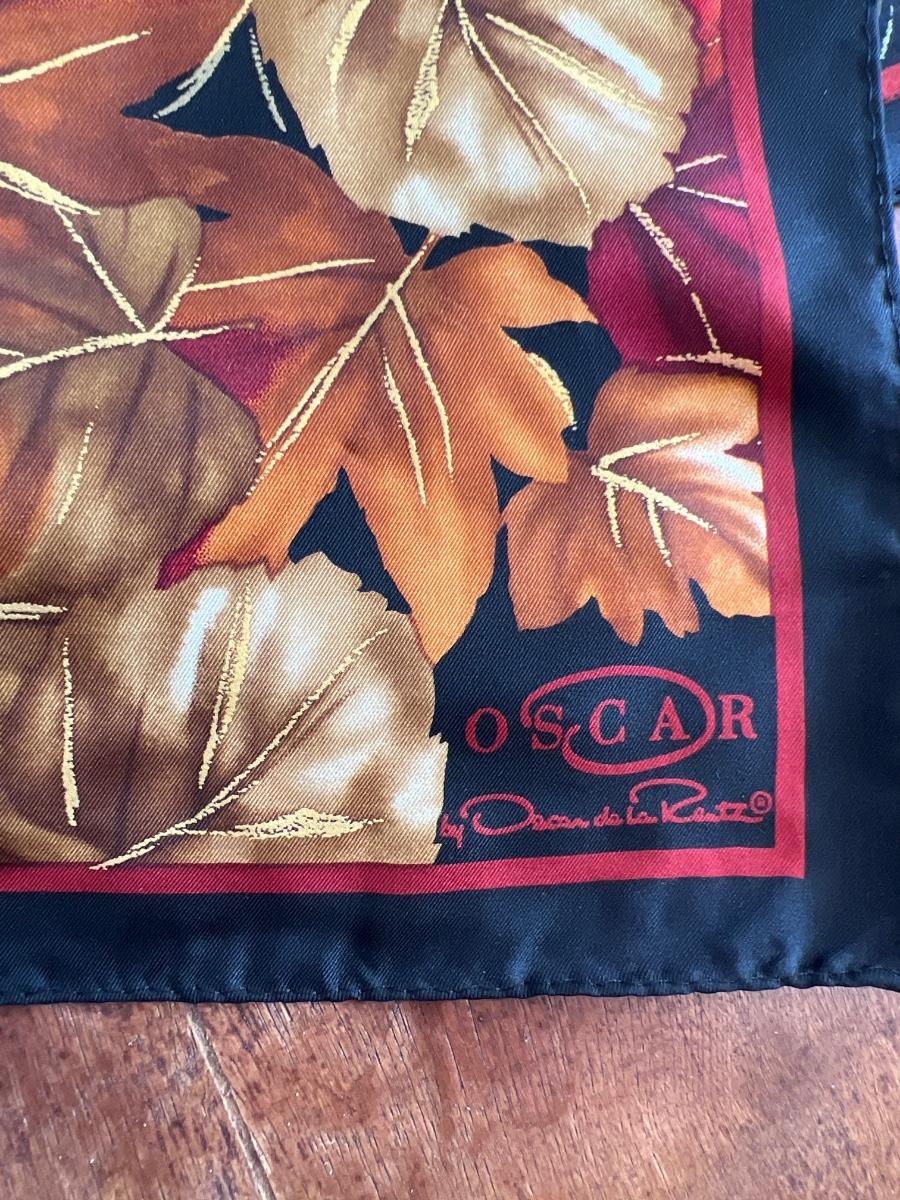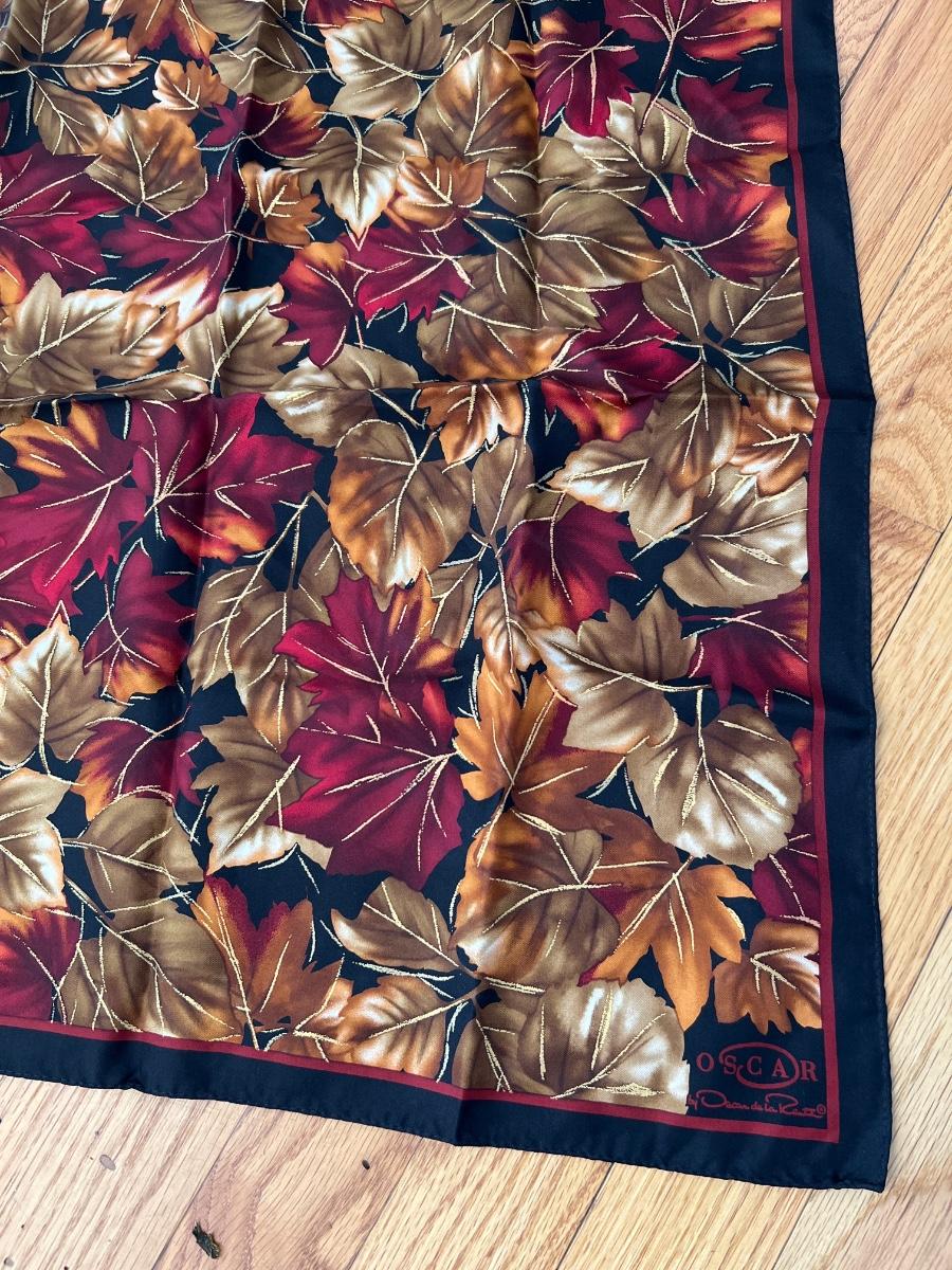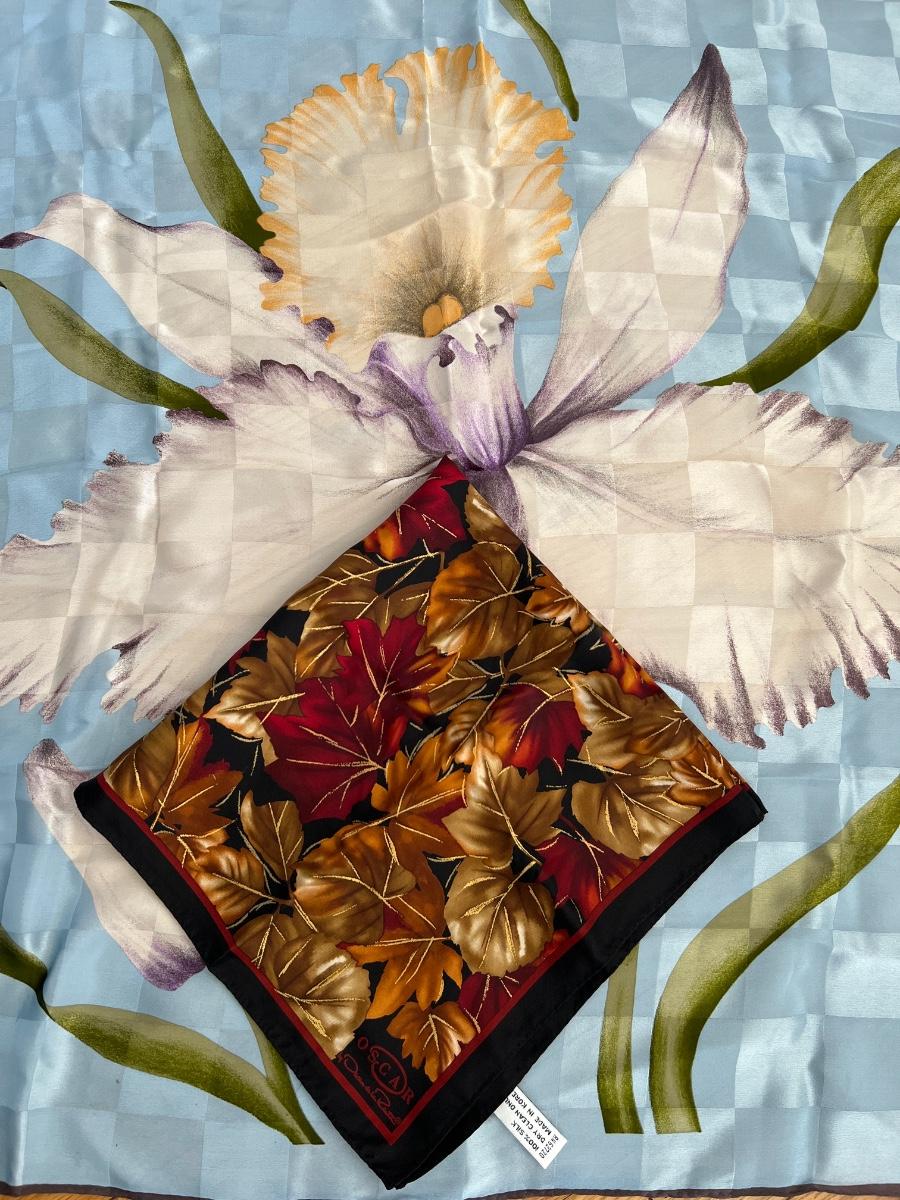 Oscar de la Renta scarf measures 20” square. One of the largest scarves is the Anne Klein bearded iris scarf which measures 30” x 32”.