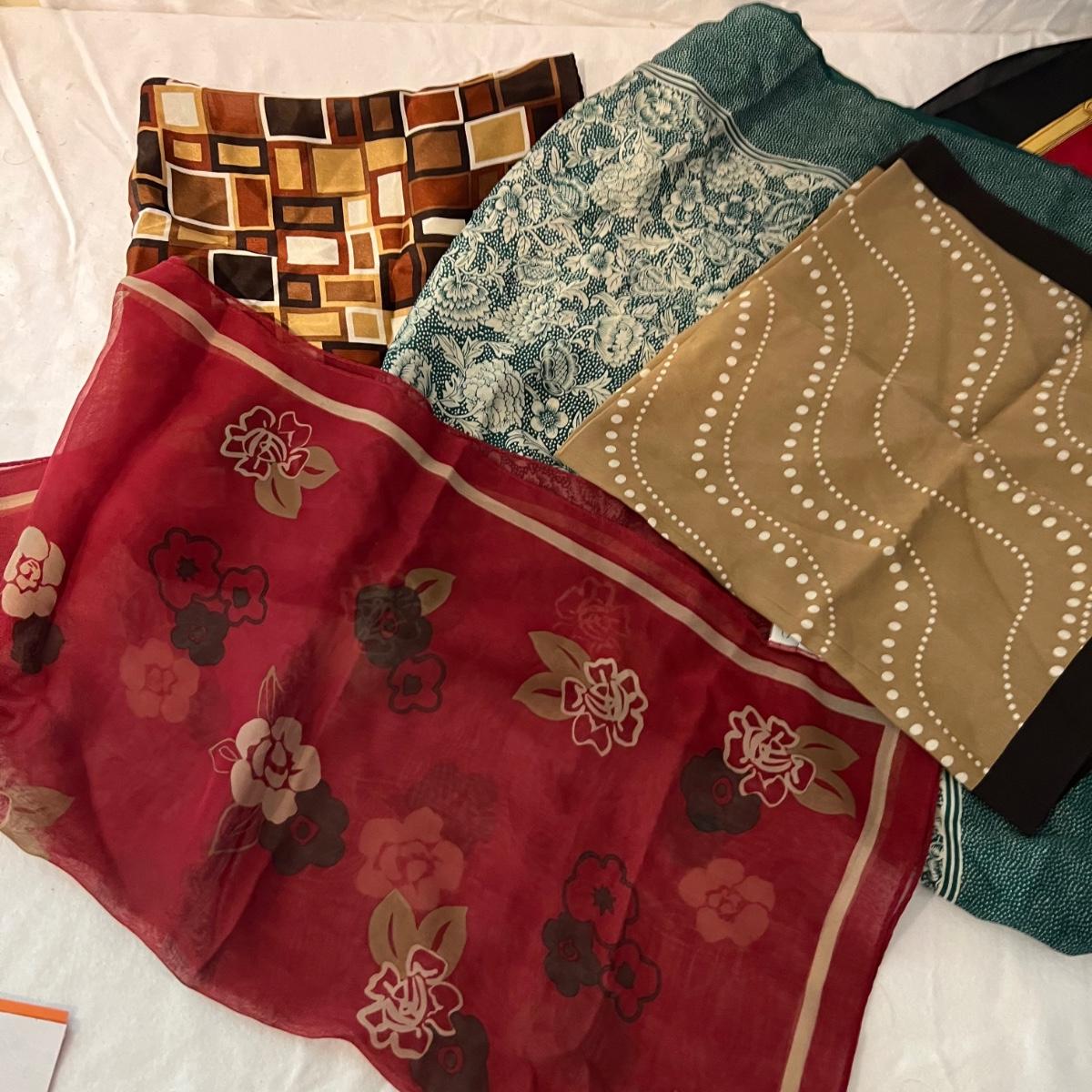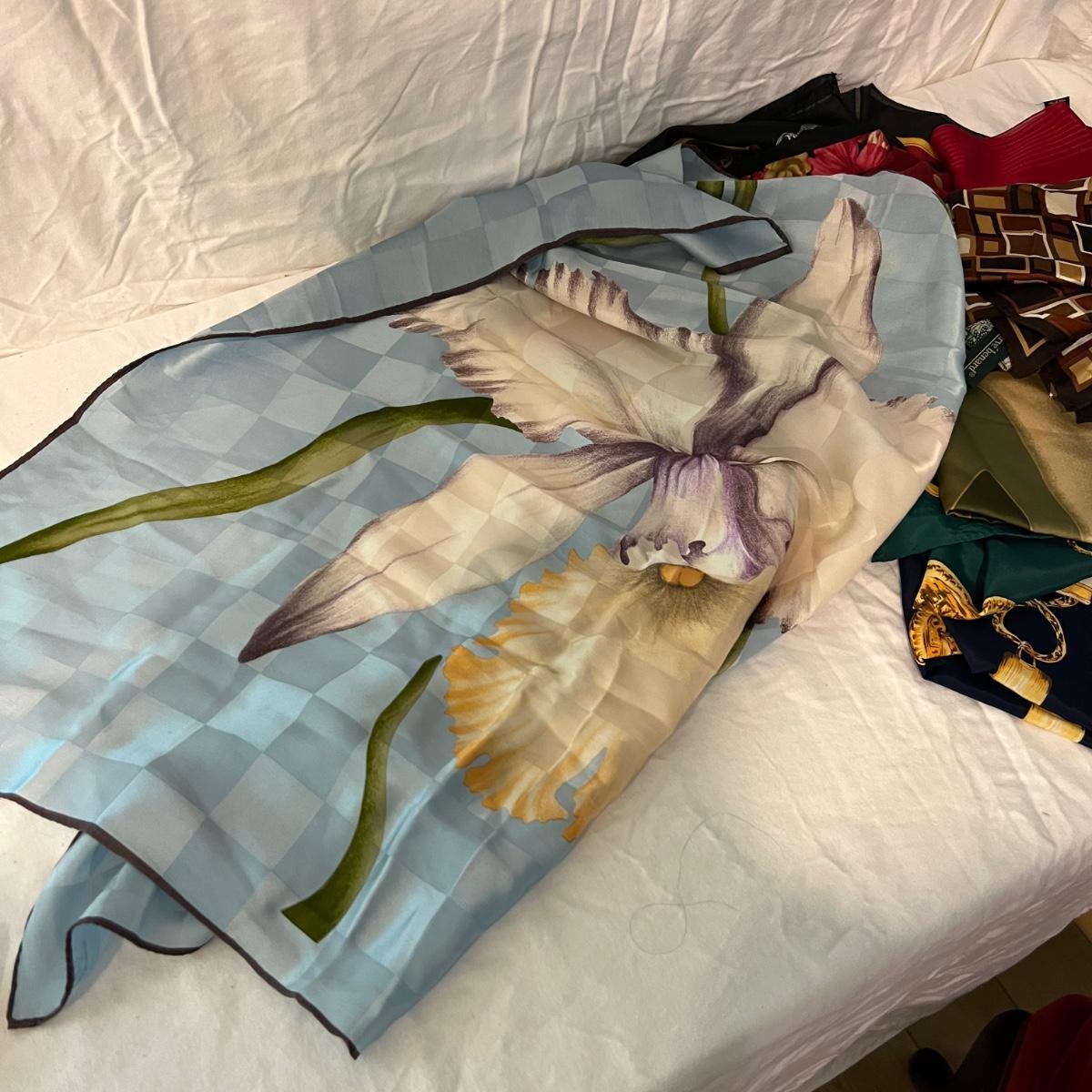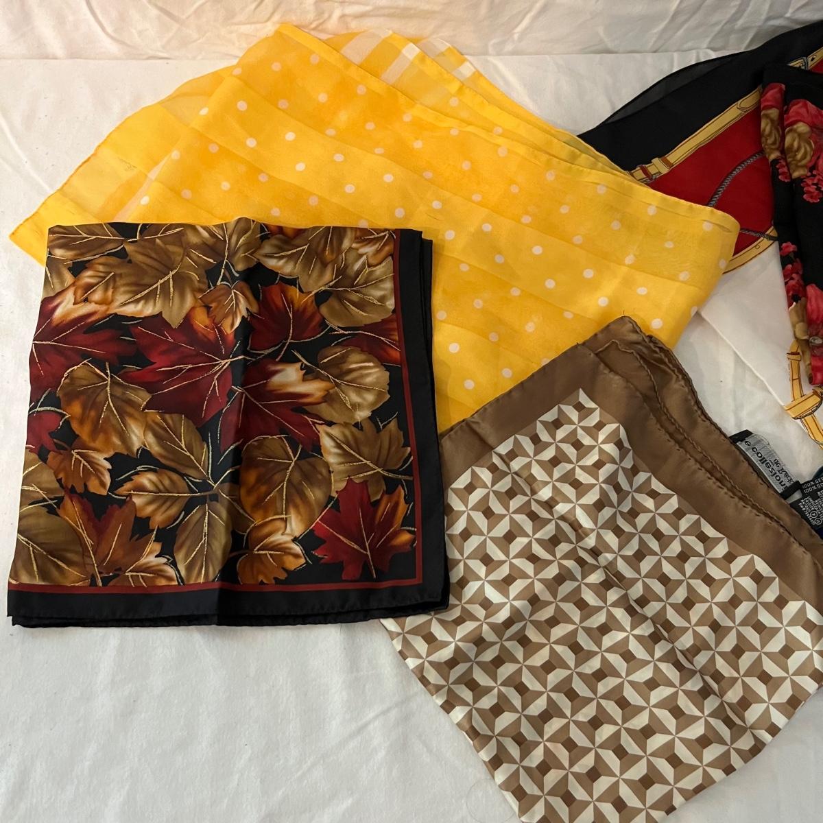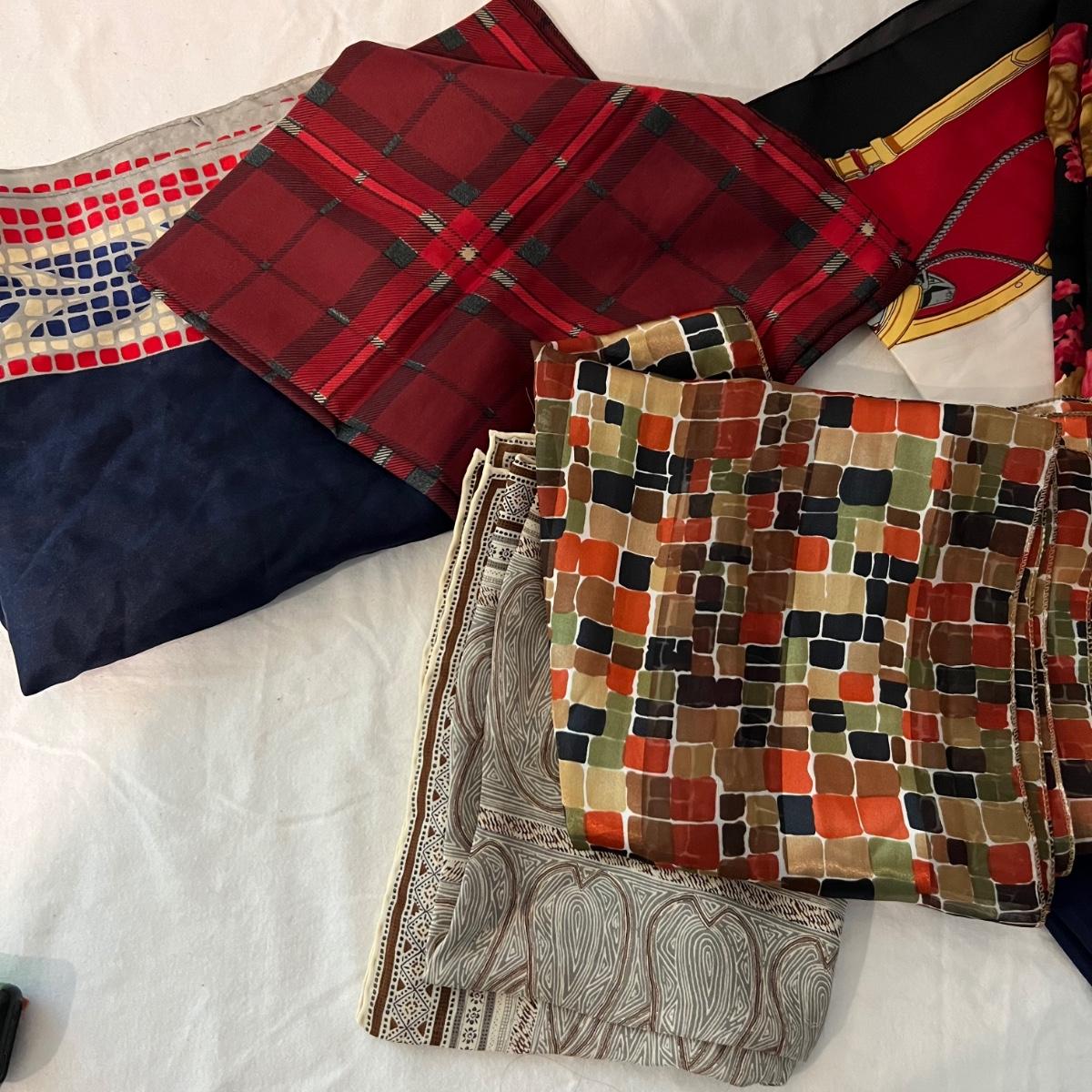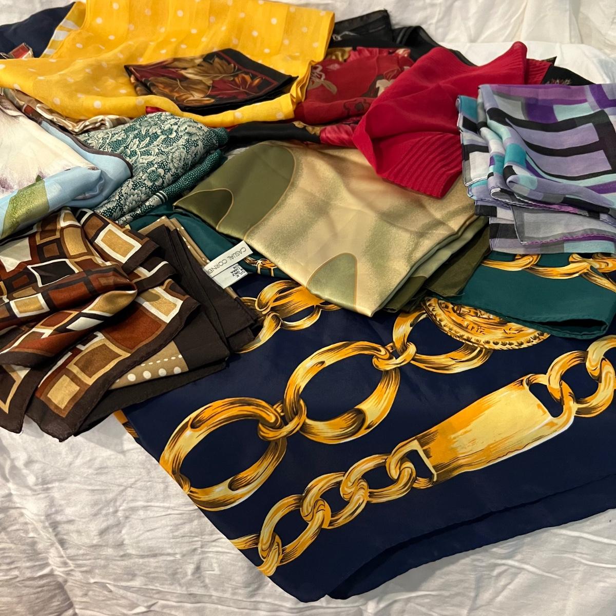 Over 15 scarves in this lot that includes mostly 100% silk scarves in a variety of sizes. Labels are in images when found.