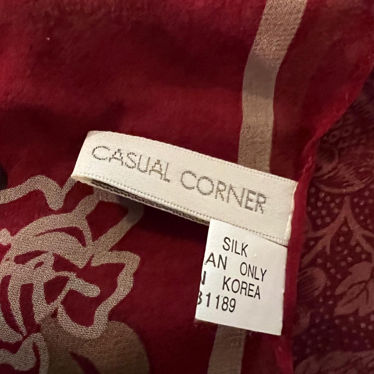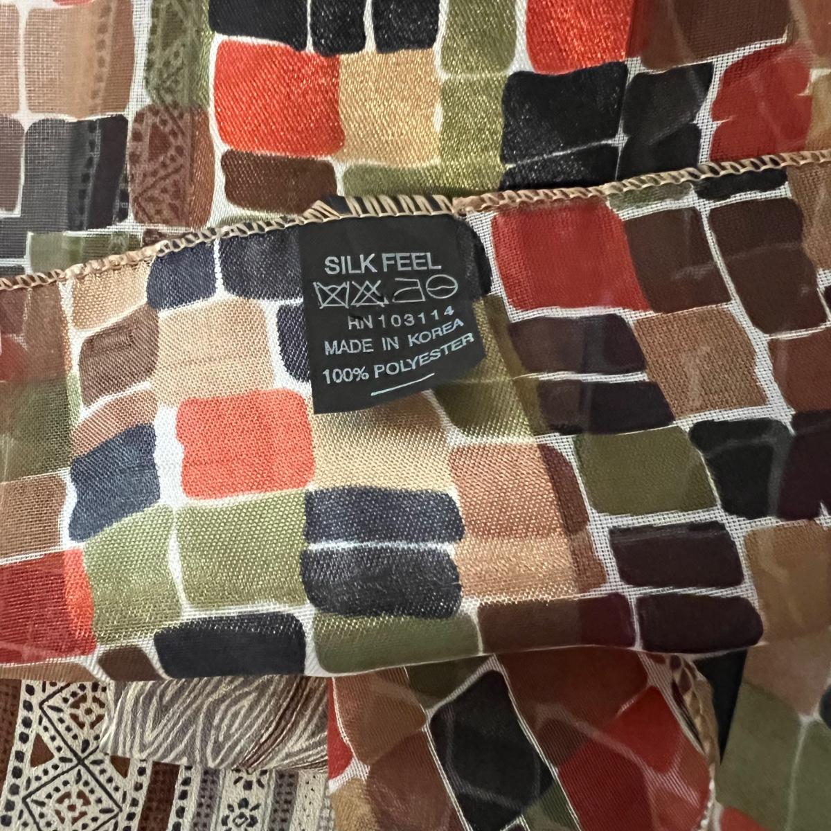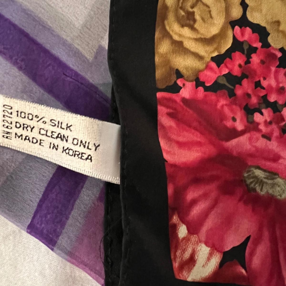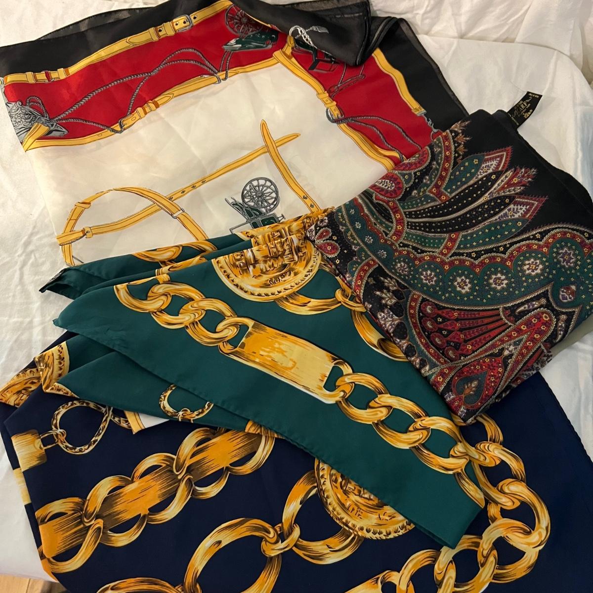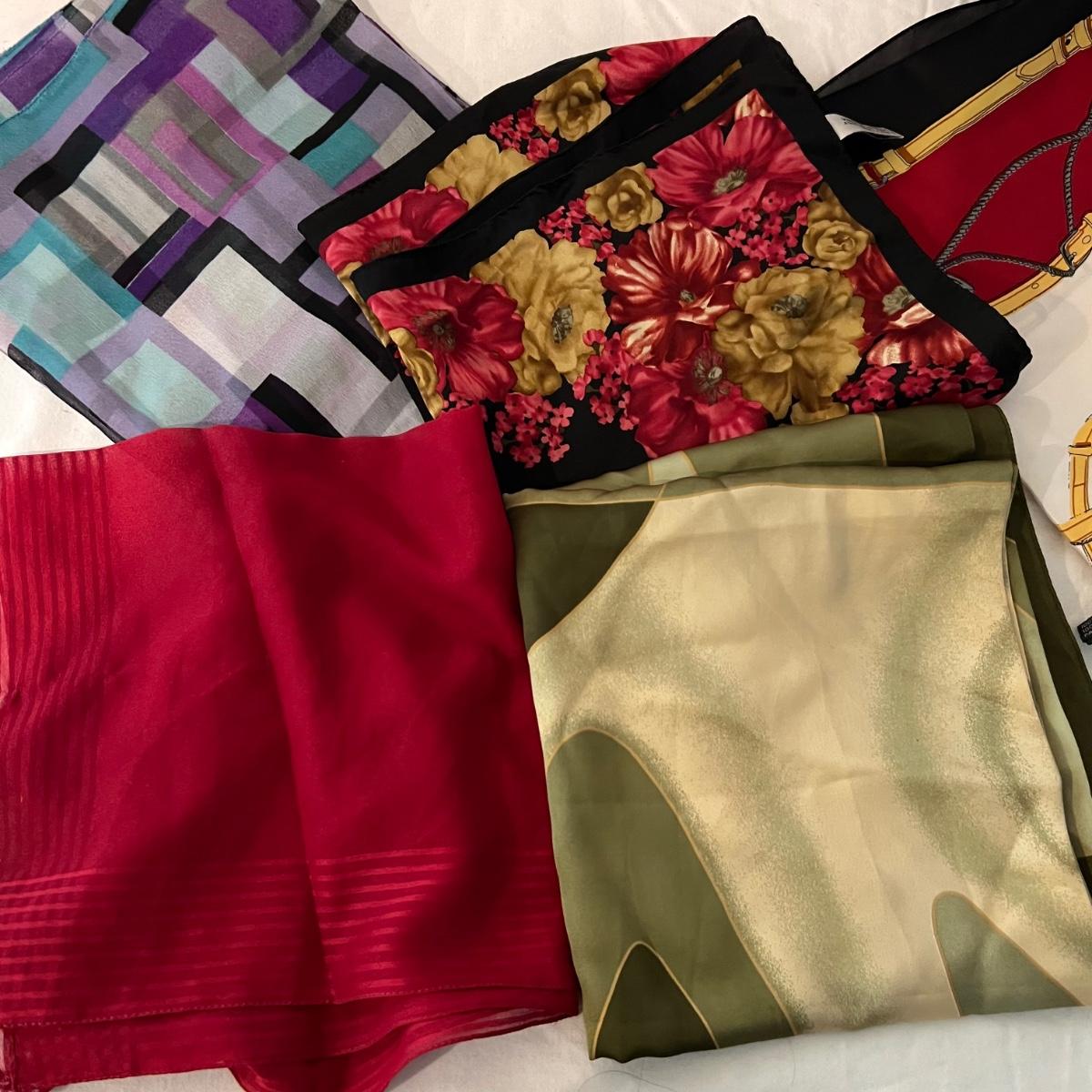 Over 15 scarves in this lot that includes mostly 100% silk scarves in a variety of sizes. Labels are in images when found.