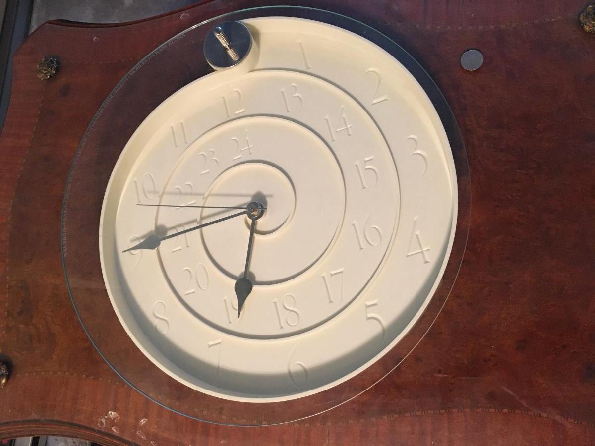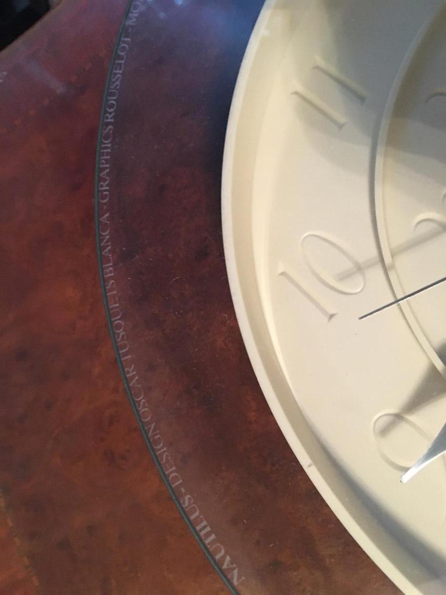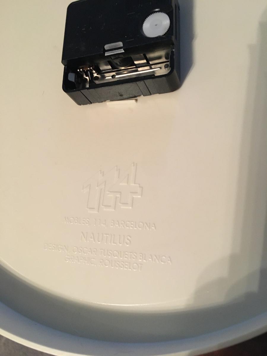 Made from ABS plastic, glass and stainless steel. Battery operated glass face nautilus designed Graphics Rousselot clock .