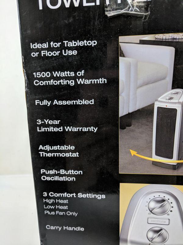 Oscillating Ceramic Tower Heater, 15 Watts, 3 Settings, Tabletop/Floor Use - New