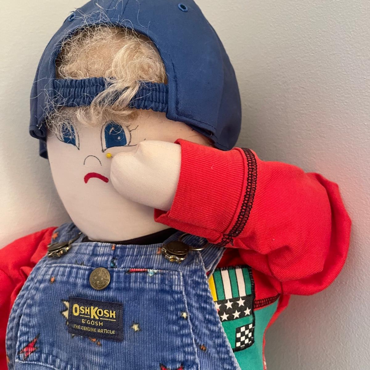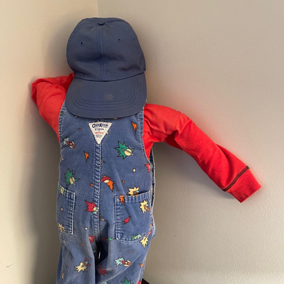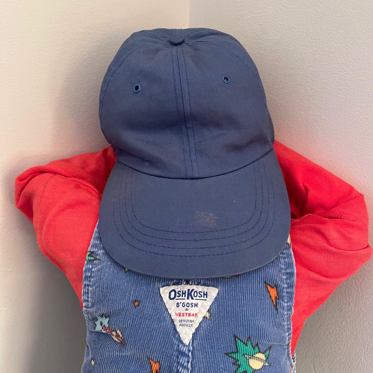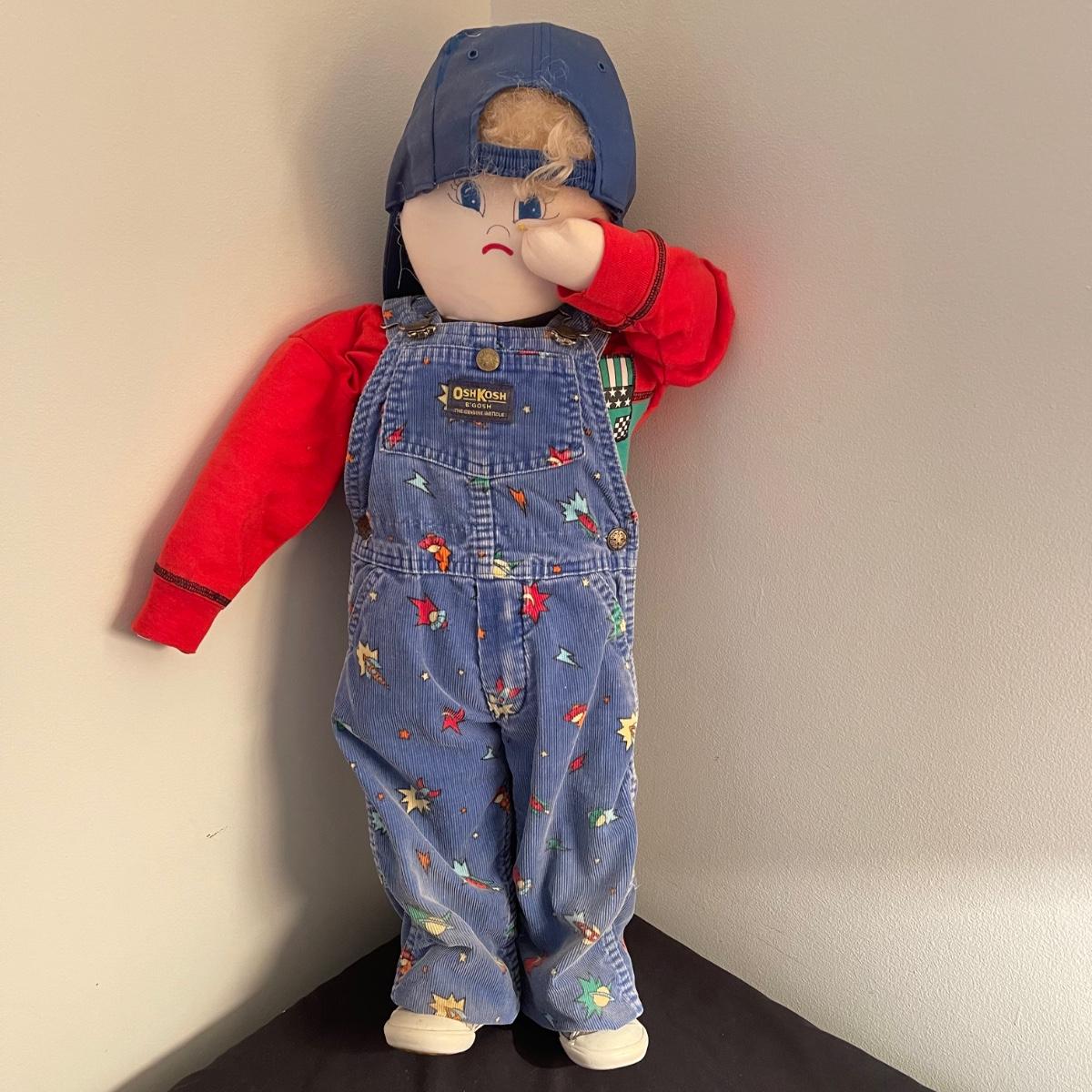 This Oshkosh B’gosh Time Out Toddler has a blue hat, space ship overalls, a red long sleeved shirt and blonde curly hair only visible from the front. It is just about 28" tall. The arms will hang to the side, one is currently pinned to its face to keep its elbow up.