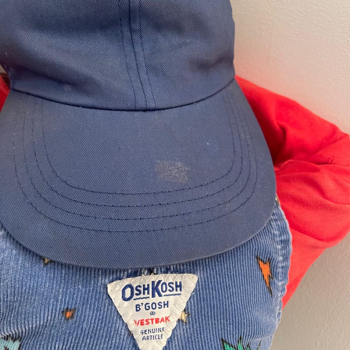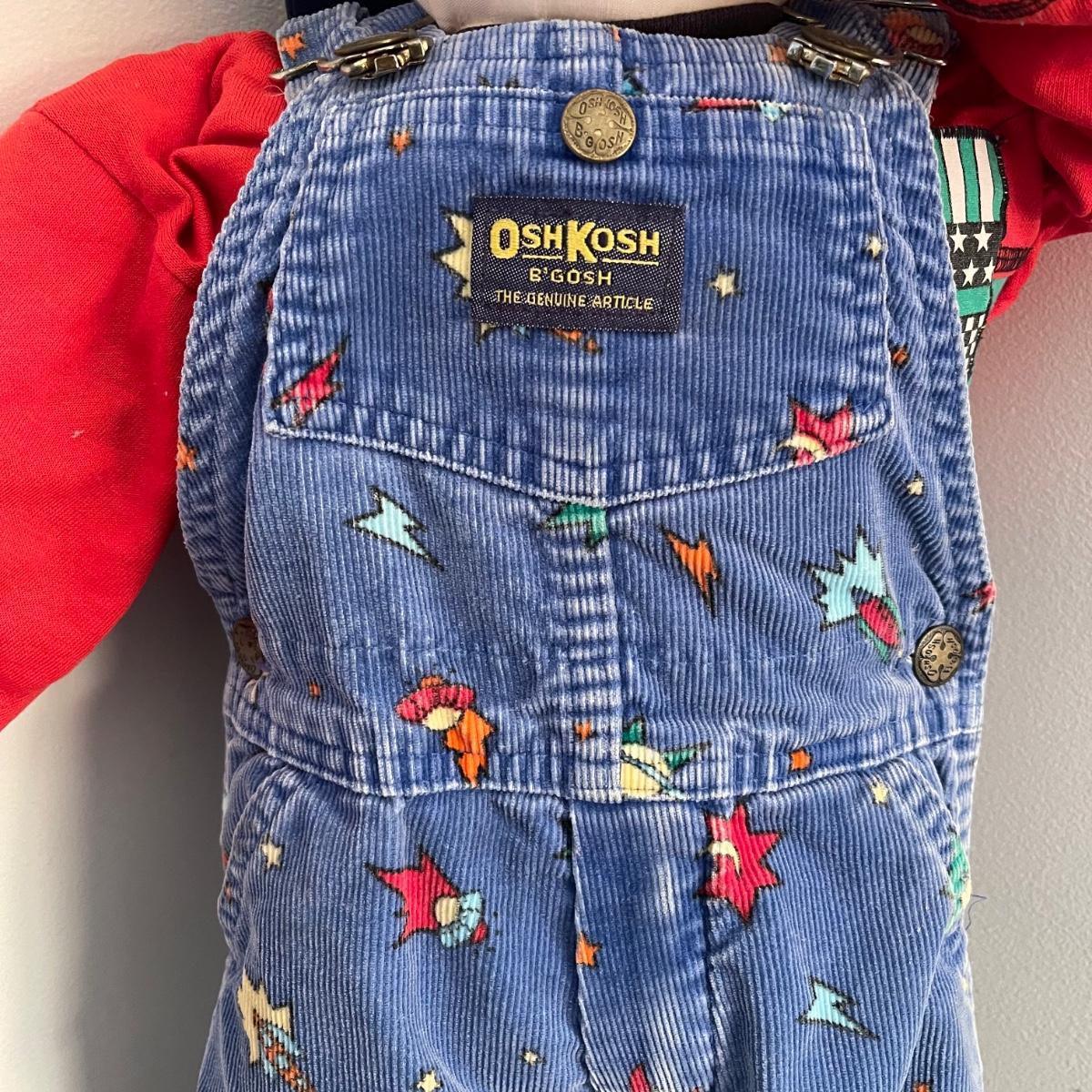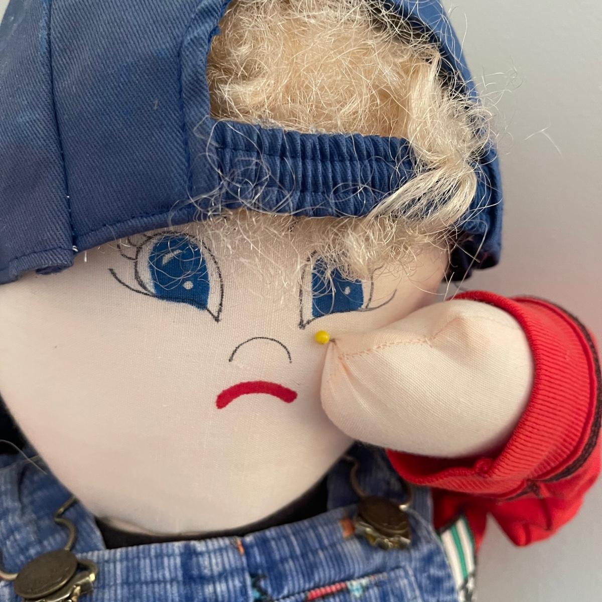 This Oshkosh B’gosh Time Out Toddler has a blue hat, space ship overalls, a red long sleeved shirt and blonde curly hair only visible from the front. It is just about 28" tall. The arms will hang to the side, one is currently pinned to its face to keep its elbow up.