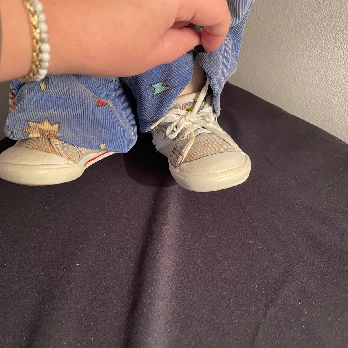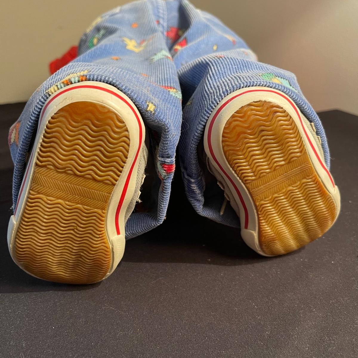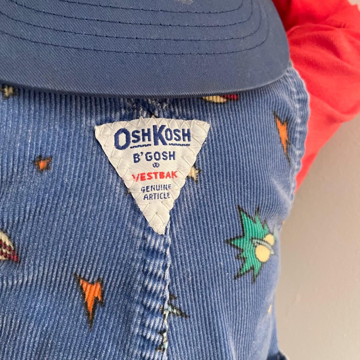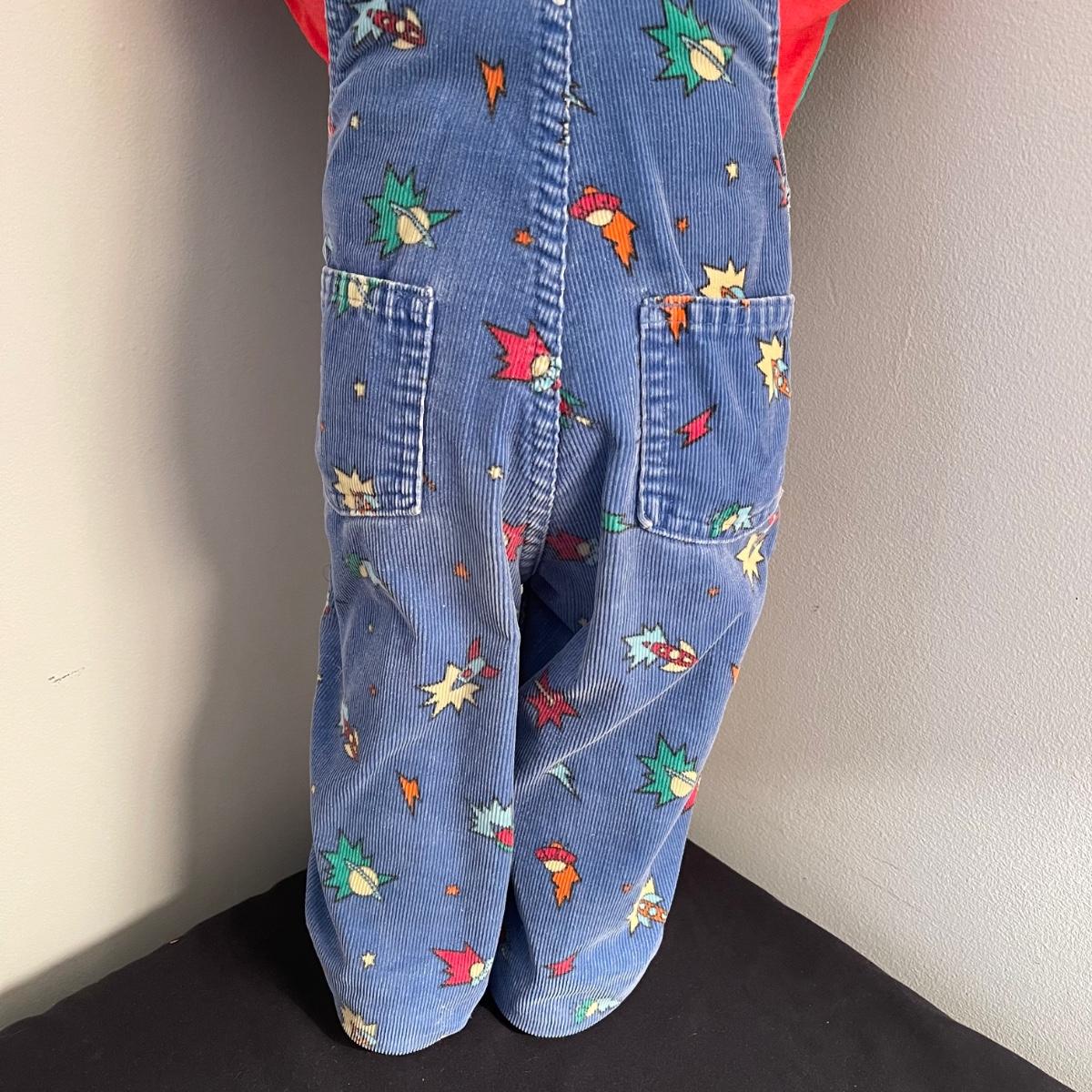 This Oshkosh B’gosh Time Out Toddler has a blue hat, space ship overalls, a red long sleeved shirt and blonde curly hair only visible from the front. It is just about 28" tall. The arms will hang to the side, one is currently pinned to its face to keep its elbow up.