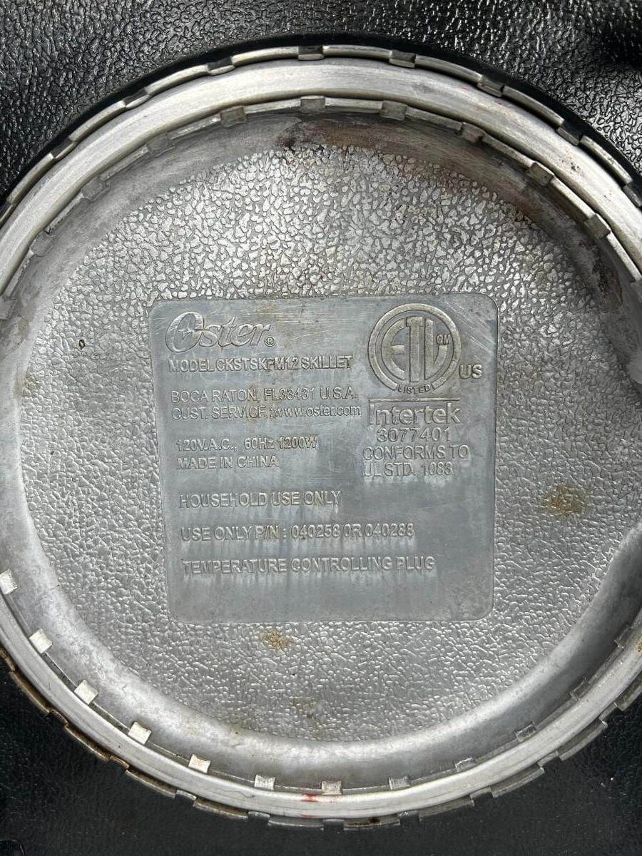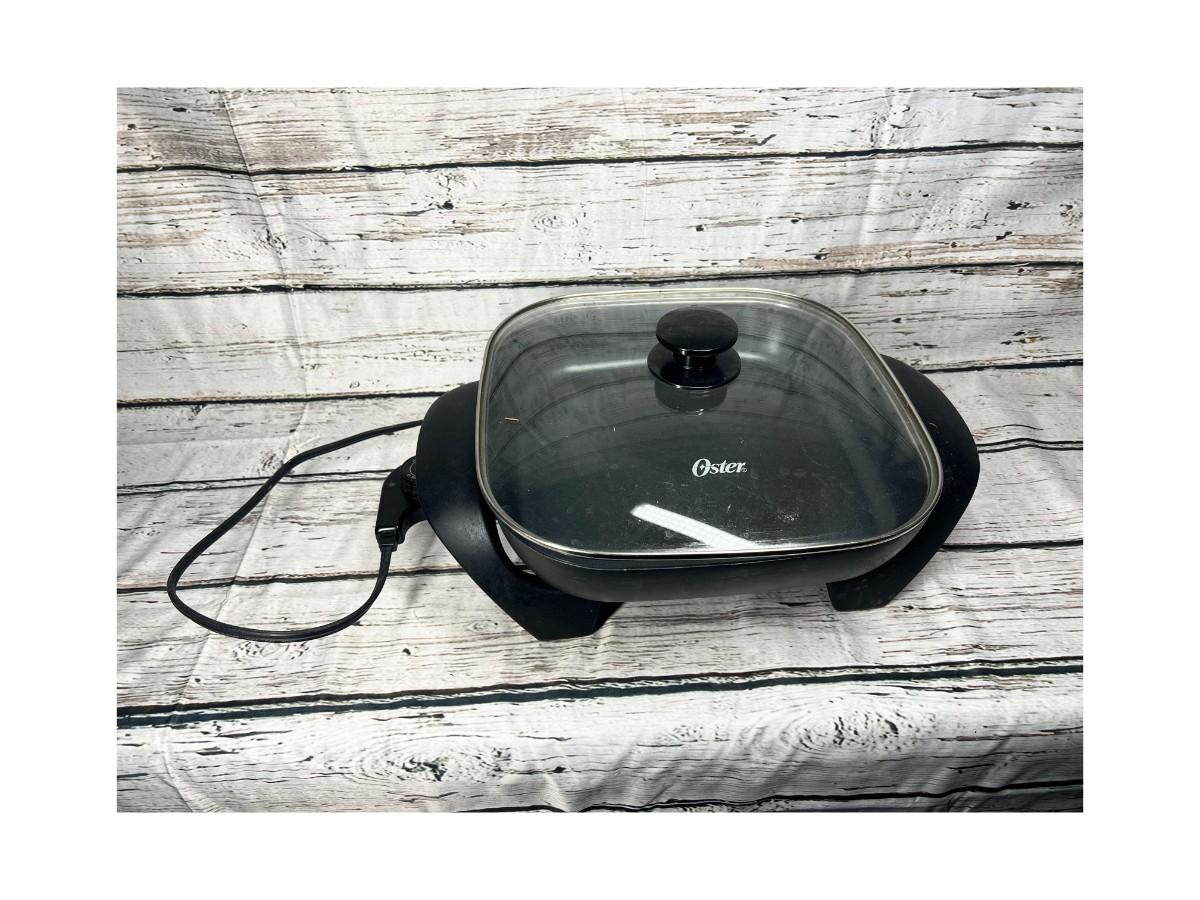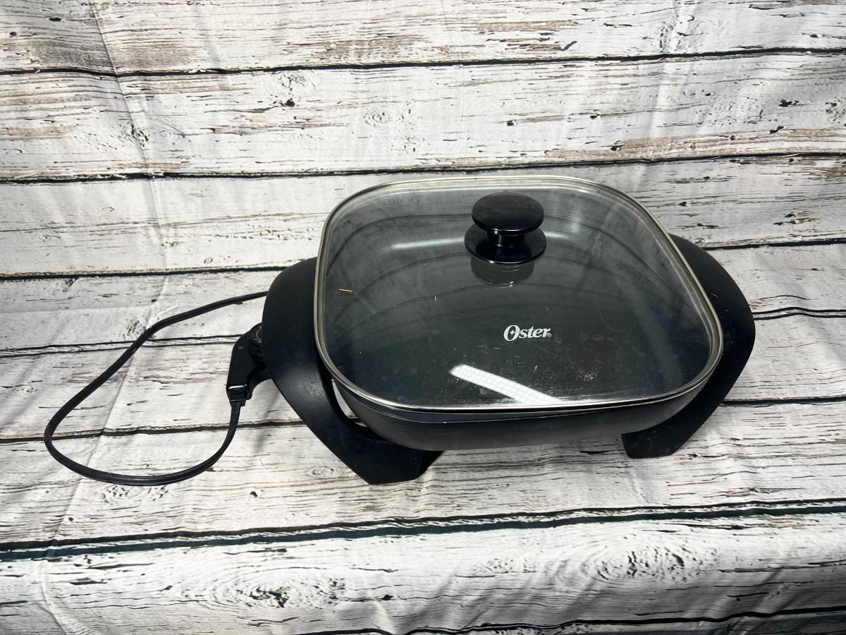 Oster 12" Black Electric Skillet, there are some signs of use on the skillet, but there is no significant damage and is in good condition. Has not been tested, check pictures for more details and for sizing.