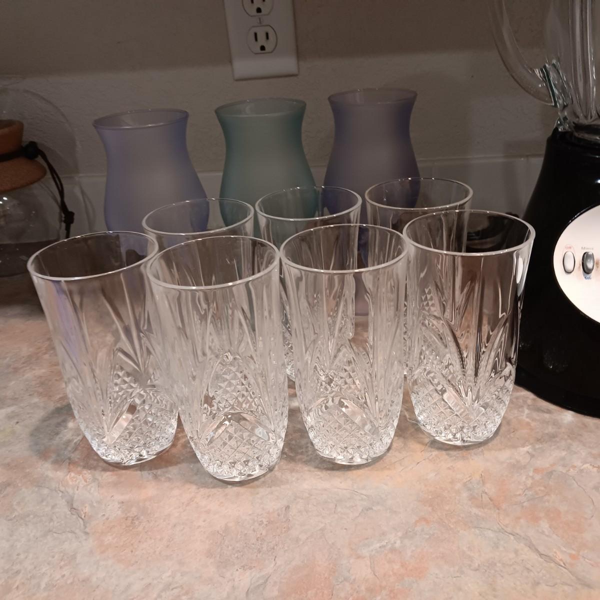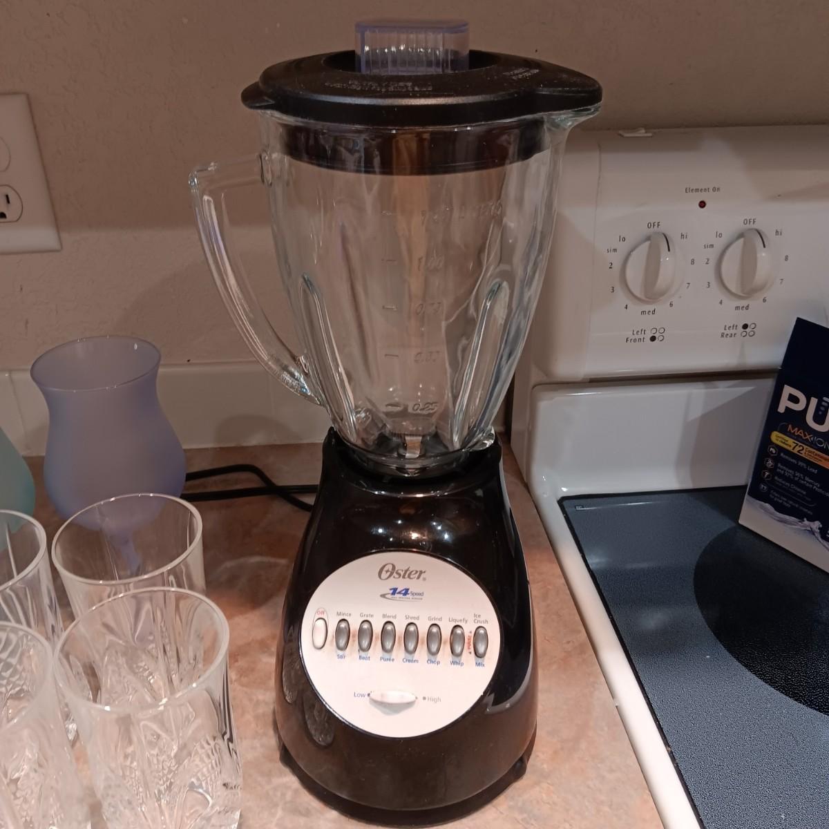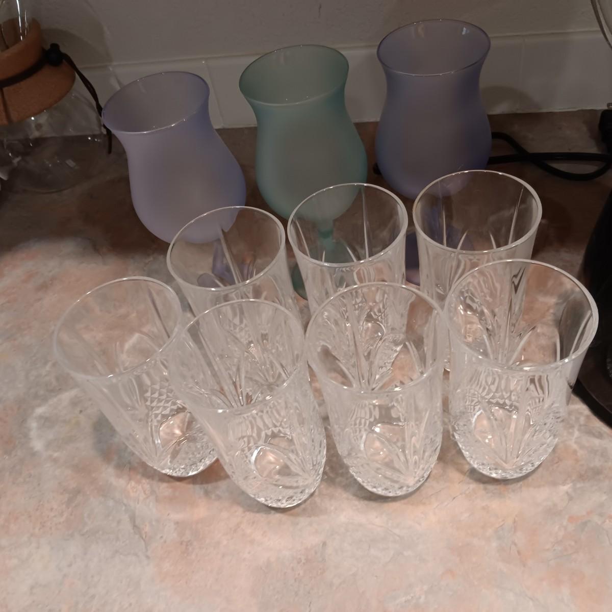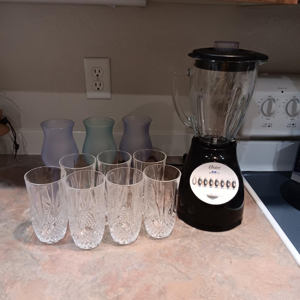 OSTER BLENDER, 7 CRYSTAL DRINKING GLASSES AND 3 STEMMED GLASSES