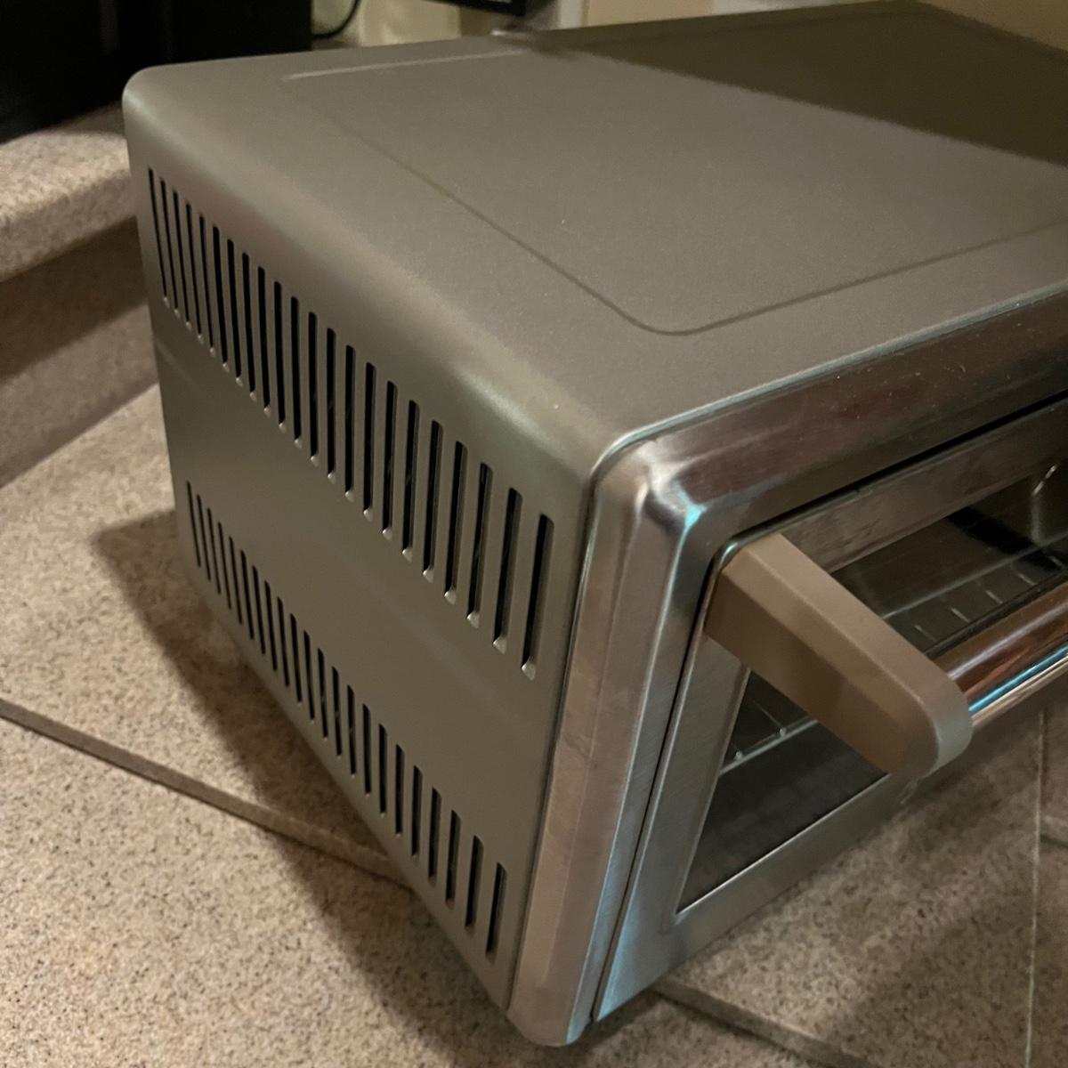 Lot includes an Oster stainless steel front load toaster oven that powered on when plugged in. Very clean in nearly new condition and measures 12.5” x 17” x 10”H.