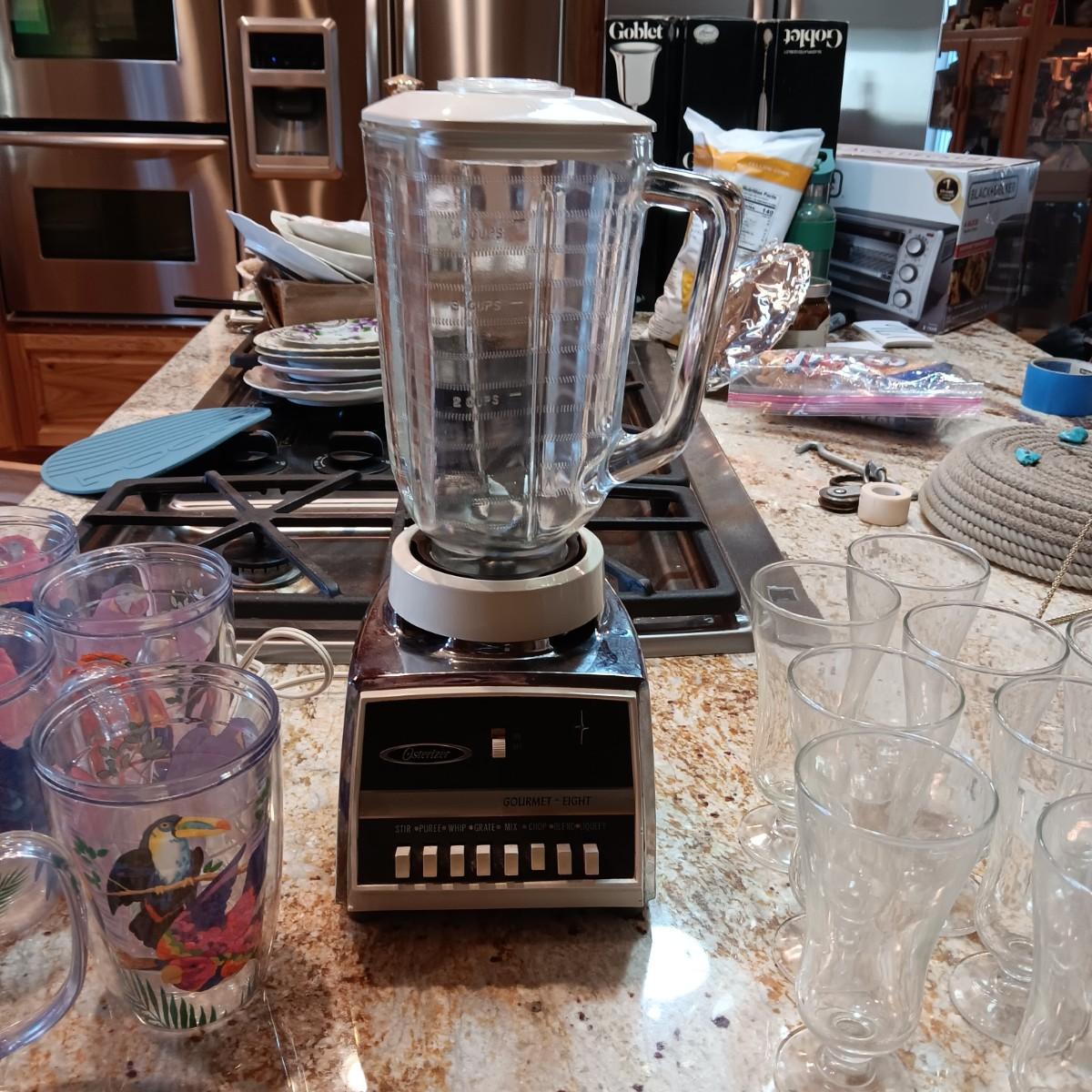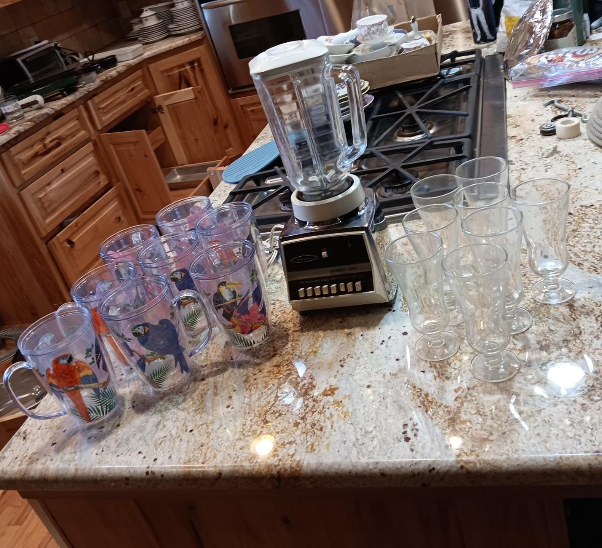 OSTERIZER BLENDER, 8 PLASTIC GLASSES AND 8 SMOOTHIE GLASSES