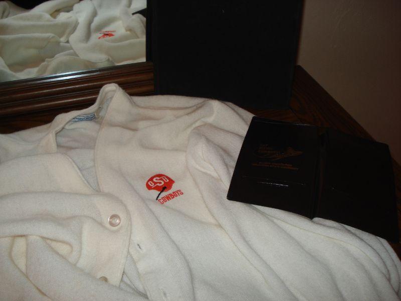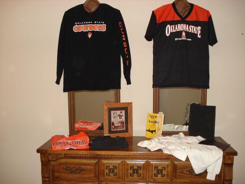 Vintage white sweater by munsingwear that looks to be from 50's or 60's size Medium, shirts are Large to 2X, print with OSU items in it, Aggie Angles student handbook from 1955-56 Oklahoma A&M college stillwater, dark notebook cover that is embossed with school Oklahoma University but you can't see it very well. Plastic vintage folder printed with the flying cowboys alumni. everything is in Very good to excellent condition. Dresser is not included but the mirros held shirts great.