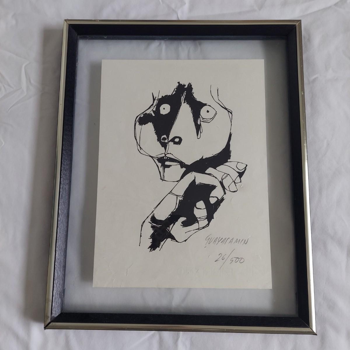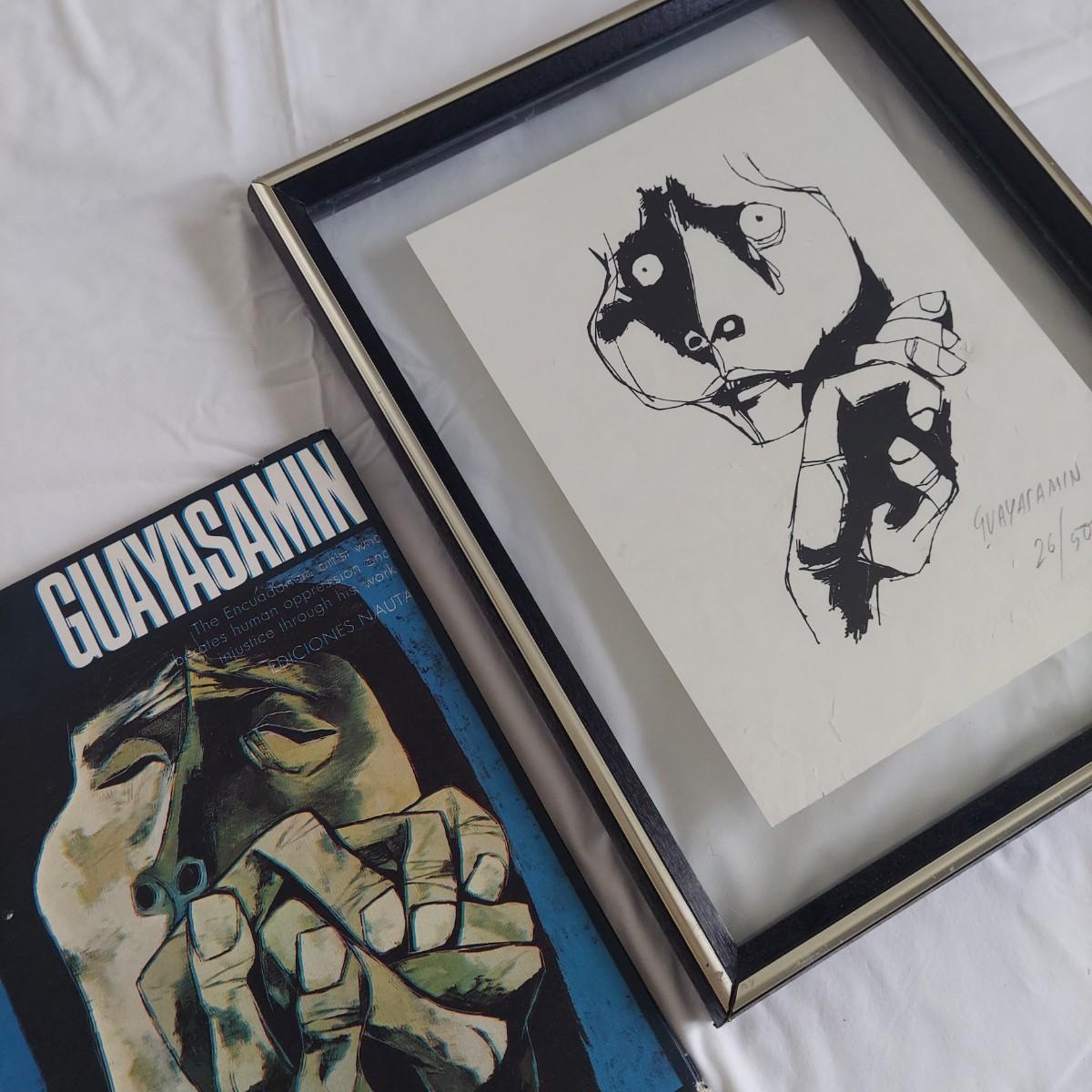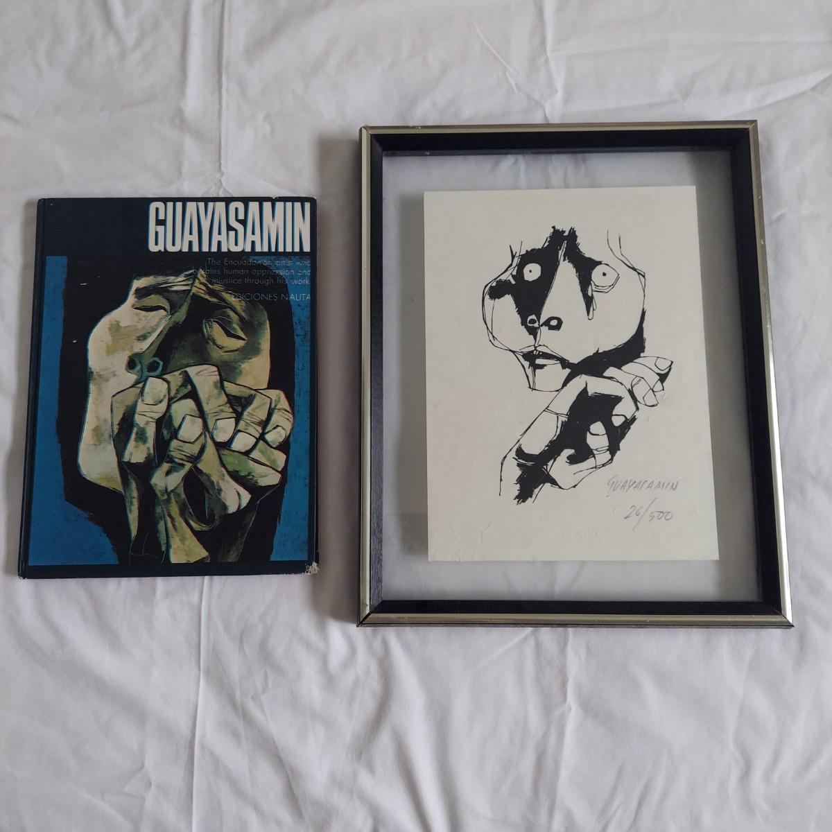 Lot includes a piece of art that appears to be a pencil signed and numbered print by artist Oswaldo Guayasamin. Piece is framed under glass in a floating, mat-free style. Wooden frame measures 13” x 16"H. Also includes a hardback coffee table book about Guayasamin's art. Please see photos for details. Shipping available