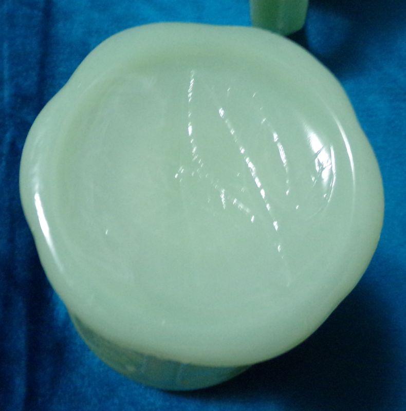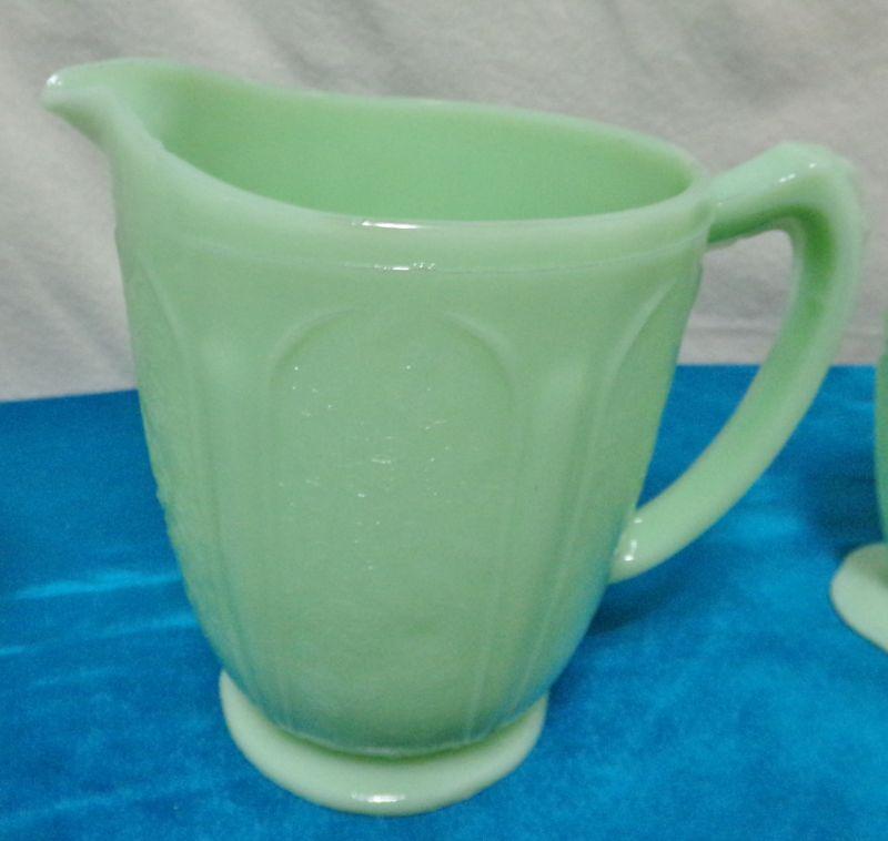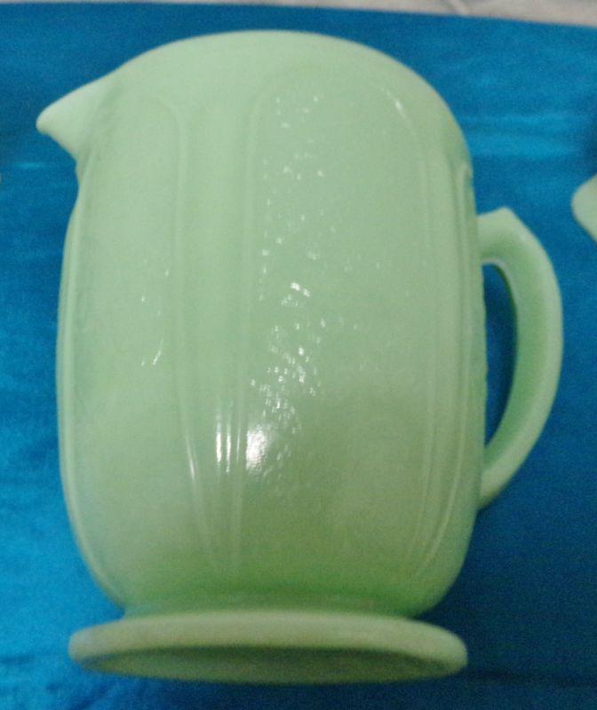 JADEITE PITCHER WITH BEAUTIFUL PATTERN IN VG CONDITION MEASURES 6" X 7"