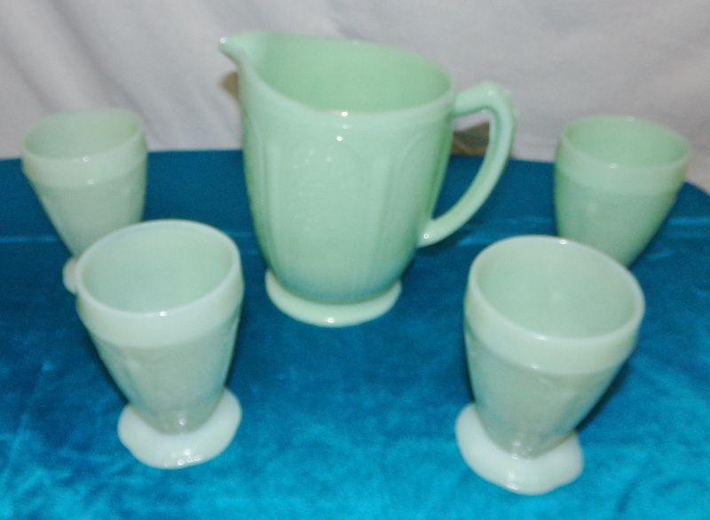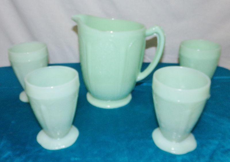 OT 143 VINTAGE JADEITE JADITE PITCHER AND 4 CUPS