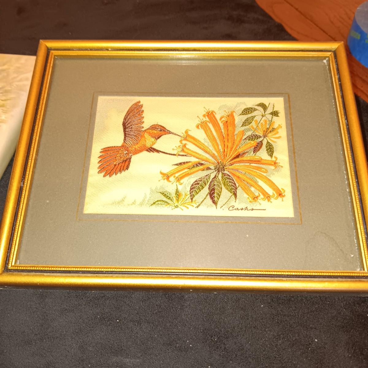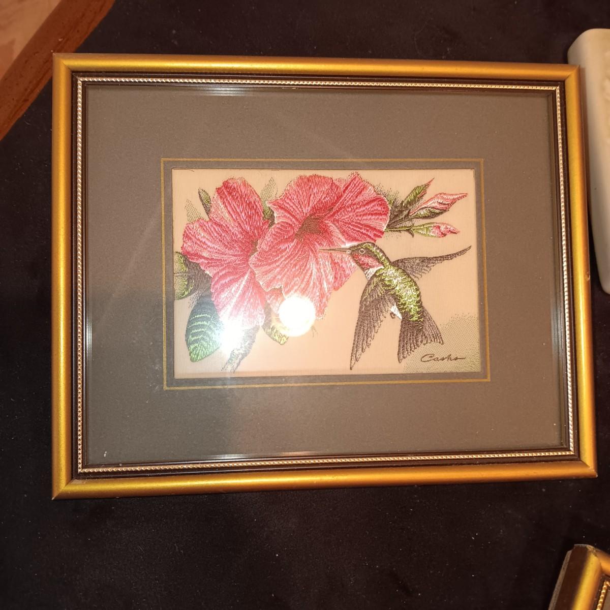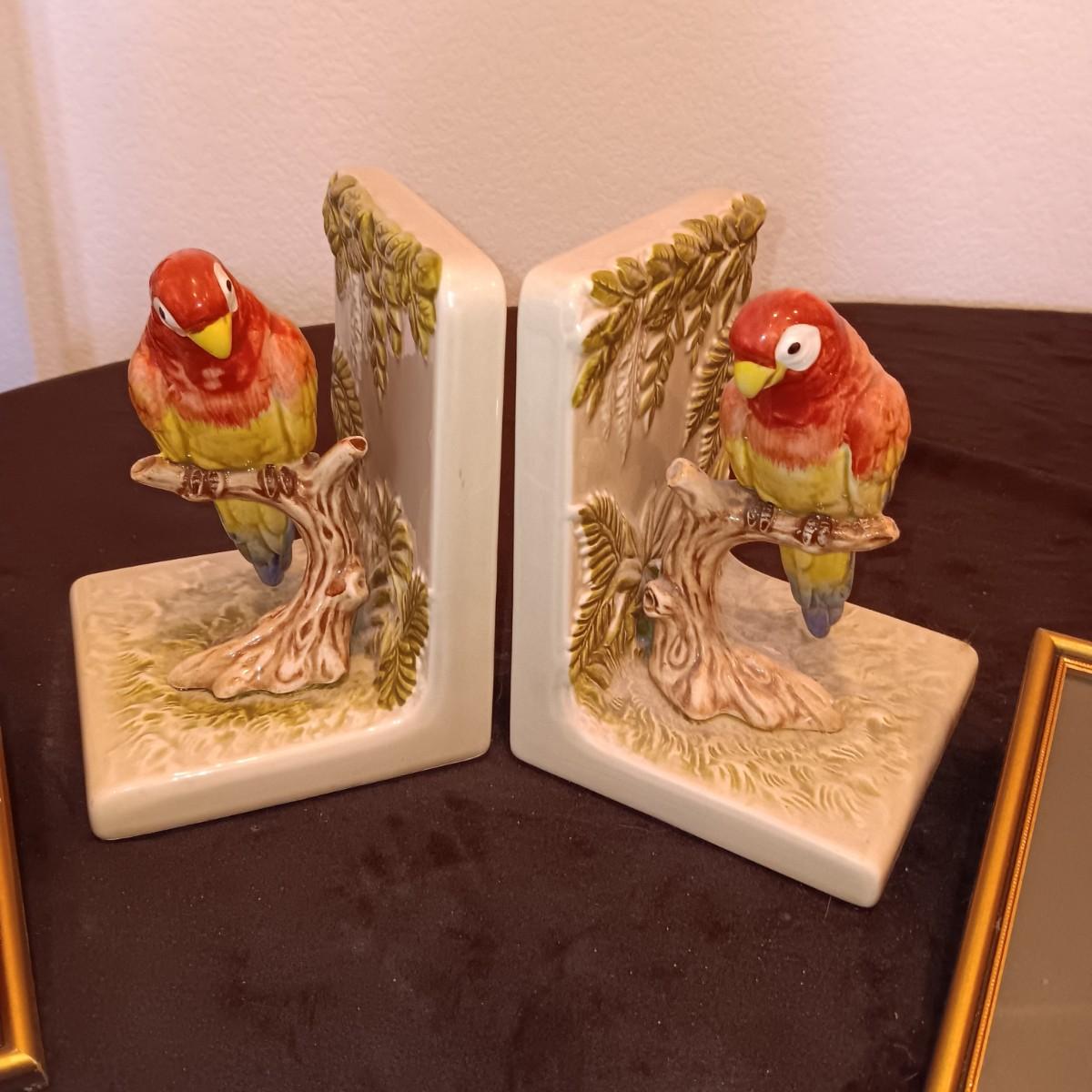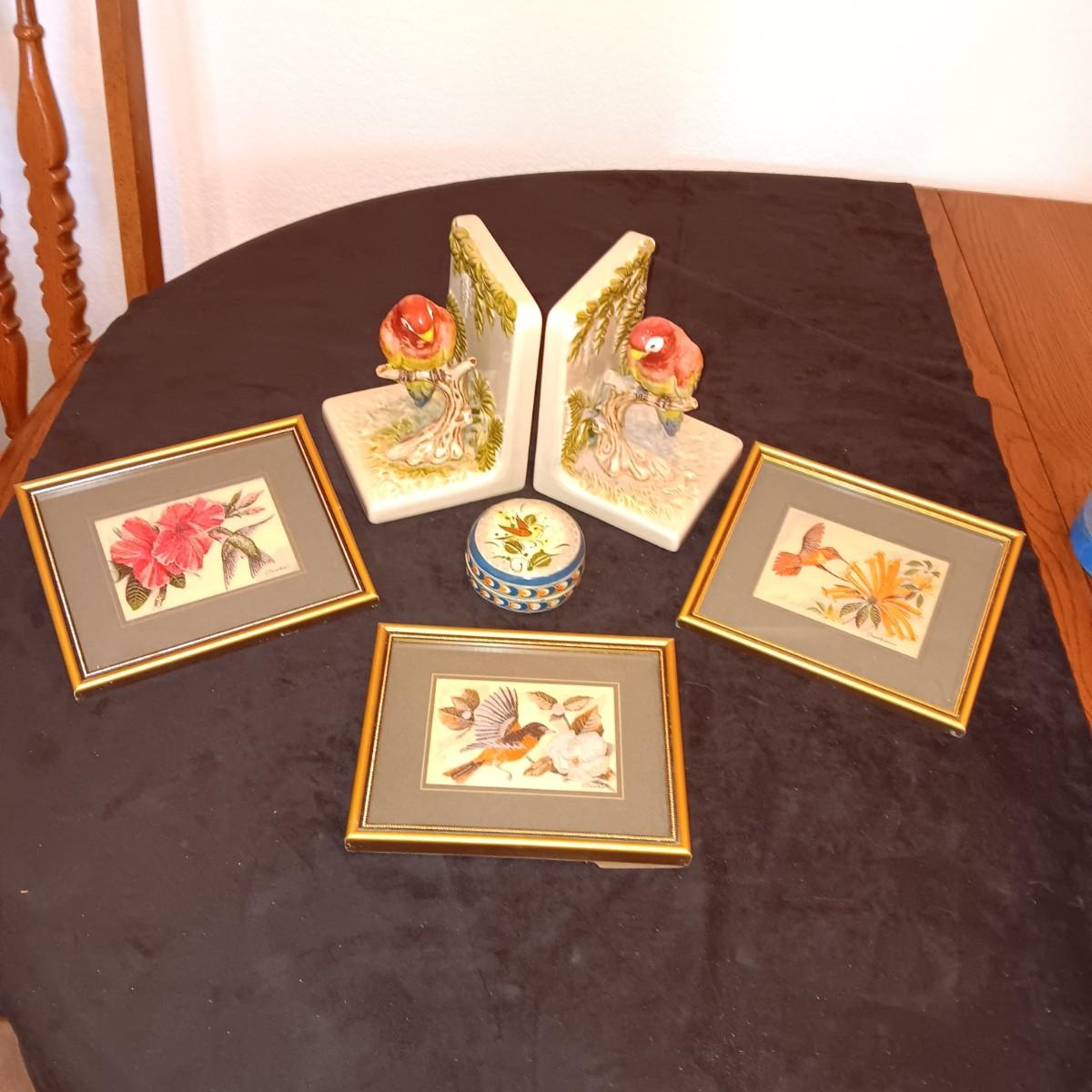 OTAGIRI PARROT BOOKENDS, 3 TAPESTRY CLOTH HUMMINGBIRD PICTURES AND A TRINKET BOX