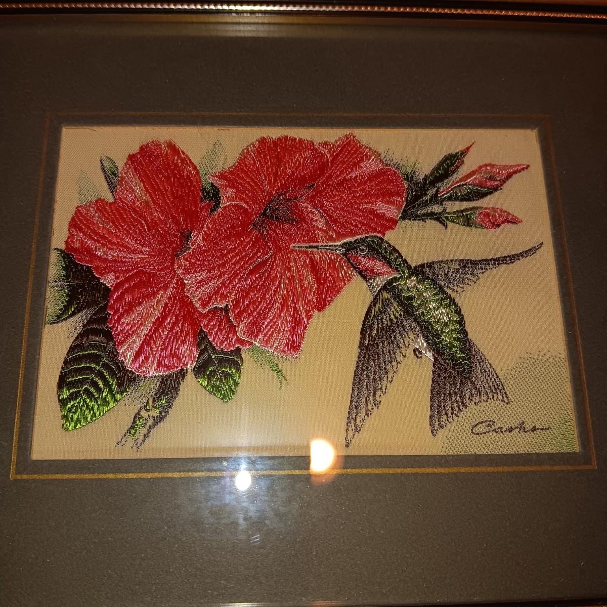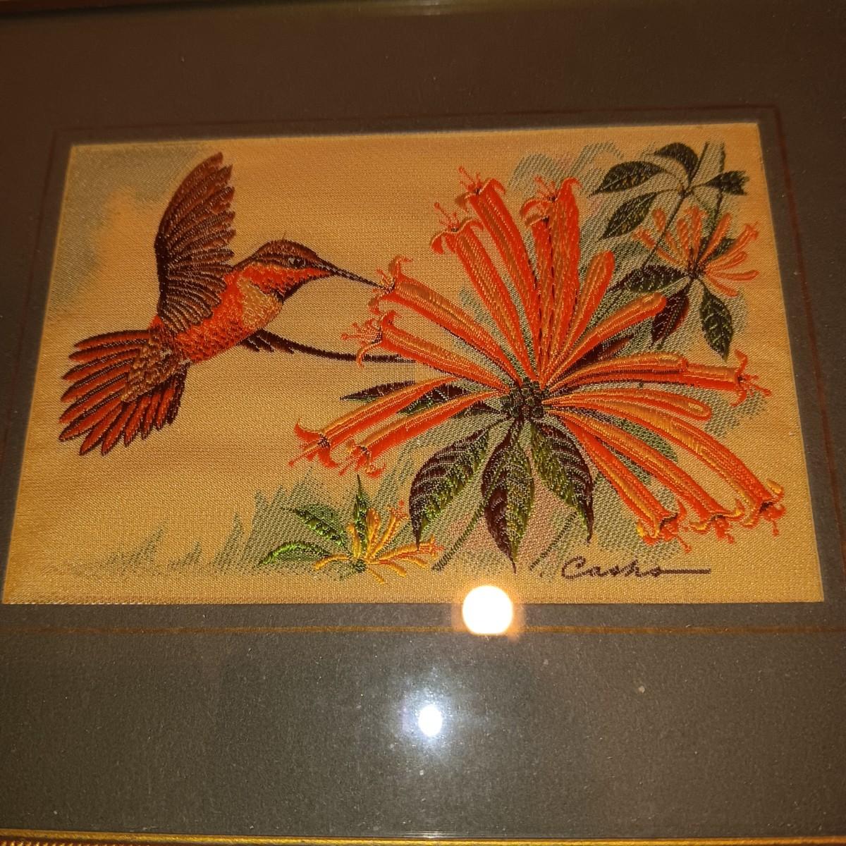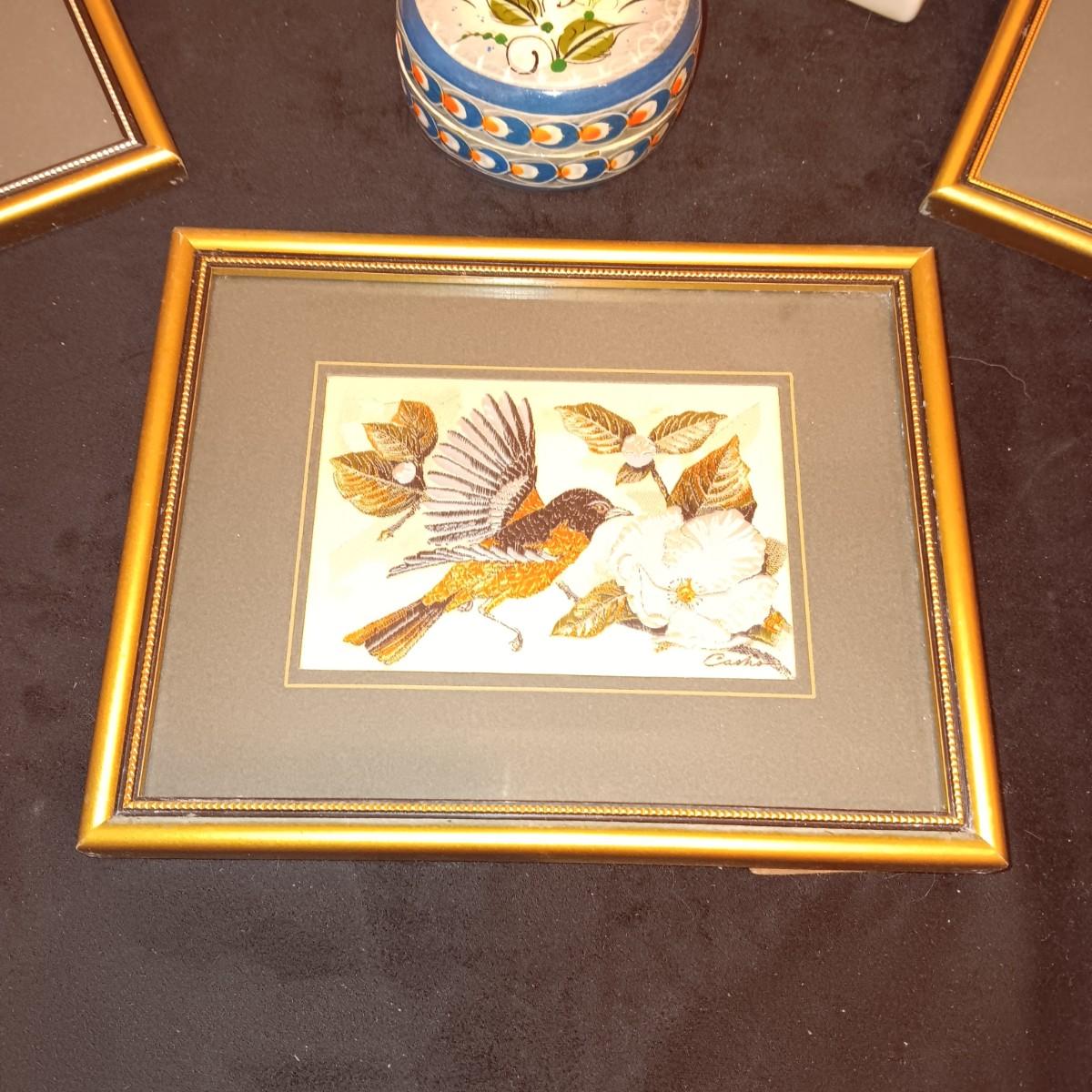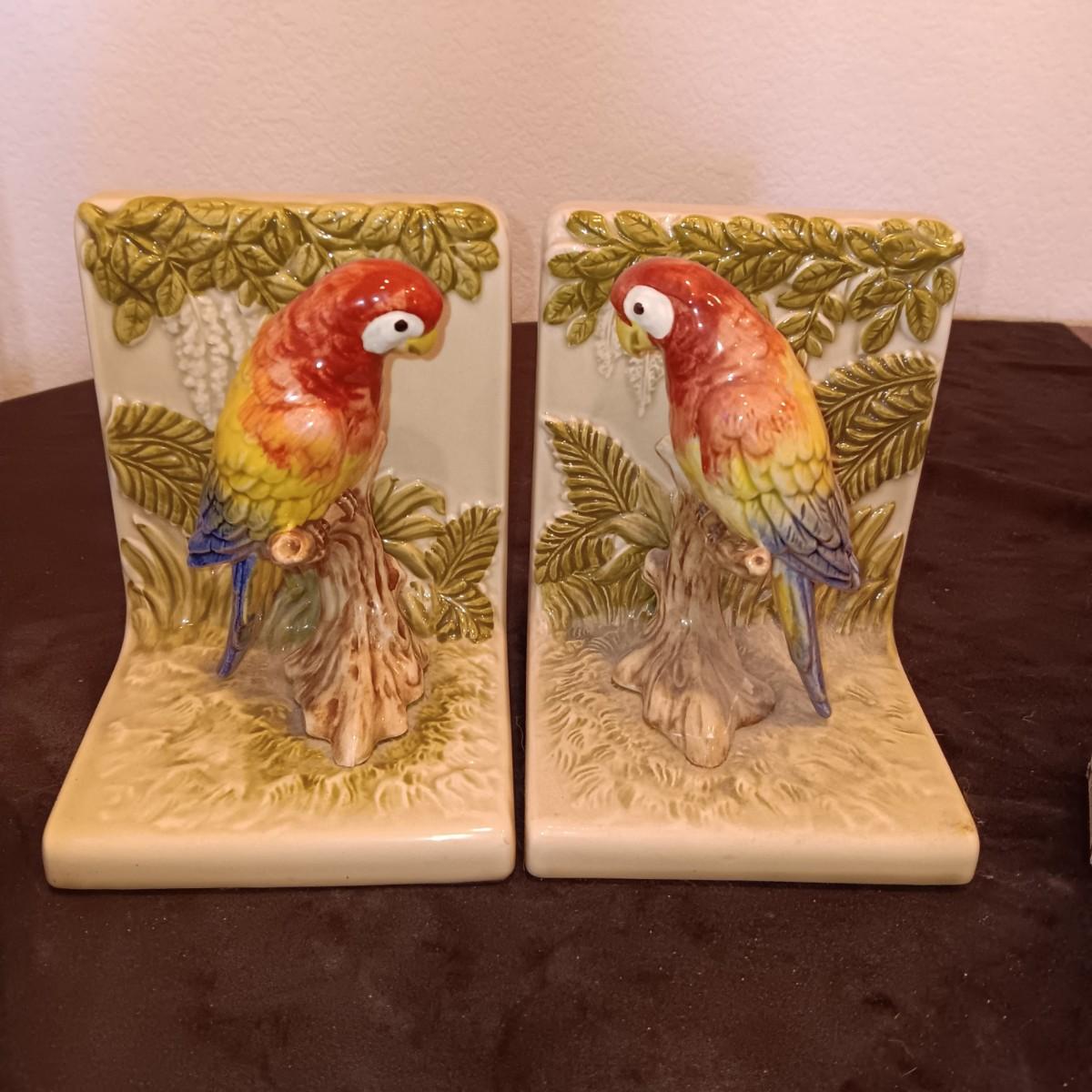 OTAGIRI PARROT BOOKENDS, 3 TAPESTRY CLOTH HUMMINGBIRD PICTURES AND A TRINKET BOX