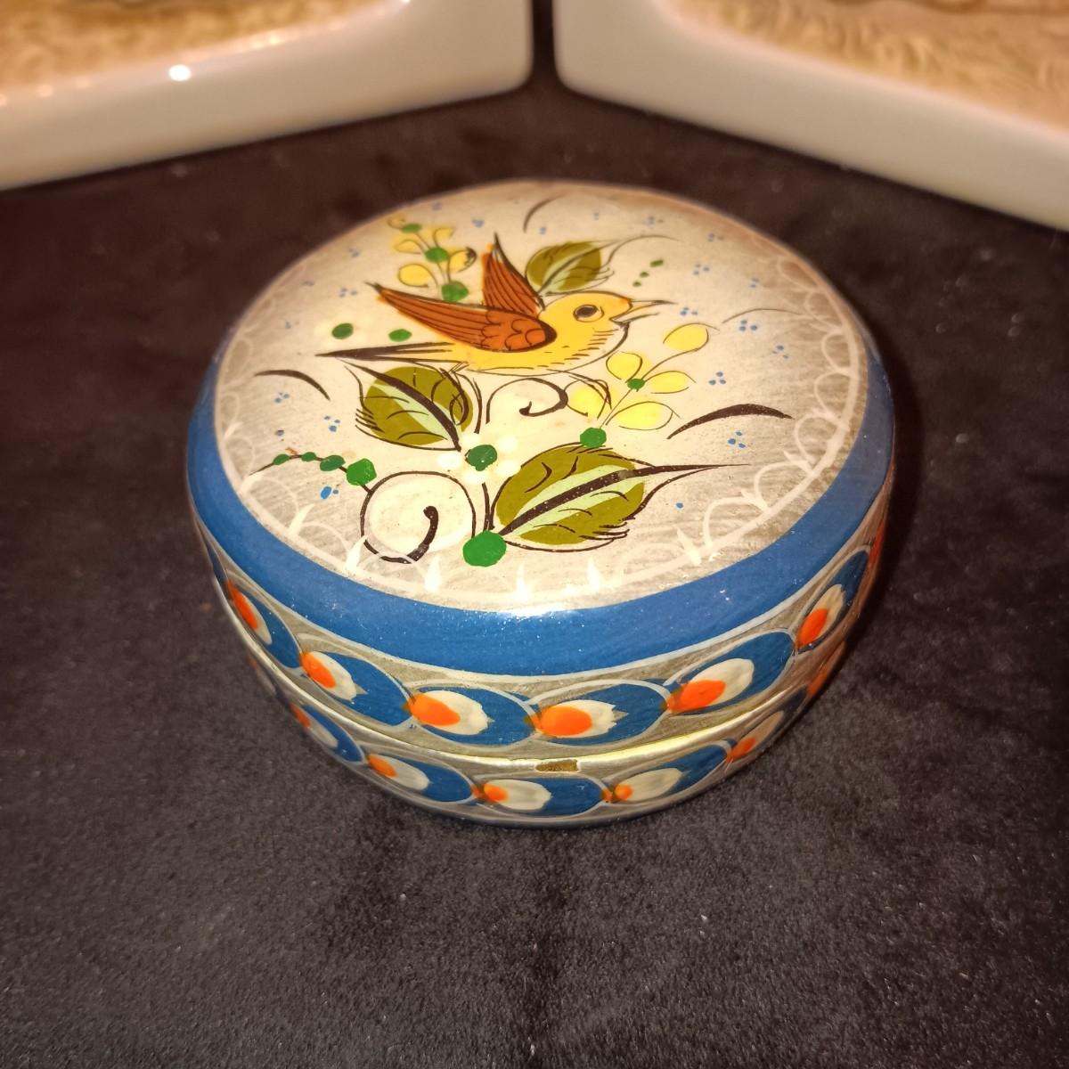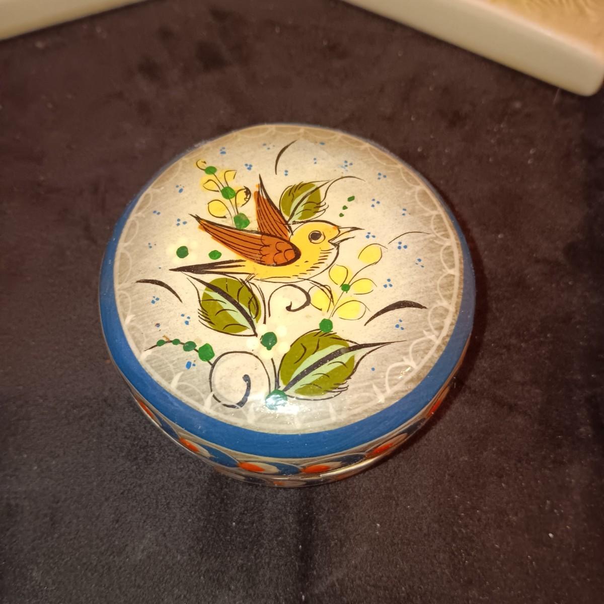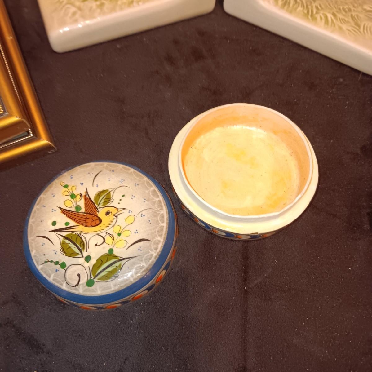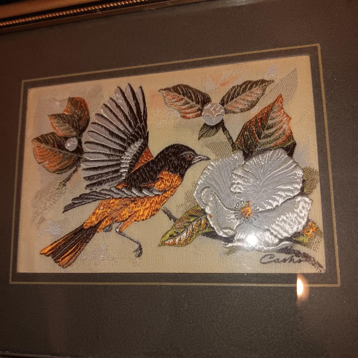 OTAGIRI PARROT BOOKENDS, 3 TAPESTRY CLOTH HUMMINGBIRD PICTURES AND A TRINKET BOX