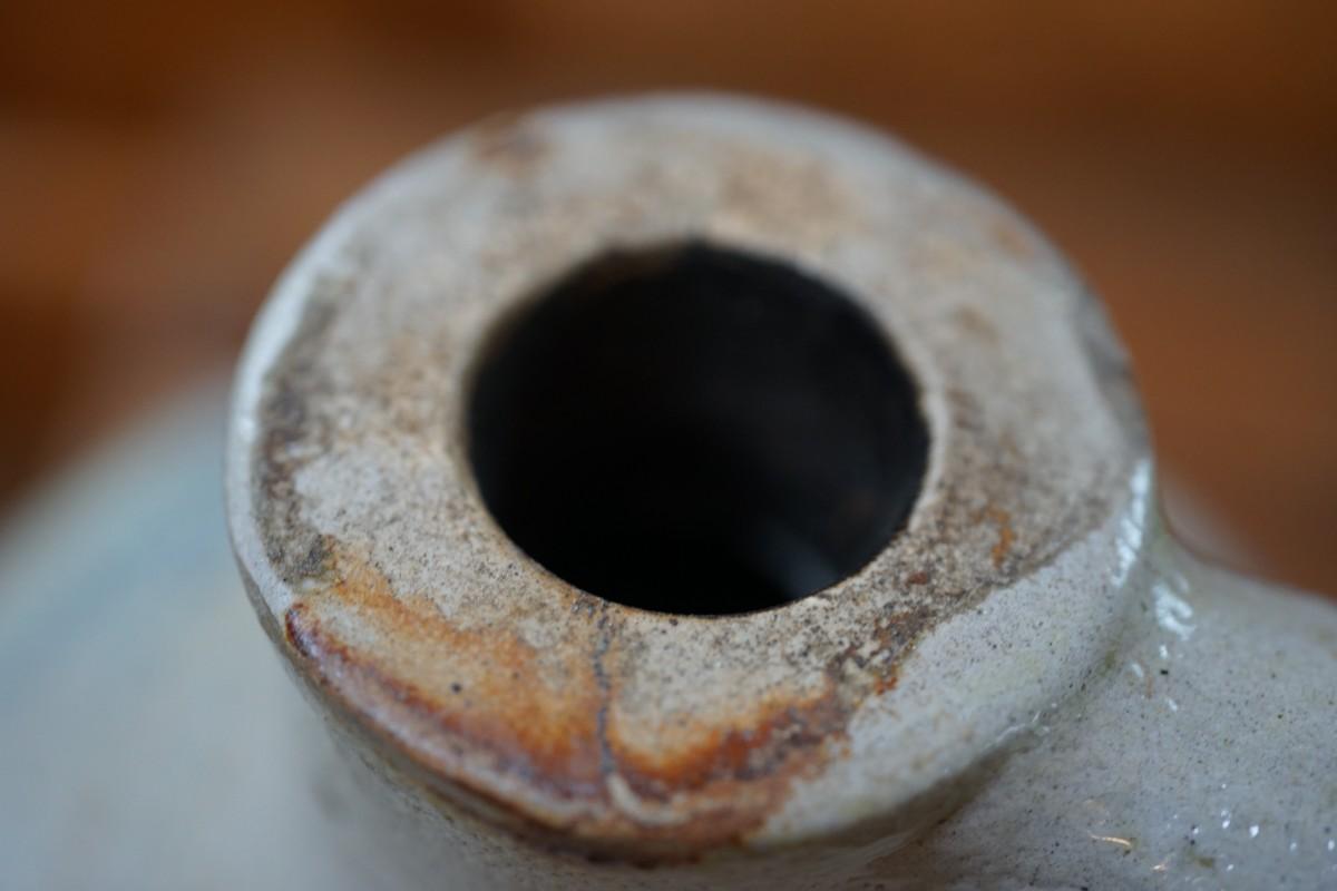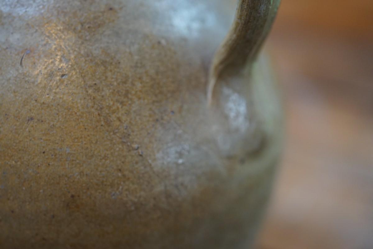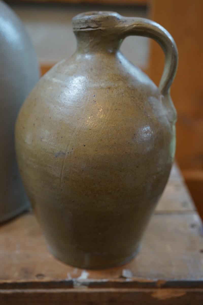 the smaller brown unmarked ovoid jug is about 9" in height. Good condition. No chips or cracks noted.