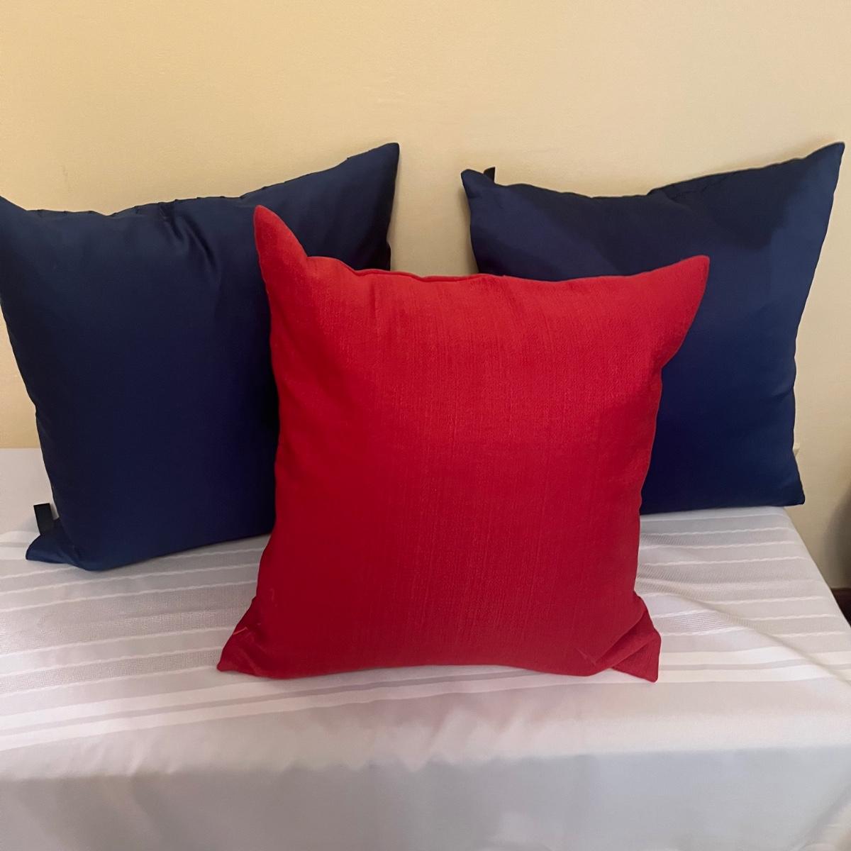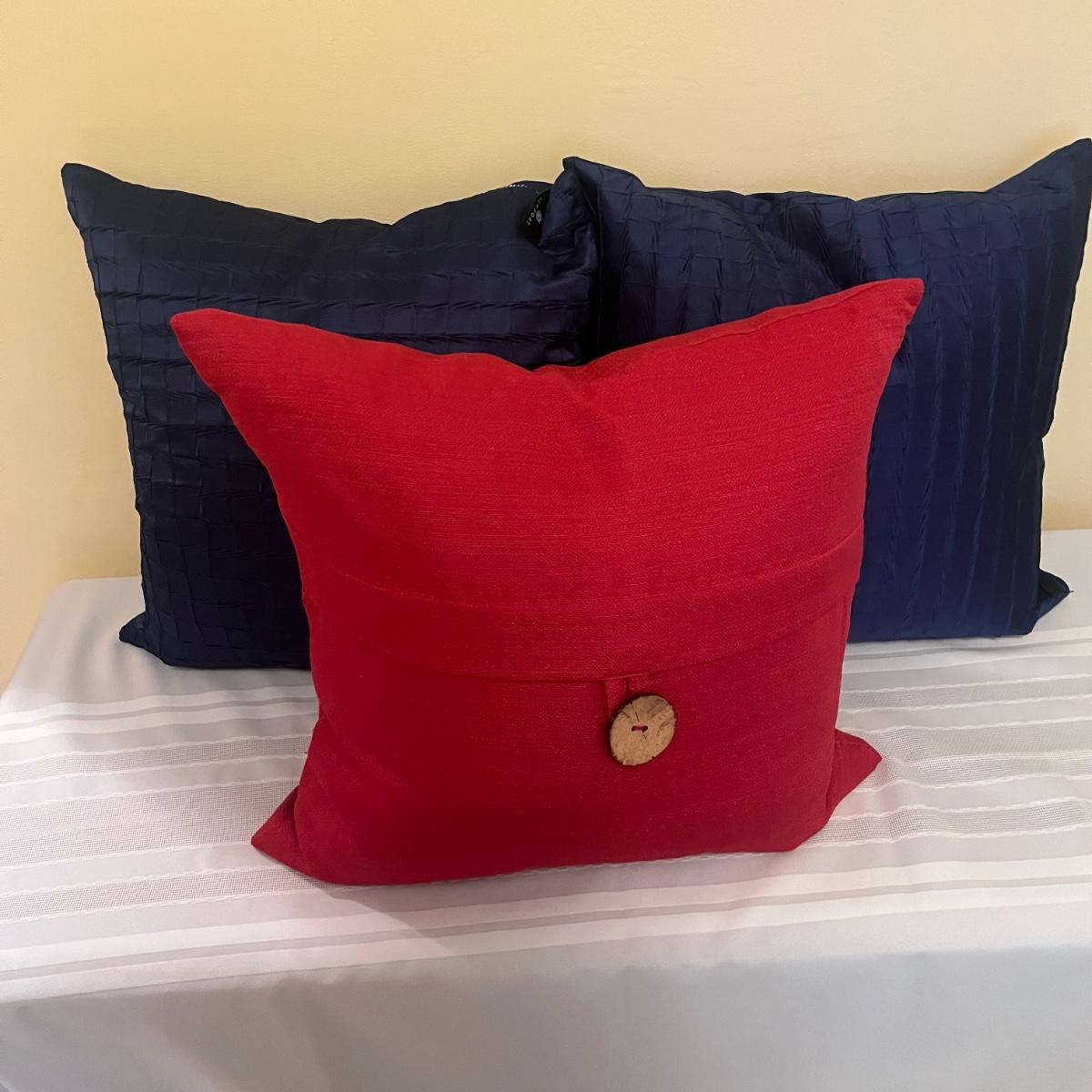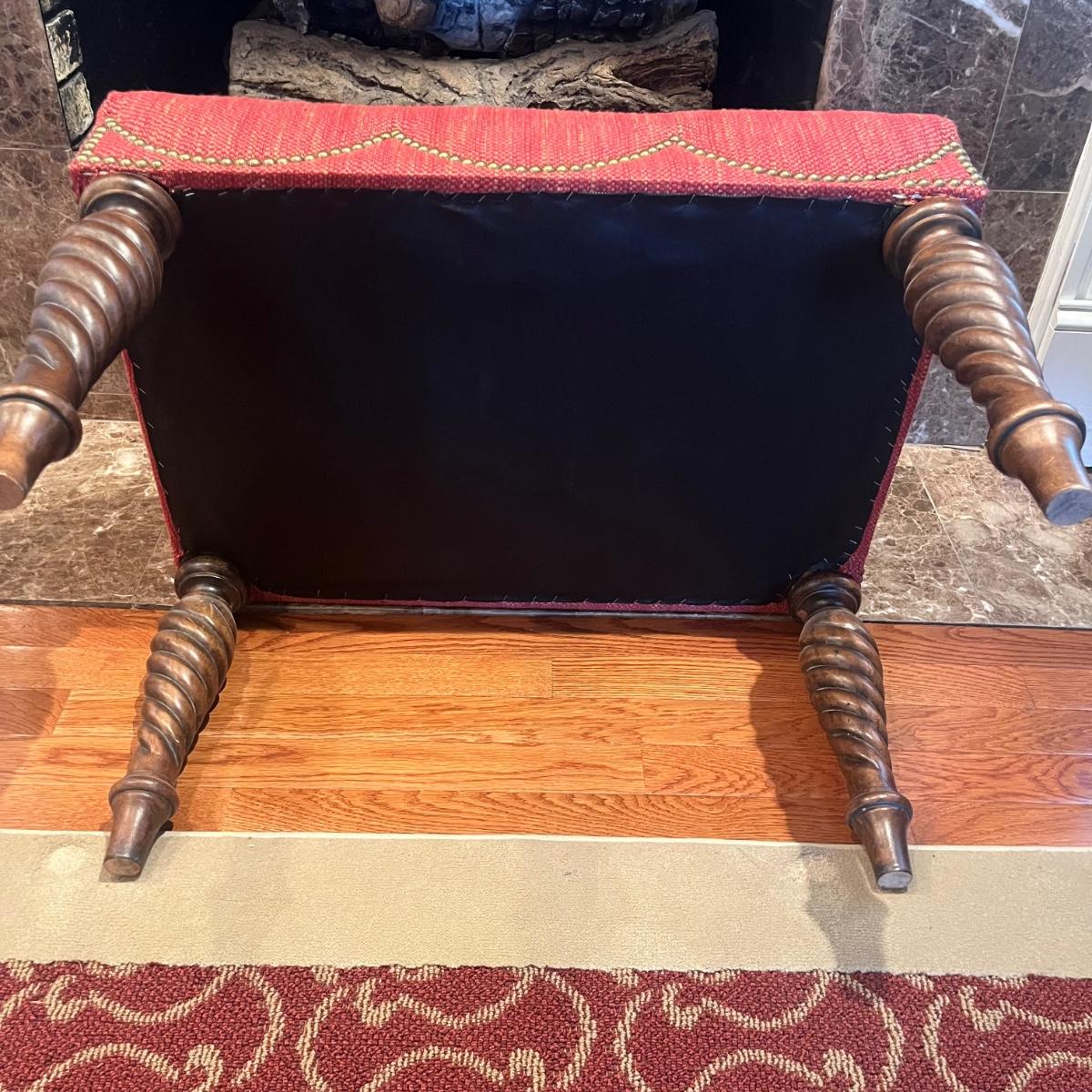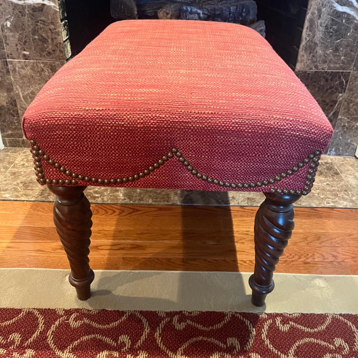 Lot includes three 18” x 18” accent pillows and a wooden framed ottoman with padded and upholstered seat and brass tacks on the side. Ottoman measures 20” x 28” x 20”.