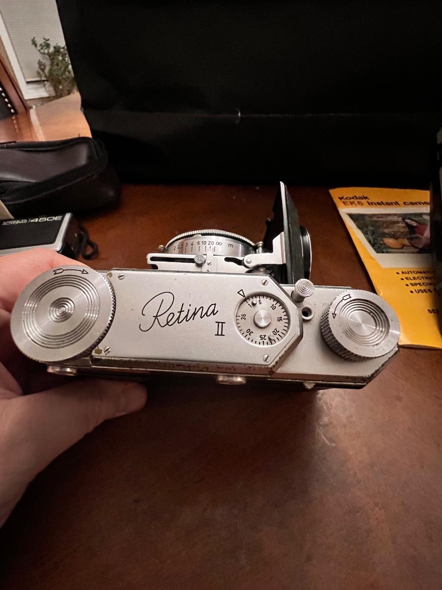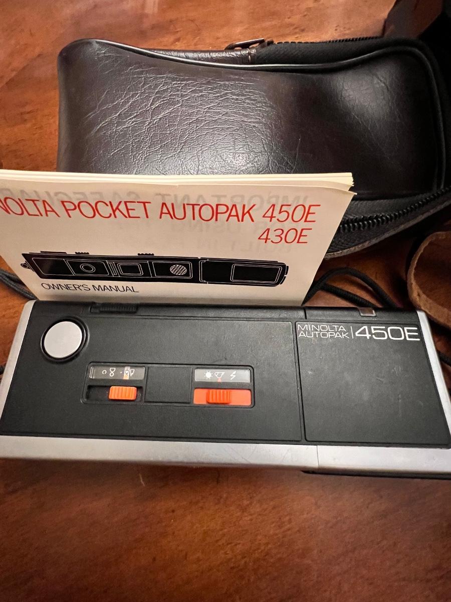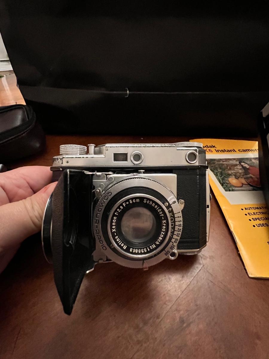 VINTAGE Kodak Retina II from Germany. My dad bought it while he was in Berlin during the war. It’s in great condition! So cool. Then Kodak instant camera. Still with box and manual. Then Minolta 450 E with manual and carrying case.