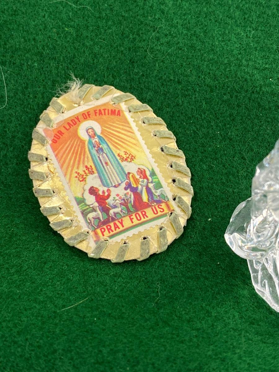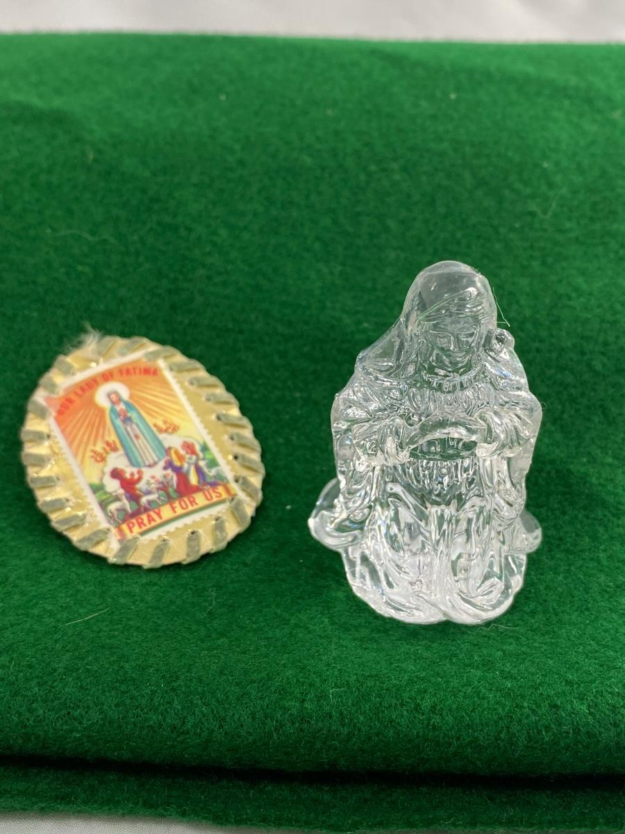 Our Lady of Fatima Prayer Medallion & Clear Virgin Mary Figurine