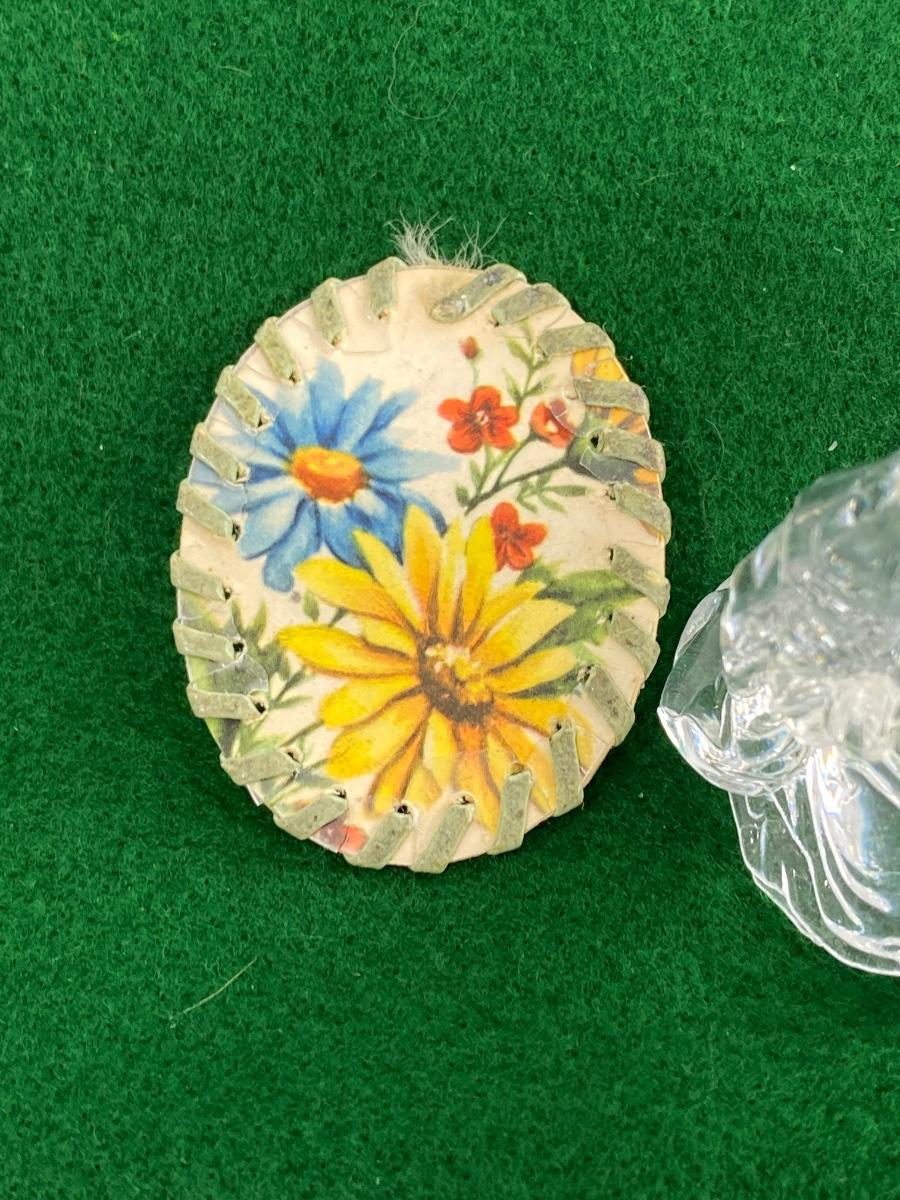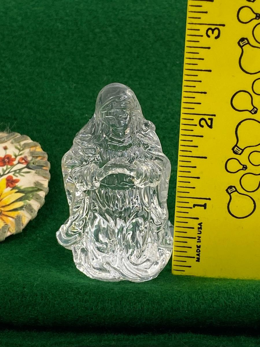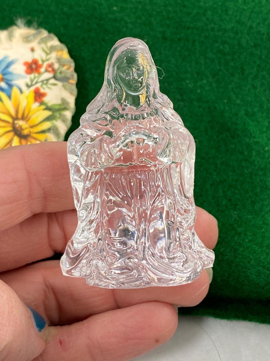 Our Lady of Fatima Prayer Medallion & Clear Virgin Mary Figurine. Our Lady of Fatima medallion may have been on a necklace at one time, looks hand made on thick paper. Virgin Mary is a little over 2" size.