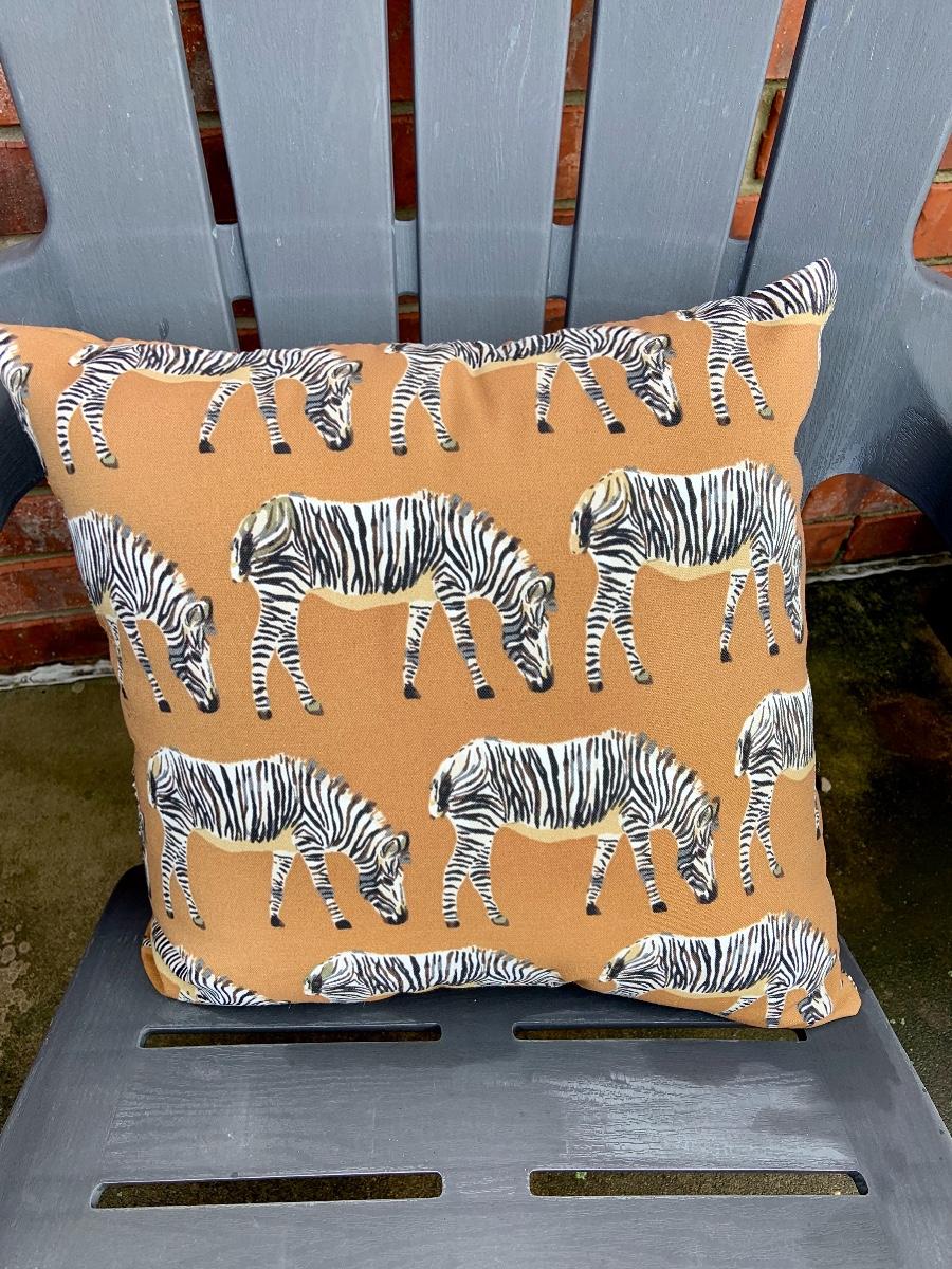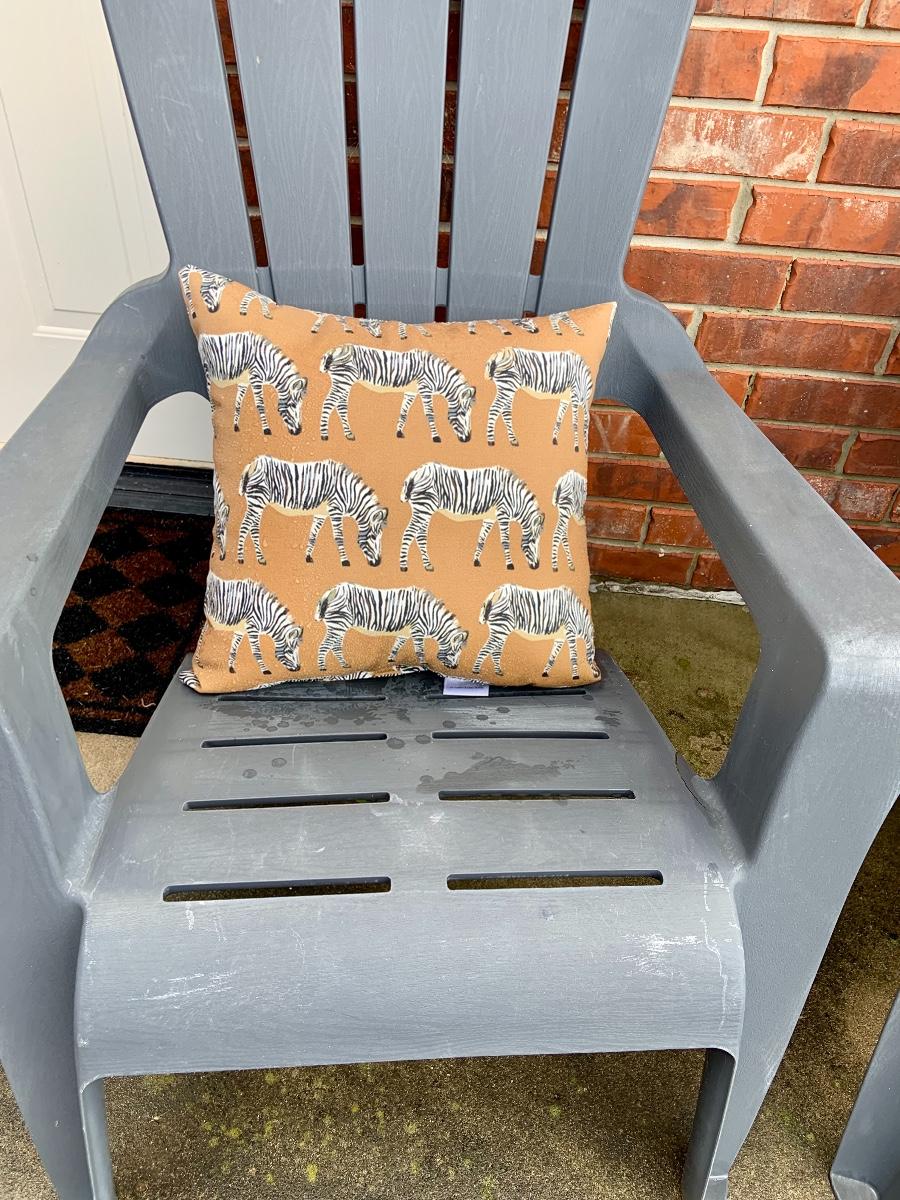 Pair of outdoor chairs with zebra pillows