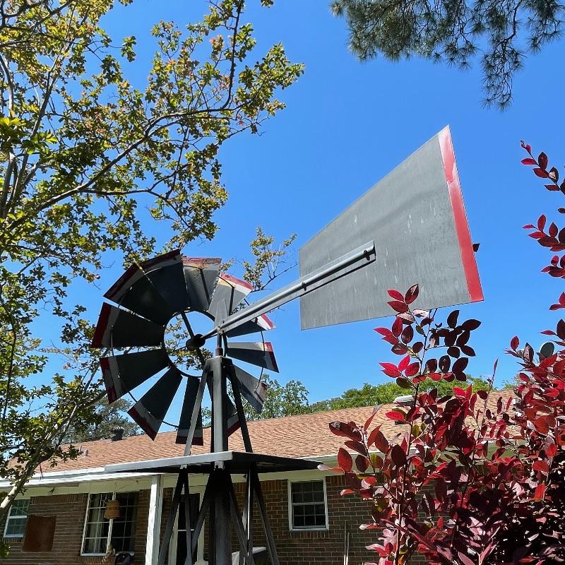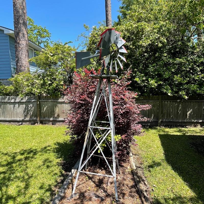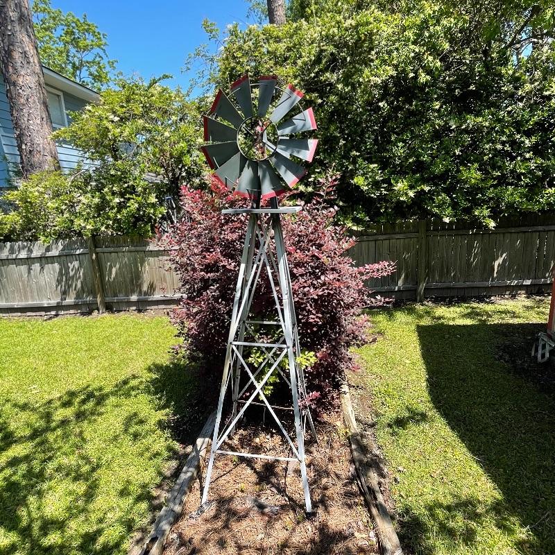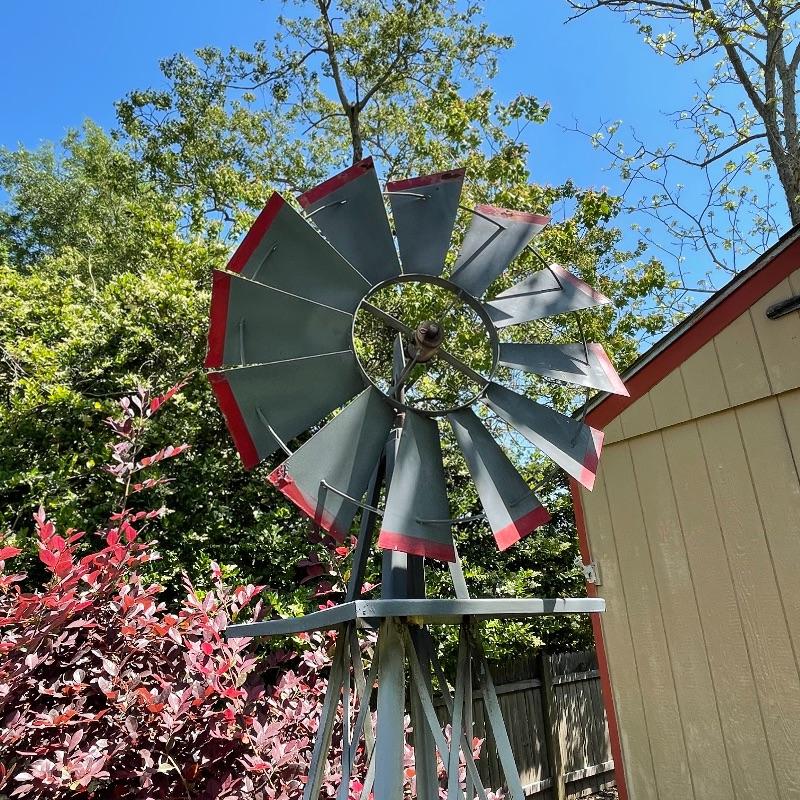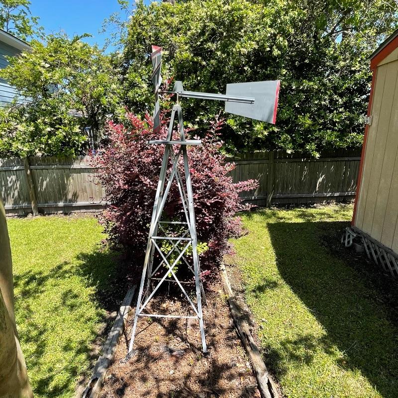 Gray with red trim on blades and tail. Minimum all surface rust. Bring a shovel to remove from dirt!