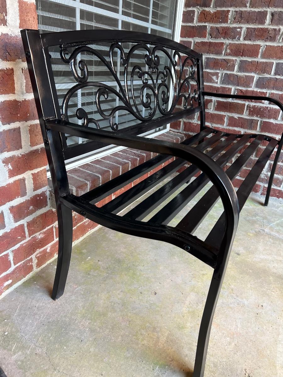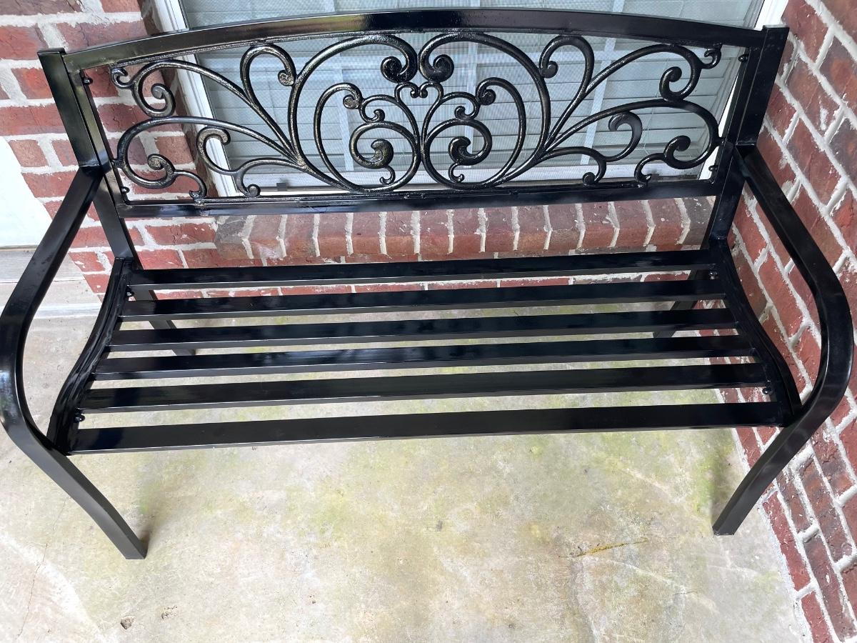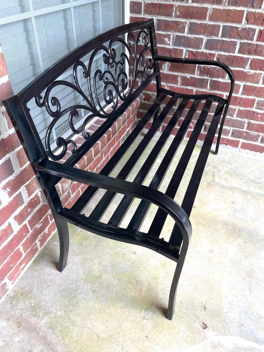 Black outdoor metal bench 34 inches tall, 50 1/2 inches wide and 21 inches deep.