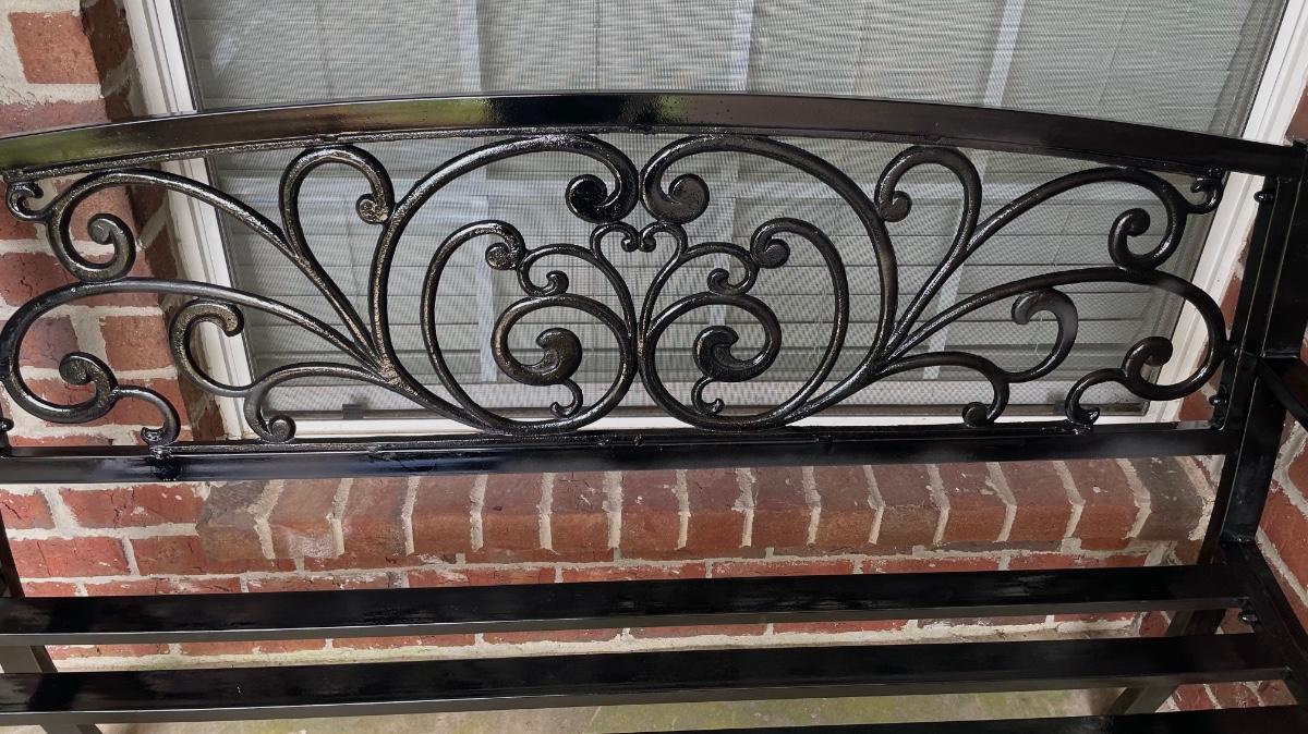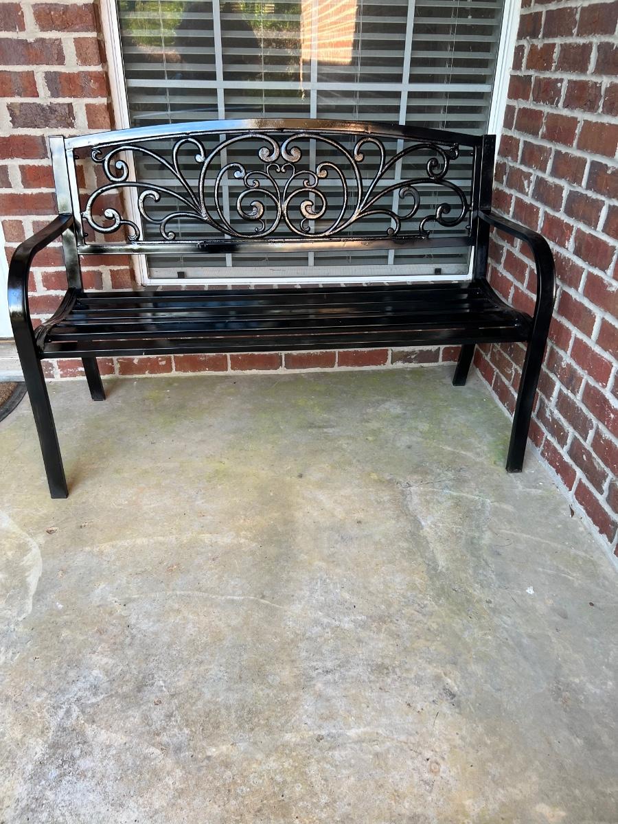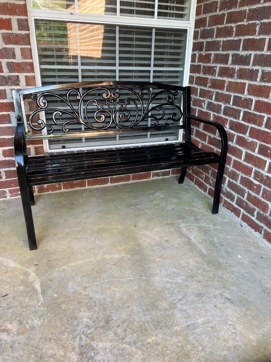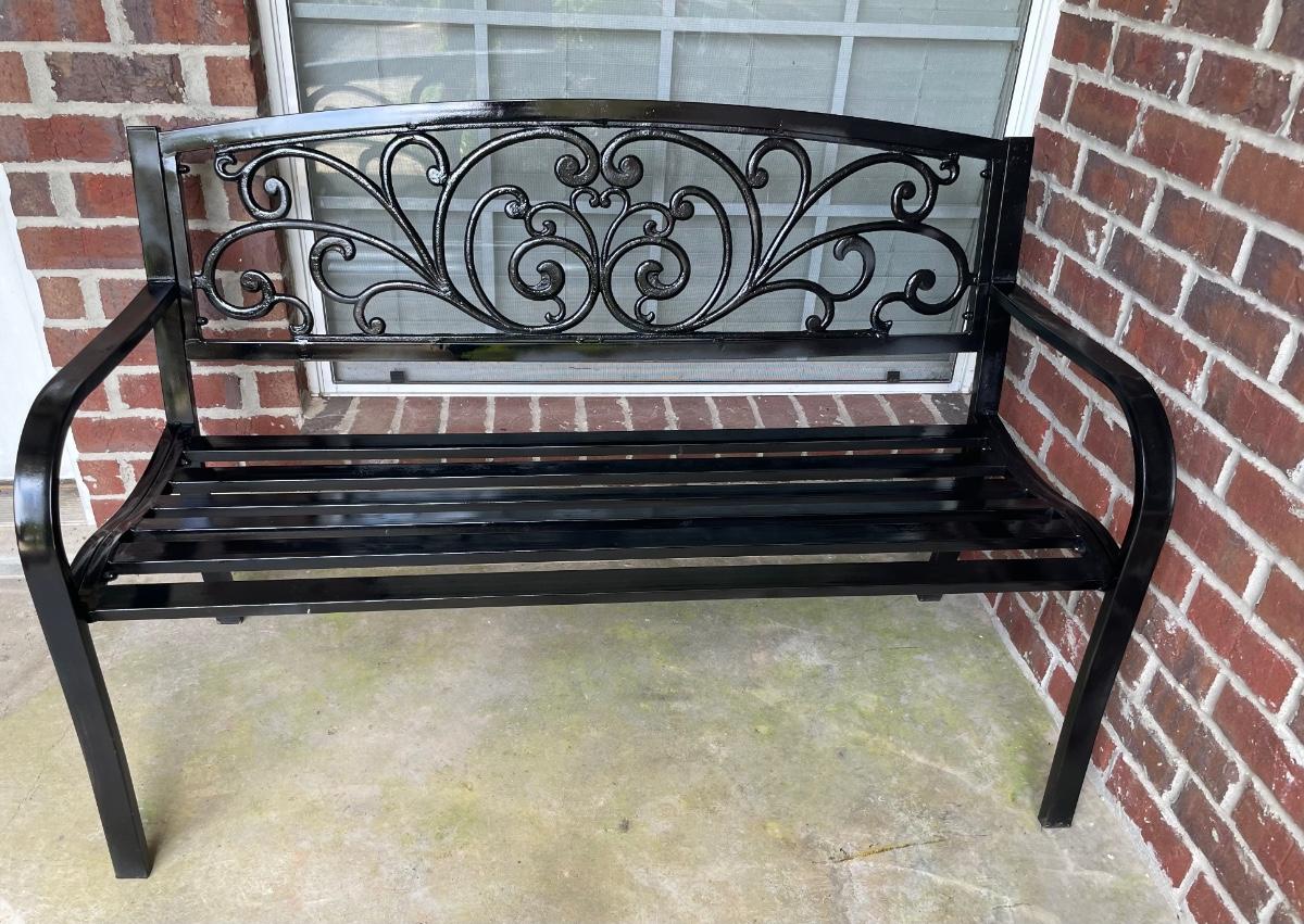 Black outdoor metal bench 34 inches tall, 50 1/2 inches wide and 21 inches deep.