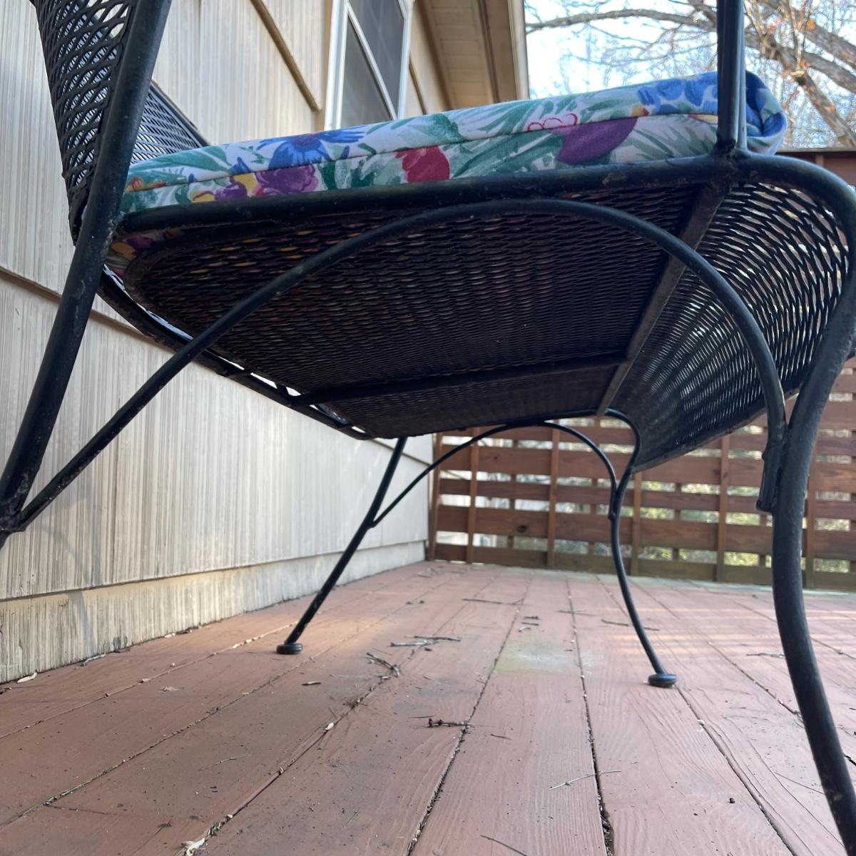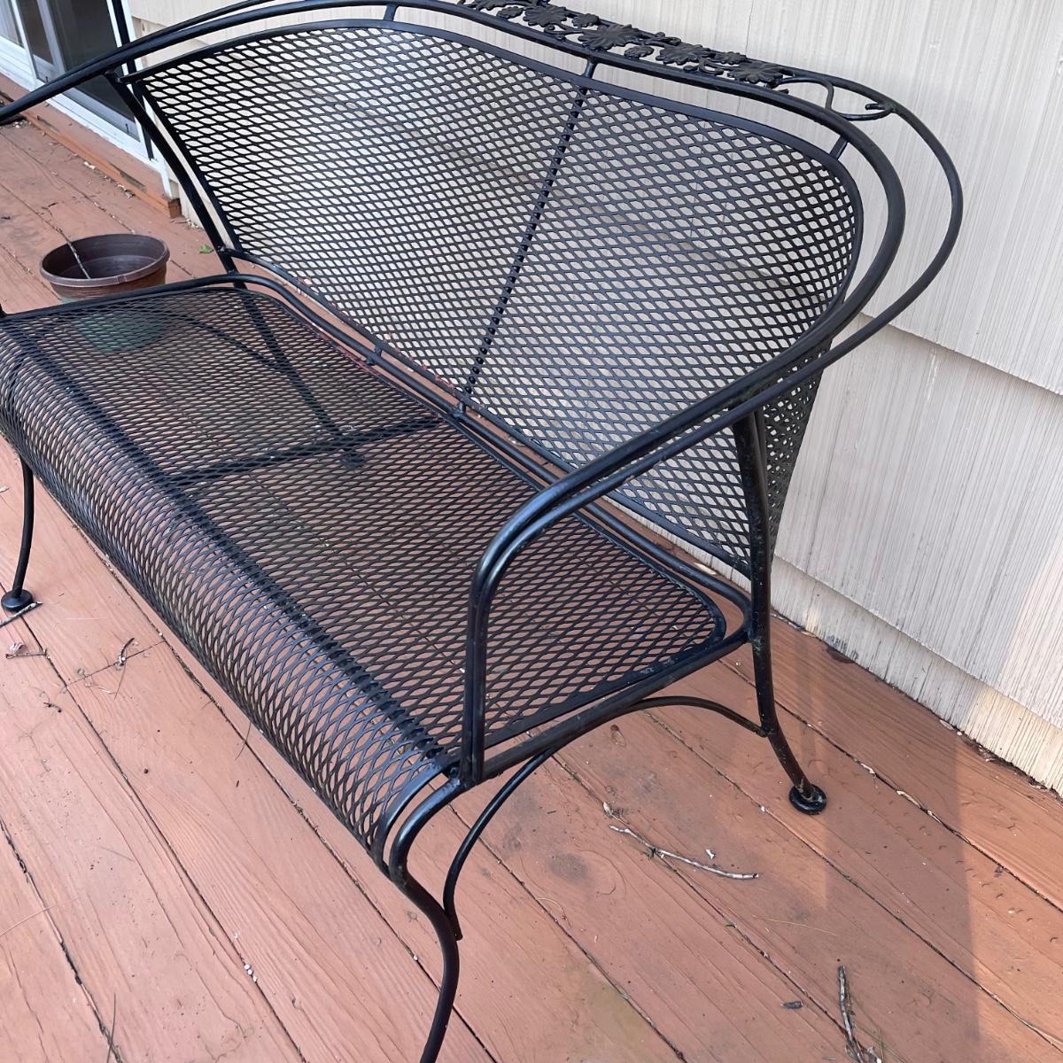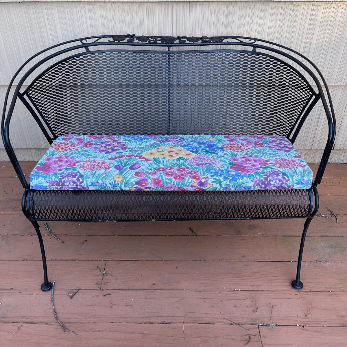 This metal outdoor bench measures 45” wide, 32.5” deep, and 30” tall. It has a colorful bench cushion. It’s matching pieces are also in the sale, two chairs and three nesting tables.
