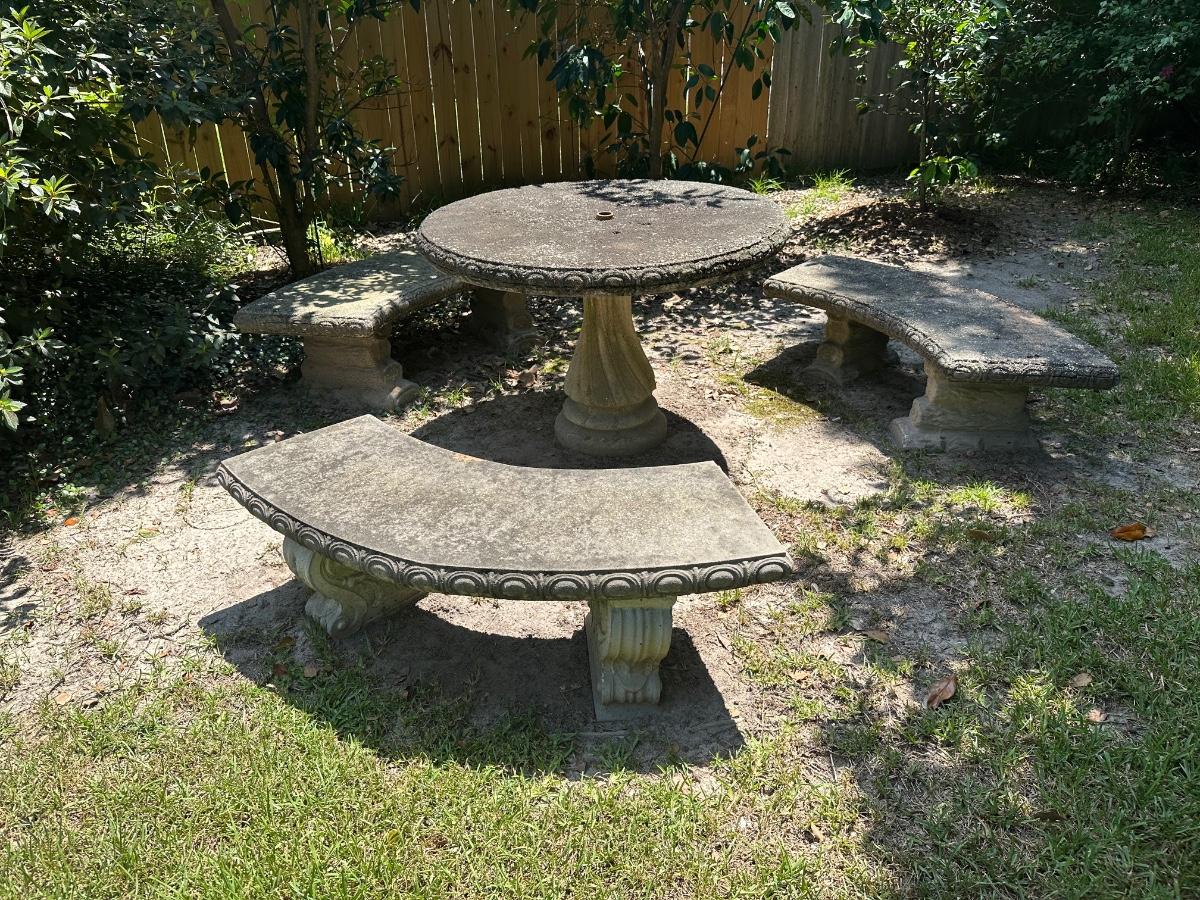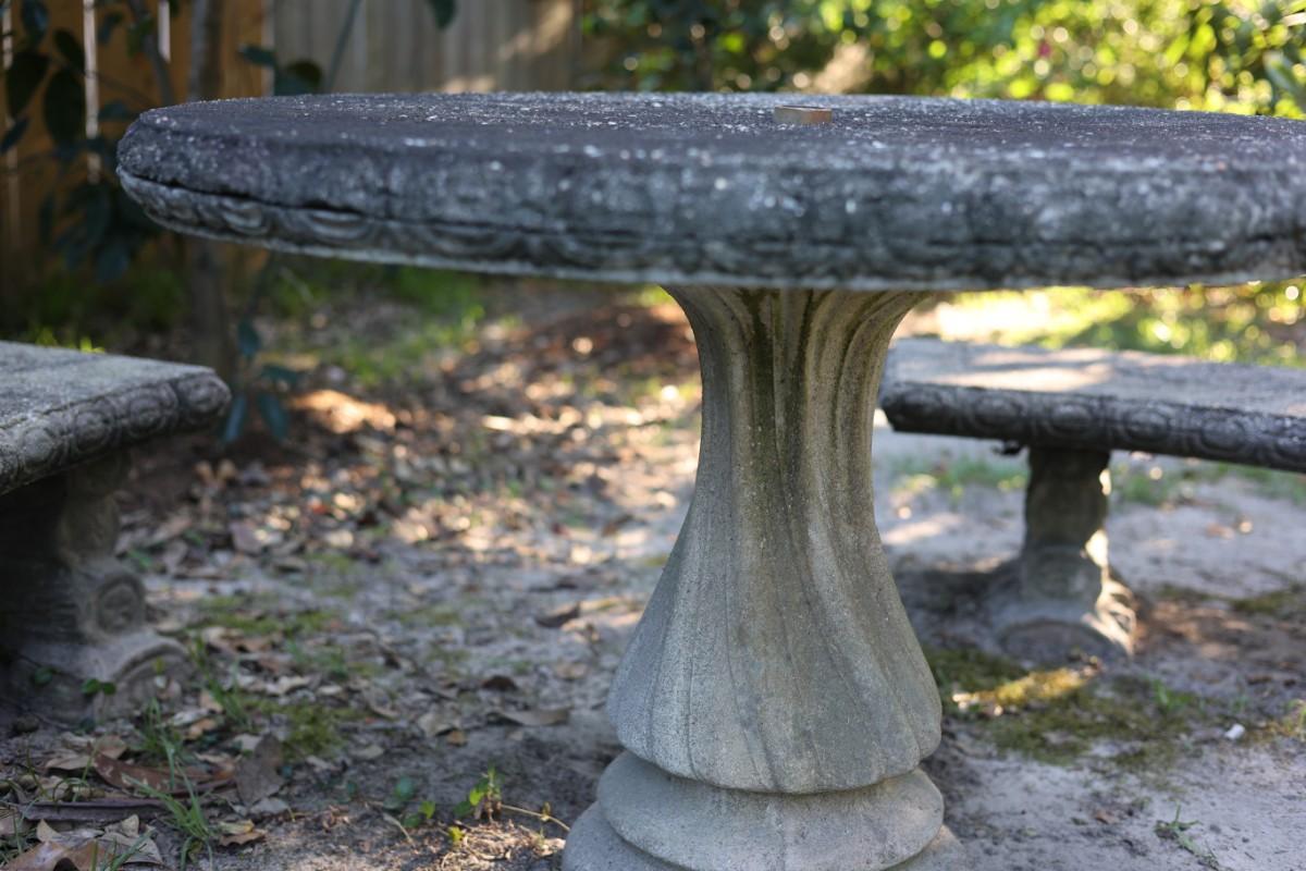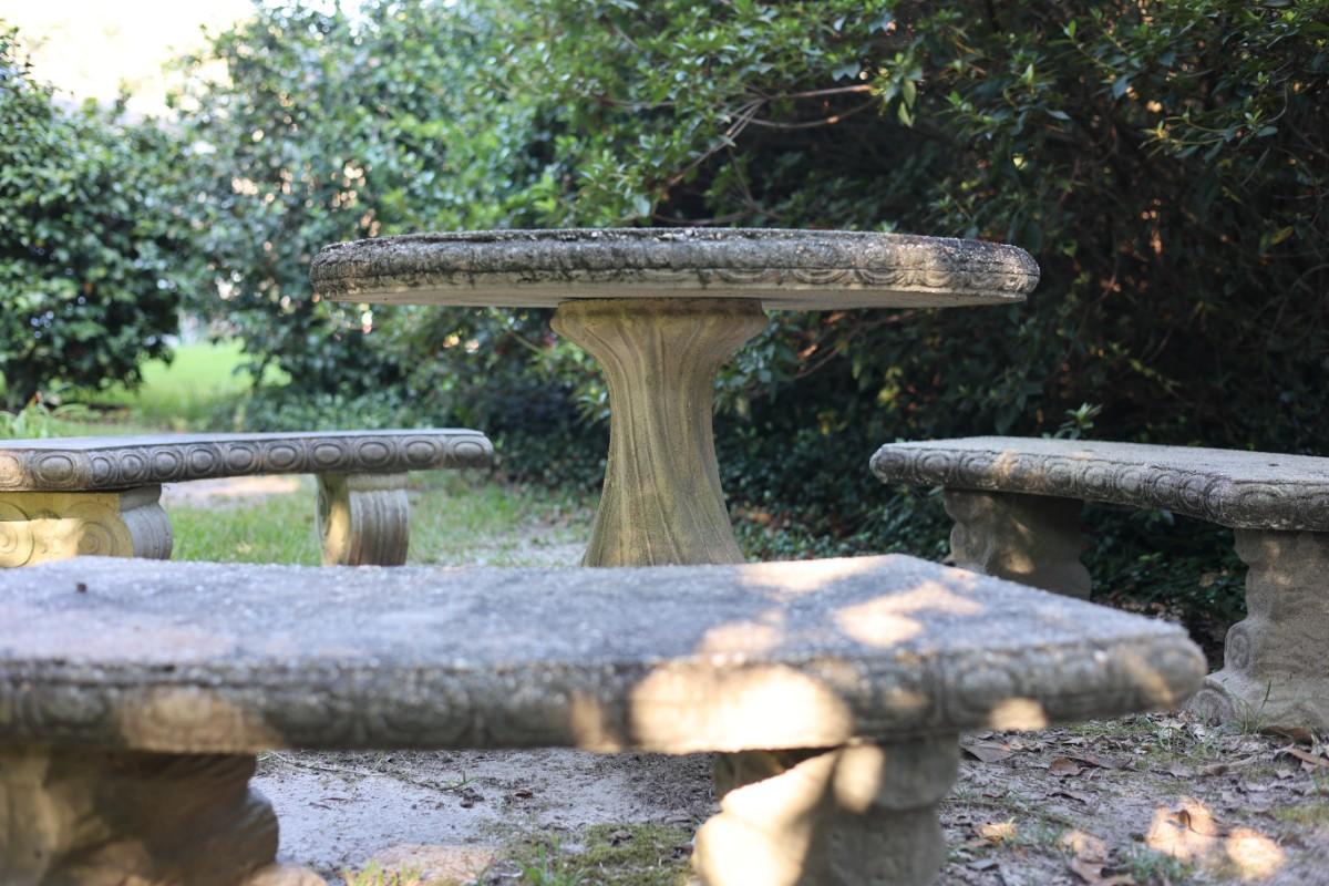 Outdoor cement table with three bench seats