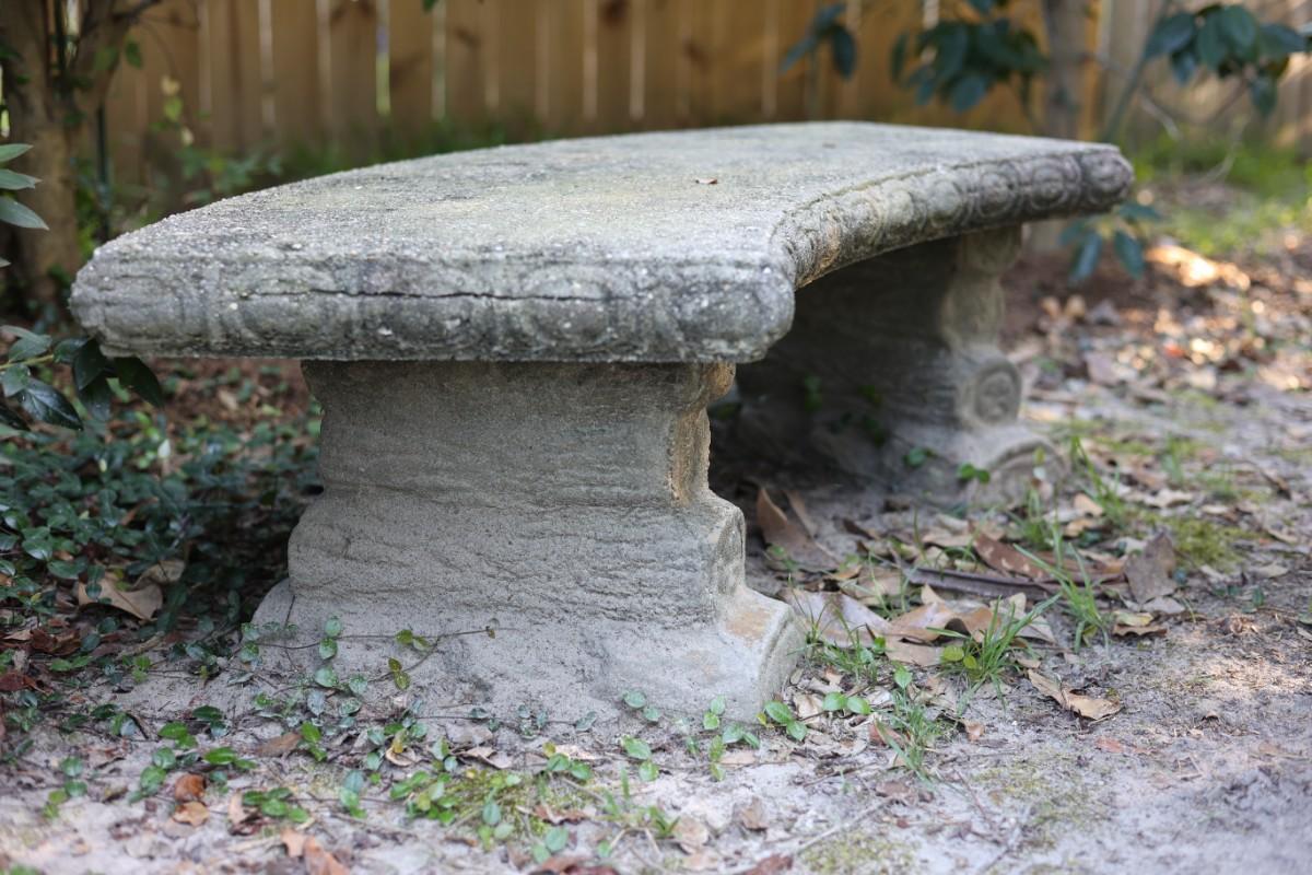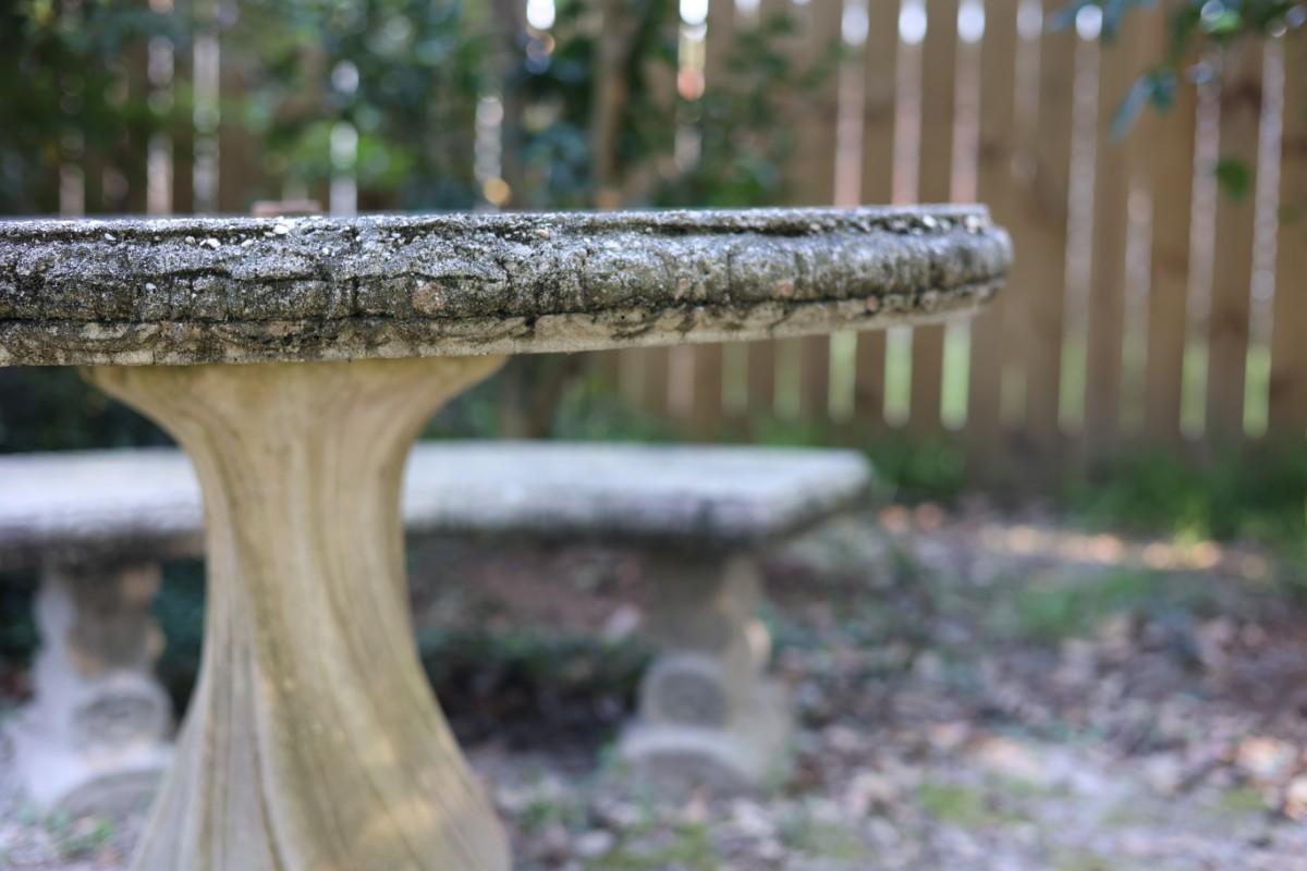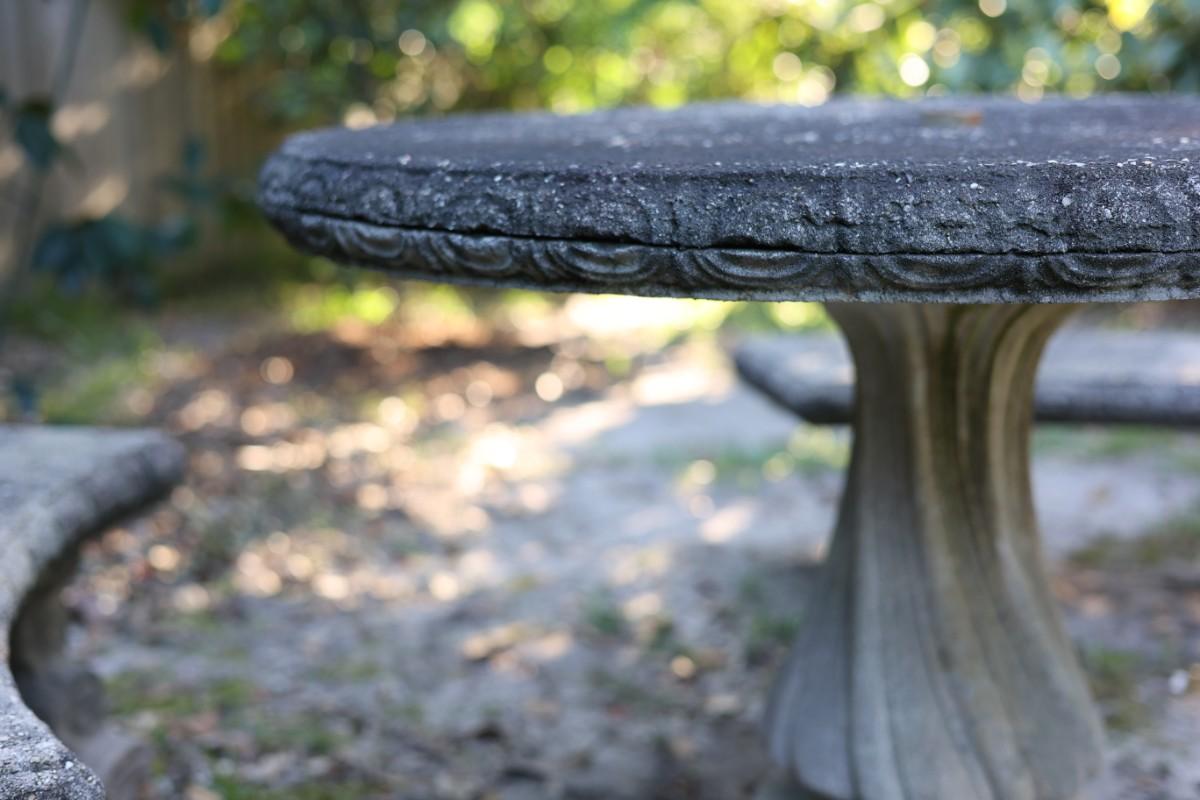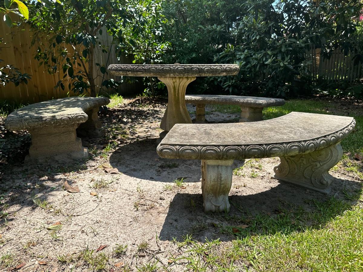 Outdoor cement table with three bench seats
